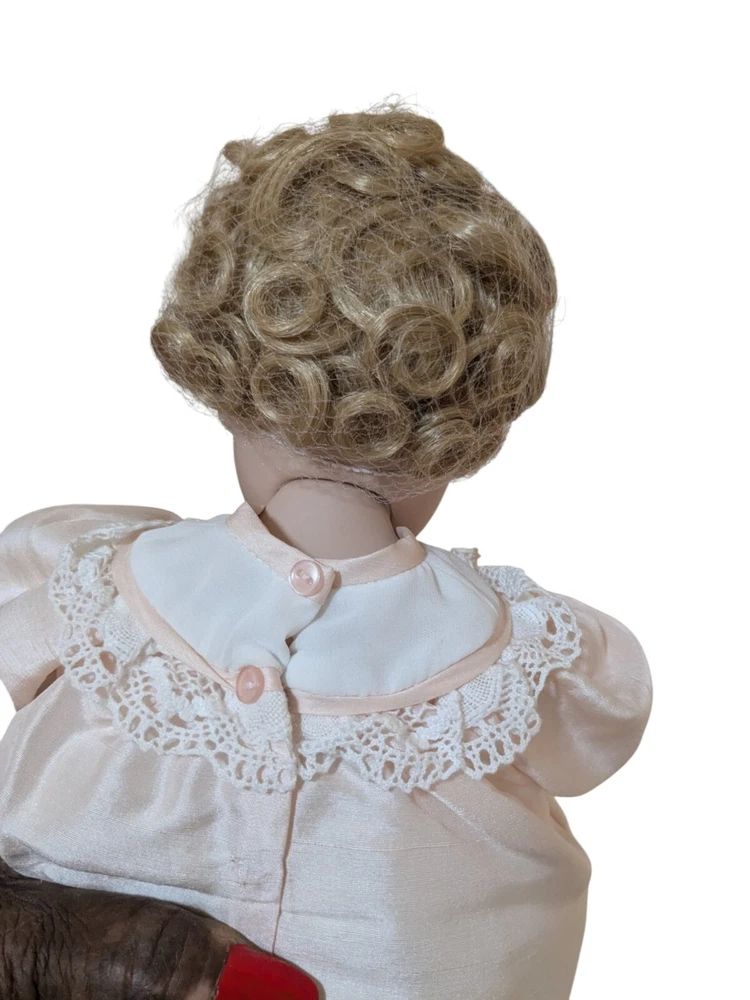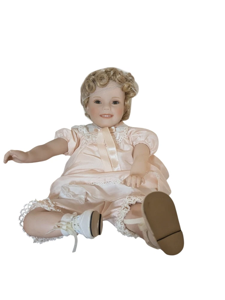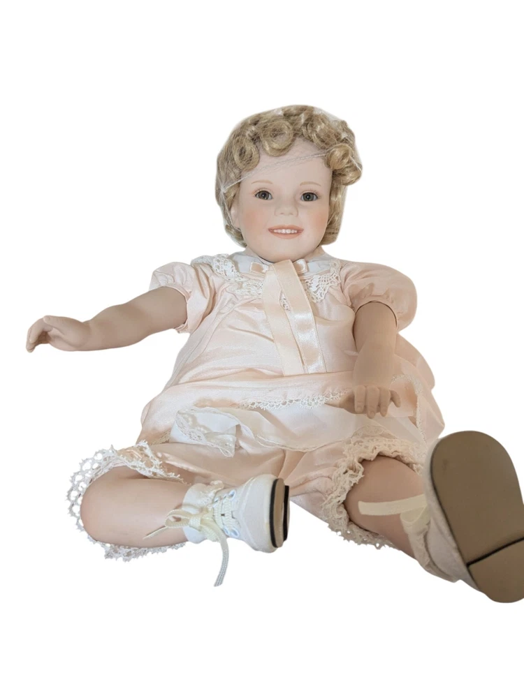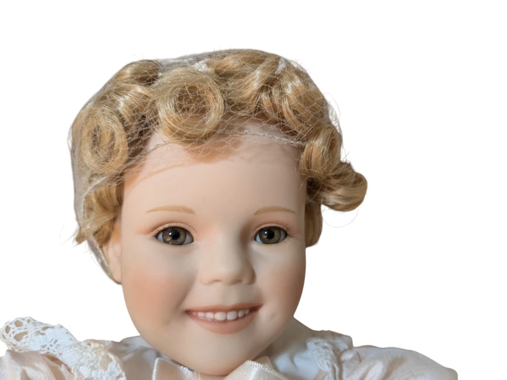 This vintage Little Miss Shirley doll, manufactured in 1996 by Danbury Mint, is a must-have for any collector or fan of the iconic child star. Measuring 11 inches in length and 8 inches in width, this porcelain doll features curly blonde hair, brown eyes, and a light complexion. The doll comes with removable clothes and is signed by the artist Elke Hutchens. It is an original piece and does not come with packaging. This Little Miss Shirley doll is perfect for all occasions and is a great addition to any collection.