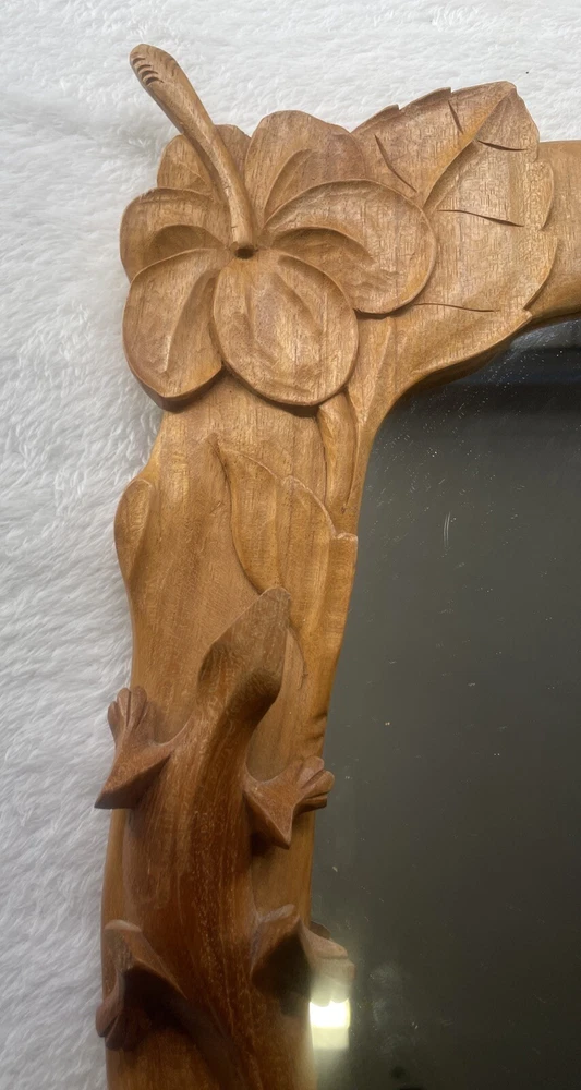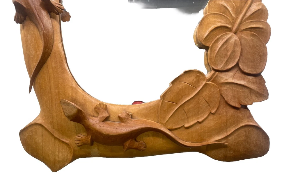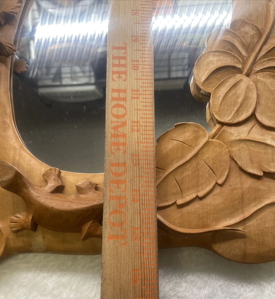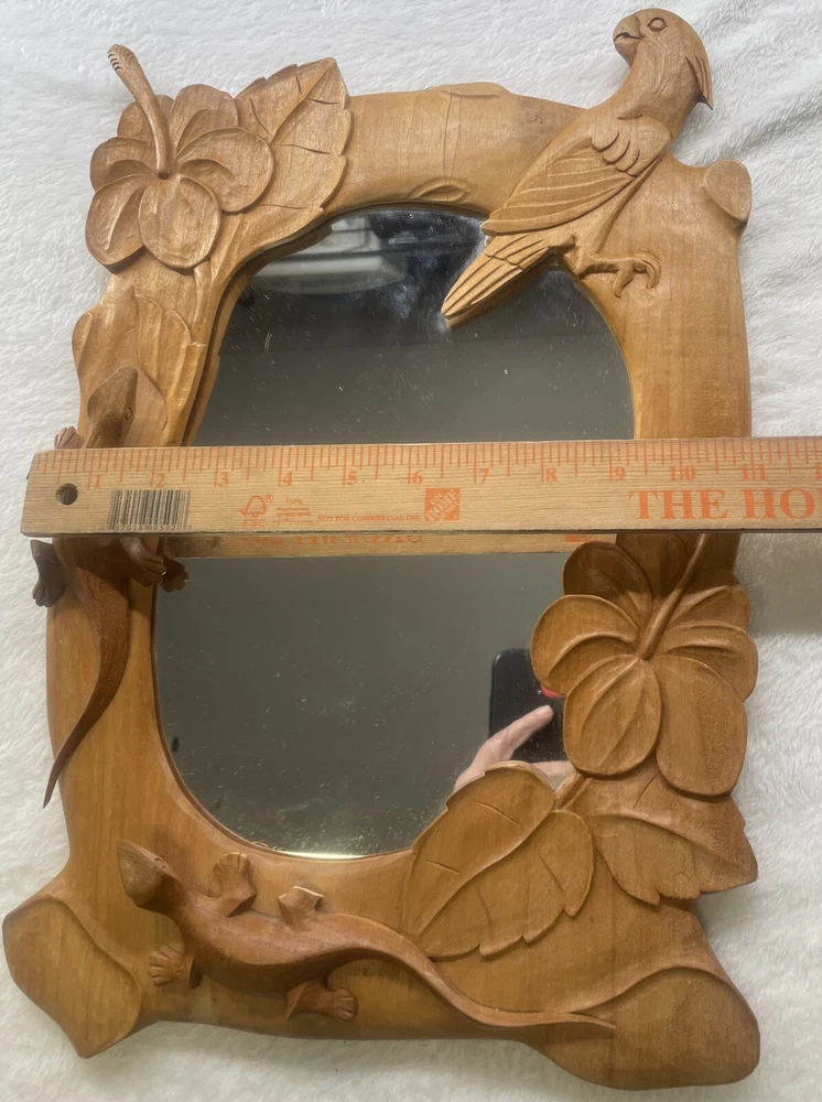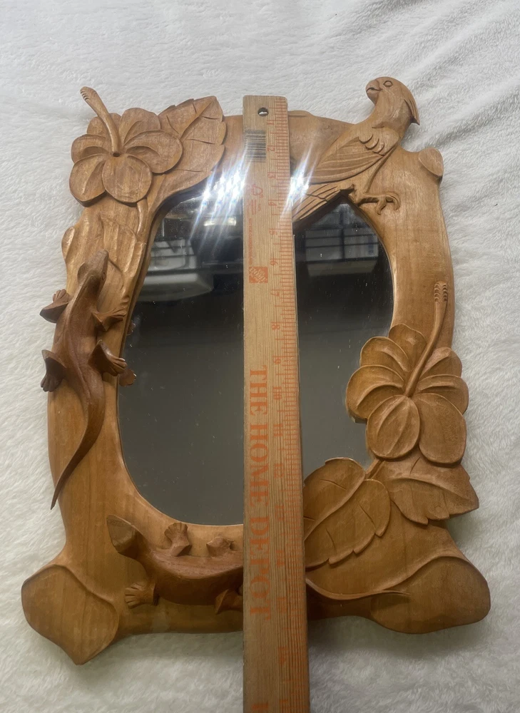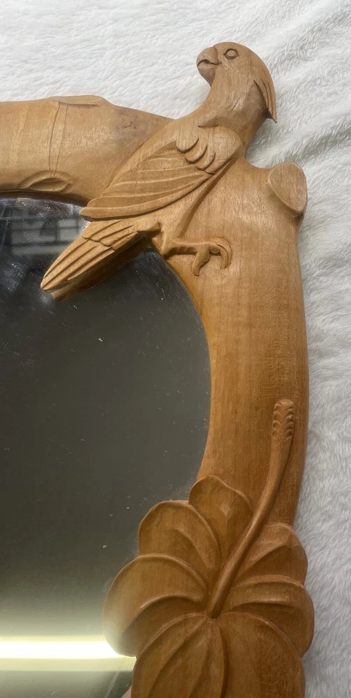 Vtg. Mirror, Hand Carved Wooden Frame, Tropical Design w/Parrots & Floral 15x11