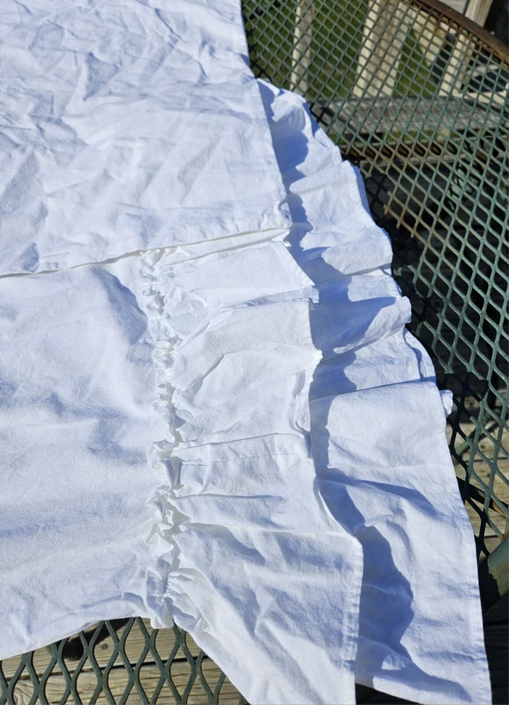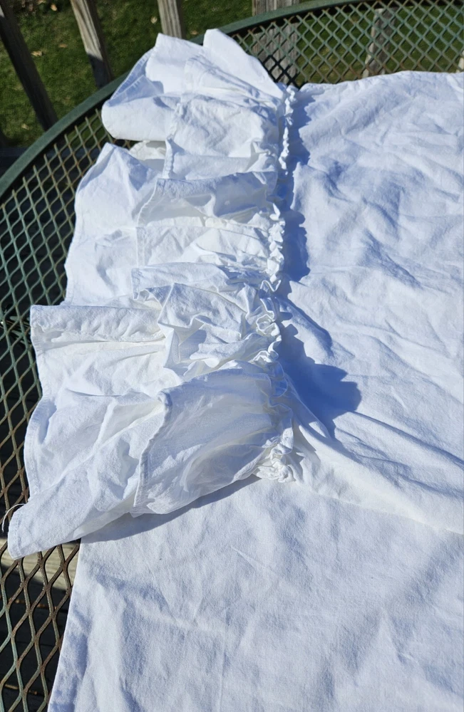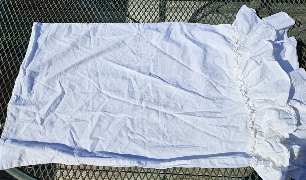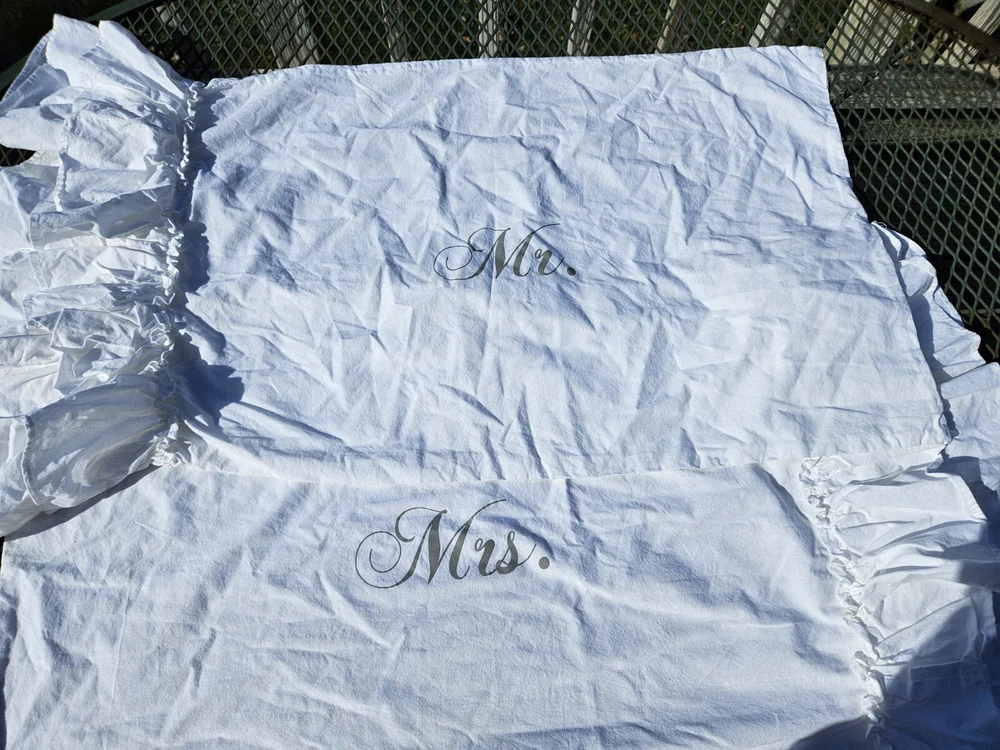 Vtg. Mr. & Mrs. Ruffled Pillow Case Cotton White NEW Revenir 27"×19" Pillow size. These 2 pillow cases are new without tags or original package they are white with Grey screenprint Mr. & Mrs. On 1 side only. They measure 27" long with 7.5" ruffle on the end.