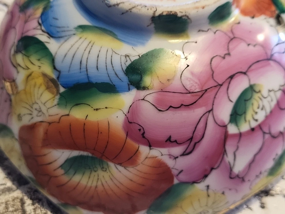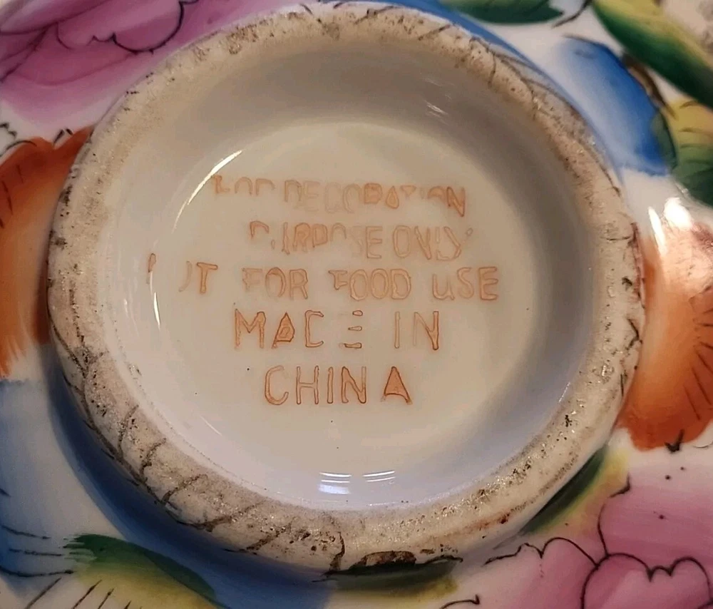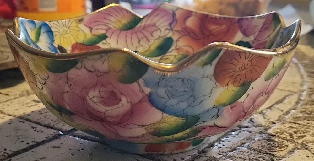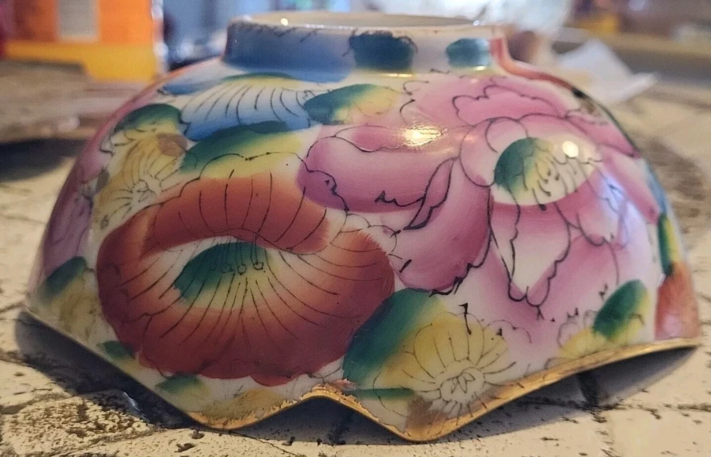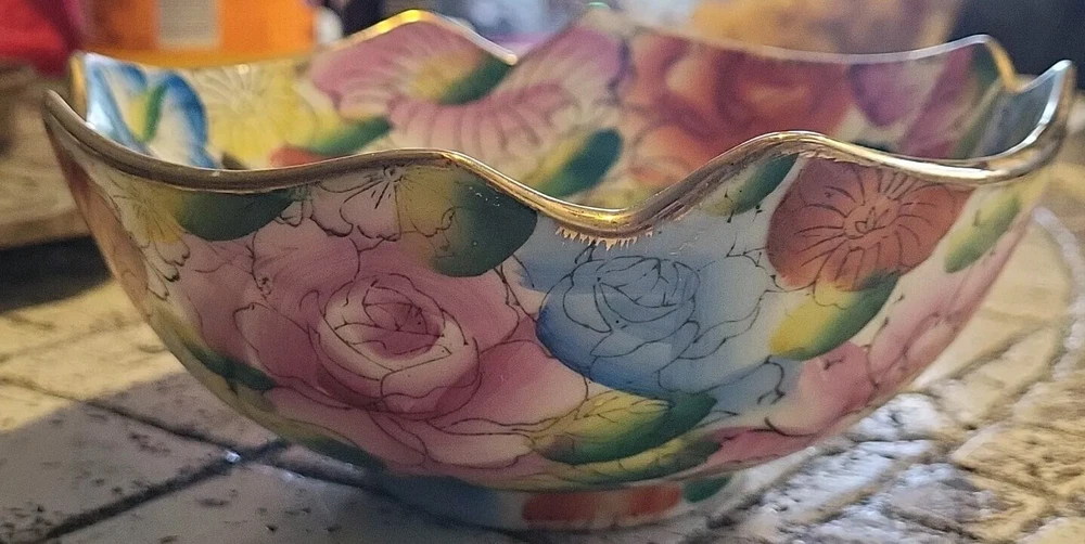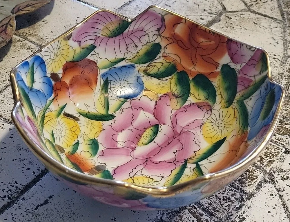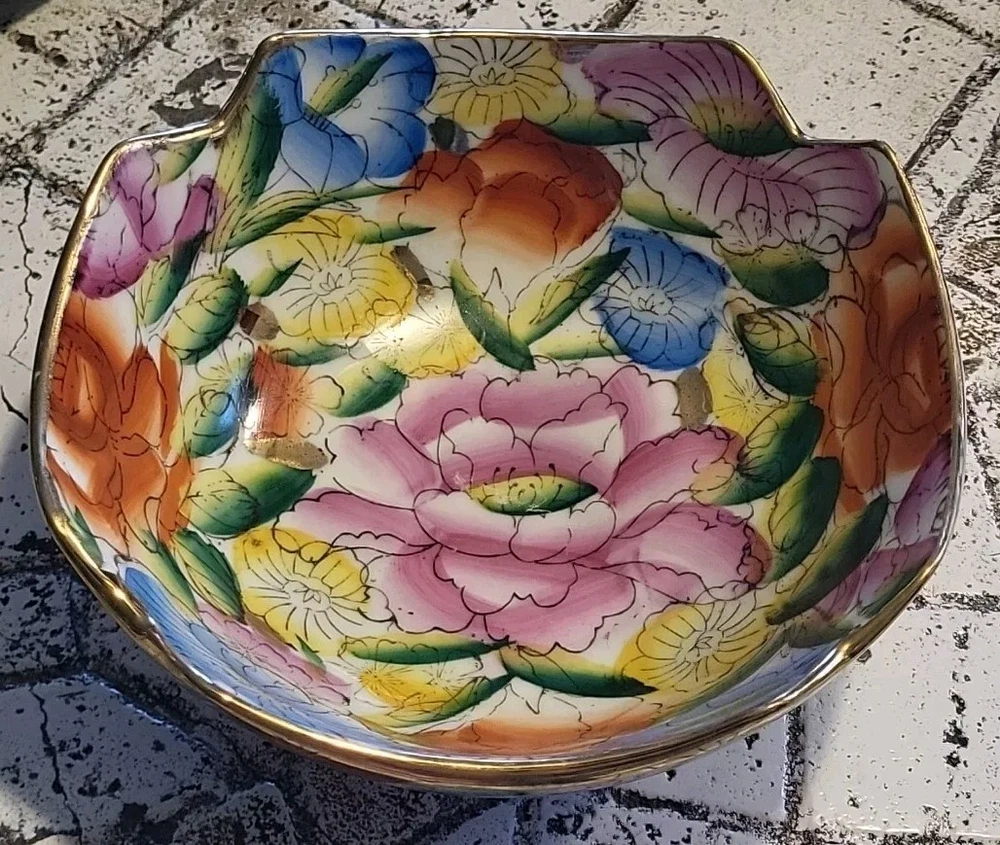 This vintage porcelain bowl is hand-painted with a vintage floral pattern and gold trim, making it a stylish and elegant piece. Made in China in 1940, it features a round shape with a glossy finish, measuring 6 inches in width and 2 inches in depth. This art pottery bowl is for decoration only and showcases an Asian style, perfect for display. The vibrant multicolor floral design adds a touch of charm to this timeless piece. Very colorful. Beautiful. No chips or damage. Very nice for trinkets. See pictures. Needs cleaned.