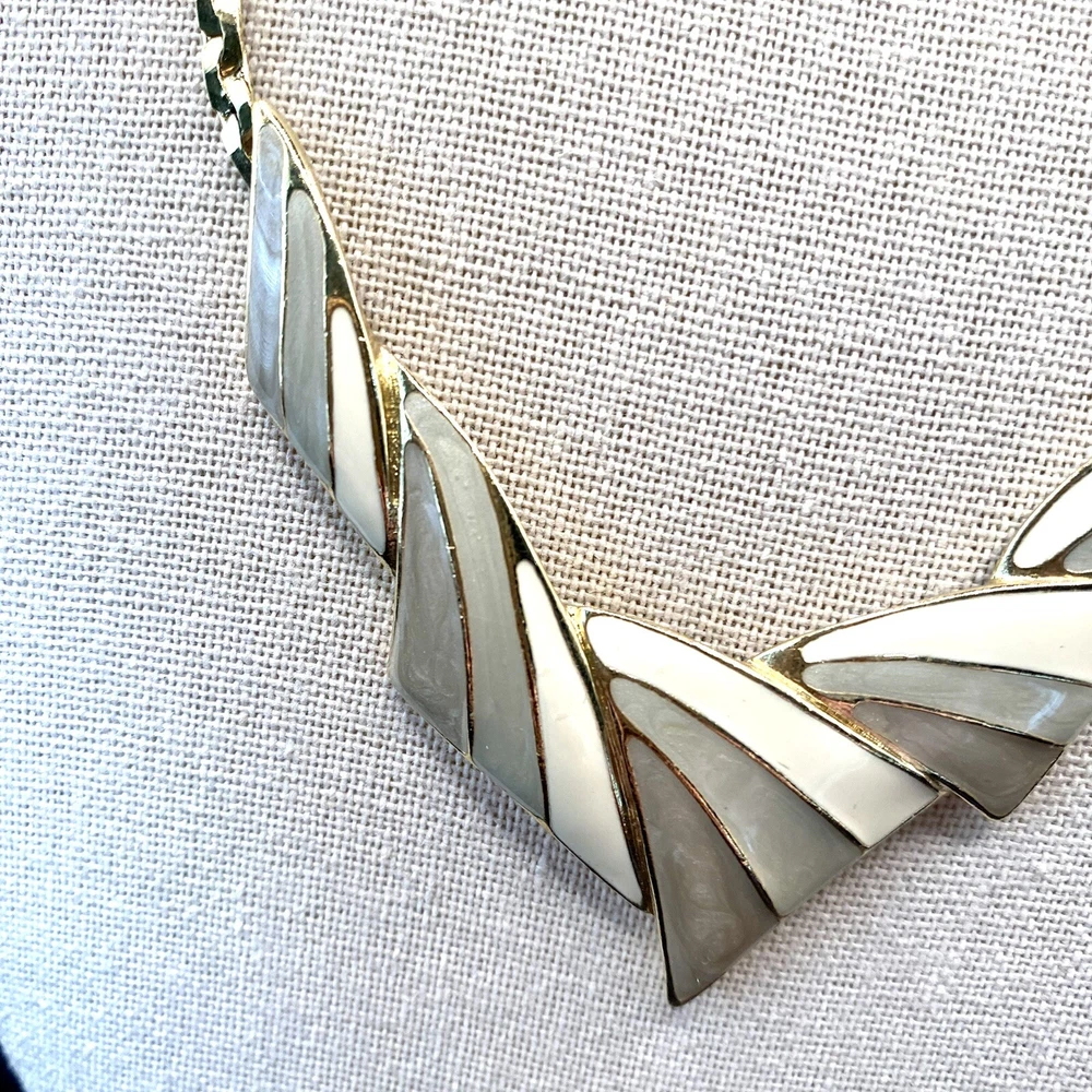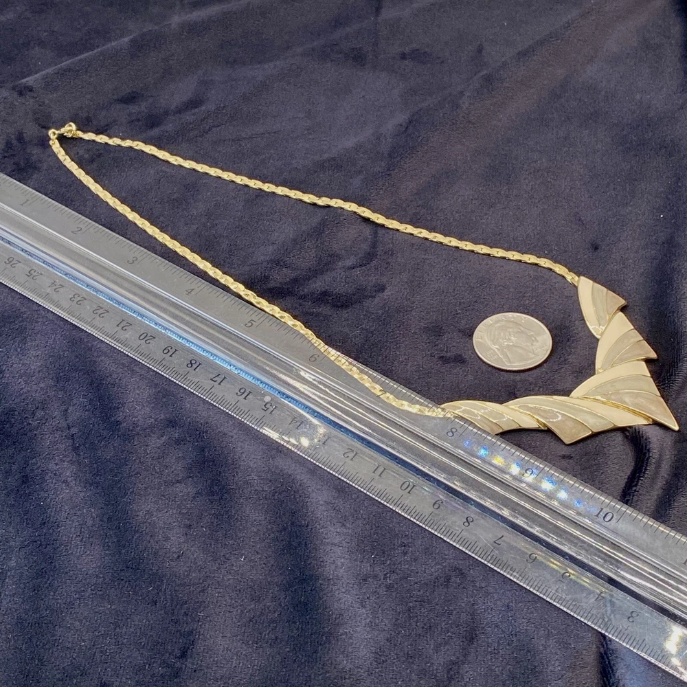 Add a touch of vintage beauty to your outfit with this rare Trifari necklace. The gold-tone metal necklace features a unique triangle-shaped pendant with a stunning eye-clean gemstone clarity grade. The pendant is spring-ring closed and hangs on an 18-inch chain with a spring-ring closure. The necklace is perfect for any occasion, including engagement, wedding, anniversary, graduation, birthdays, Father's Day, Mother's Day, Christmas, and Valentine's Day. The necklace is also customizable, making it a great gift for your loved ones. This one-of-a-kind necklace is signed by the renowned Trifari brand. The necklace is a perfect addition to any fashion jewelry collection. The pendant is made of metal and has a beautiful gold cream, gray, and green color. The necklace is an original piece, and it is not customized. The necklace is perfect for anyone who loves beauty, art, family and friends, and travel and places. Vintage Trifari GoldTone Enamel Necklace Choker Bib Tri Color Estate Statement Z This is a pre-owned piece. It may require cleaning. There may be scratching, fading, chips, normal wear, missing stones, etc… See Photos. If you have any questions, please feel free to contact me via eBay messaging. Thank you for stopping by. Make sure to check out other items in my store. Your satisfaction is my priority. Have a wonderful blessed day!