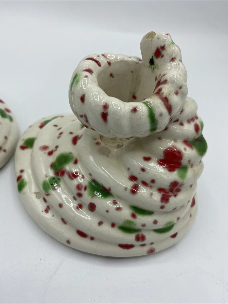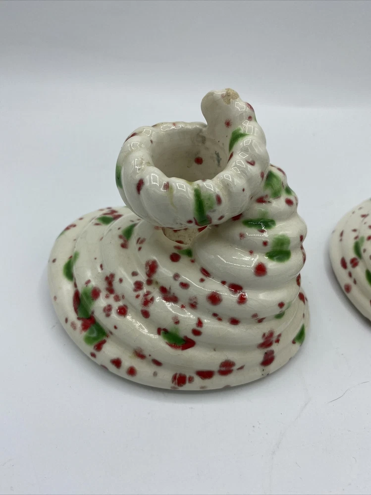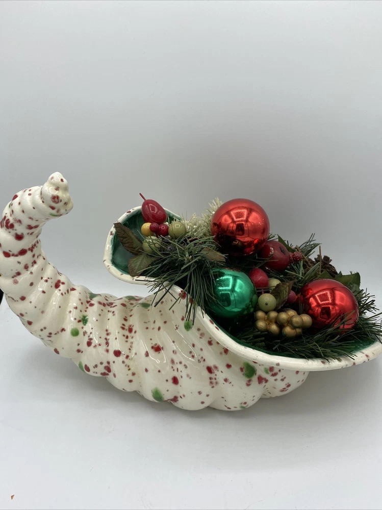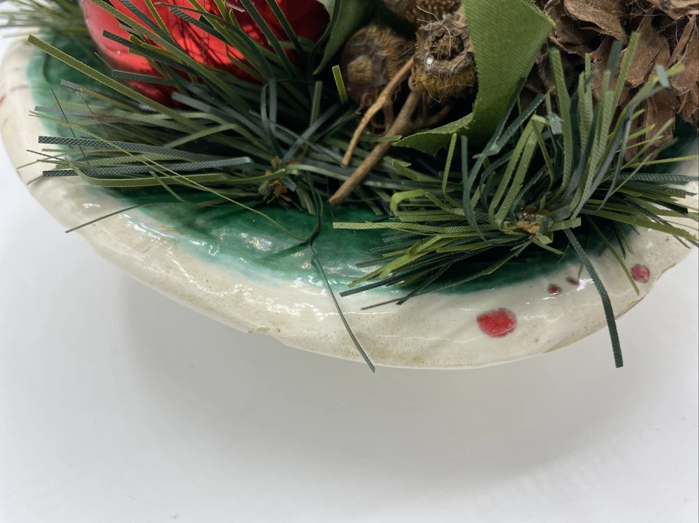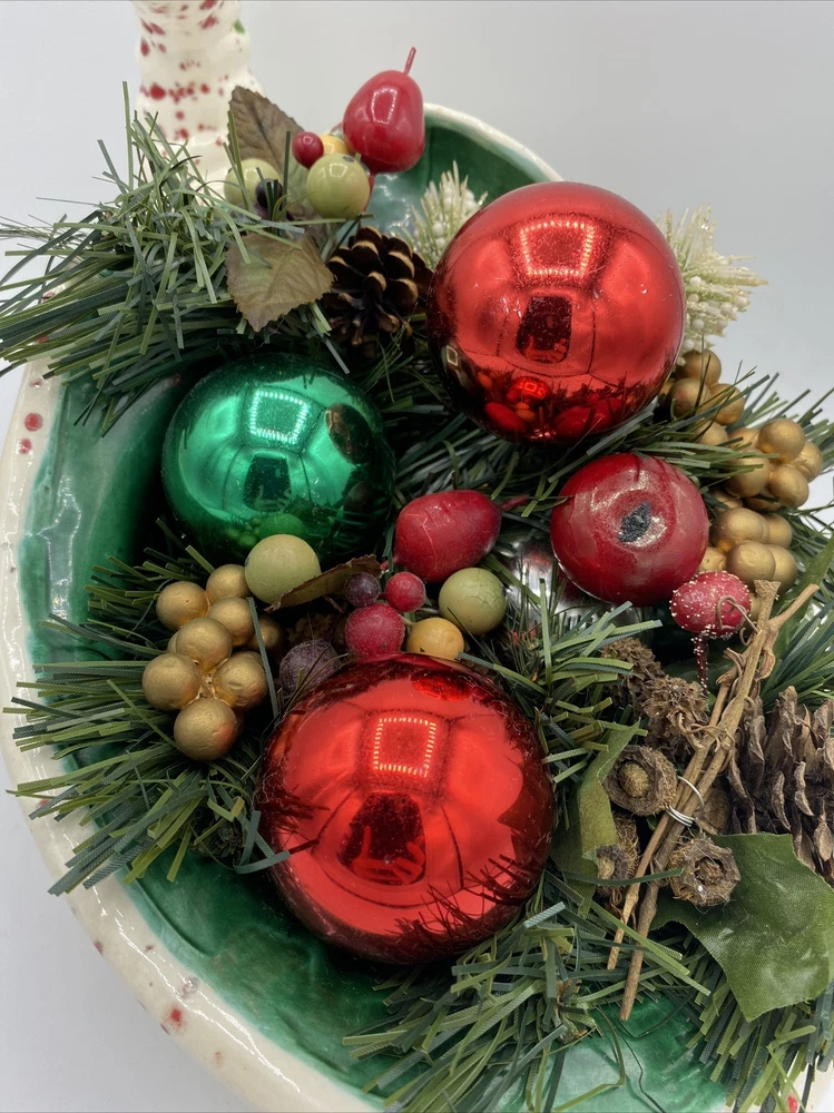 Centerpiece measures approx. 14"x8" and is filled with vintage glass ornaments and floral picks, Taper candle holders measure 5"x4". Both items have age related crazing and a few chis on the glaze . Please see photos, I tried to get pictures of all imperfections. Hassle fee returns