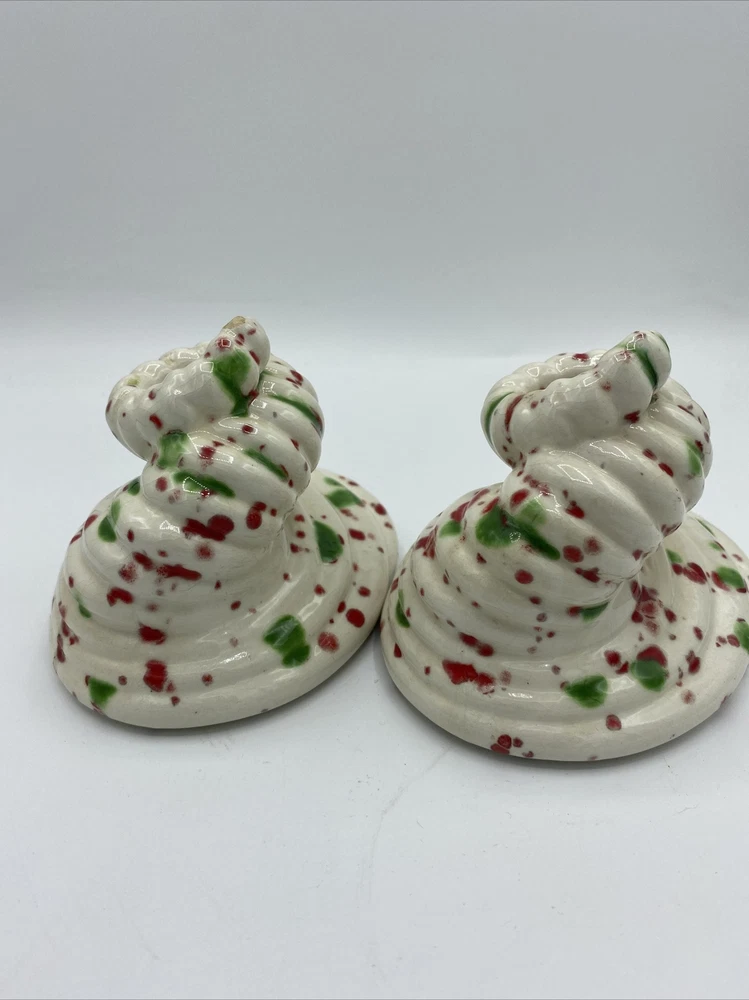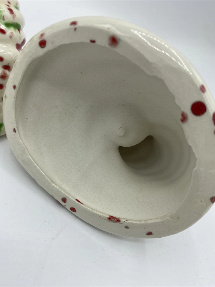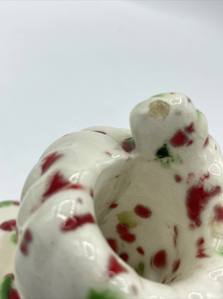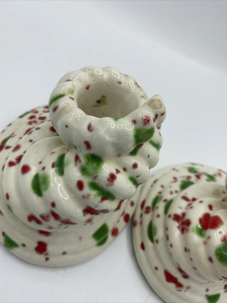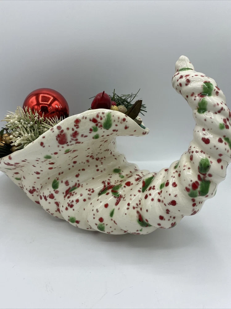 Centerpiece measures approx. 14"x8" and is filled with vintage glass ornaments and floral picks, Taper candle holders measure 5"x4". Both items have age related crazing and a few chis on the glaze . Please see photos, I tried to get pictures of all imperfections. Hassle fee returns