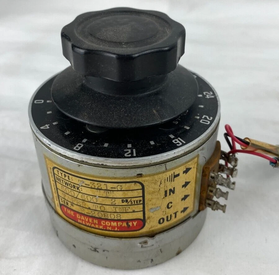 UNTESTED SOLD AS IS. has some wear on paint due to age. potentiometer knob is attached along with switch. DAVEN COMPANY TUBE AMPLIFIER ATTENUATOR WITH POTENTIOMETER KNOB TYPE: T-231-G 600/600 ohms 2 dB step SERIAL #: E-20808
