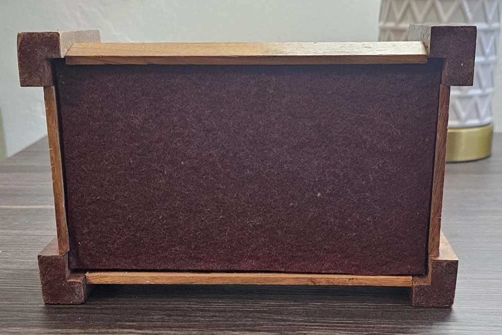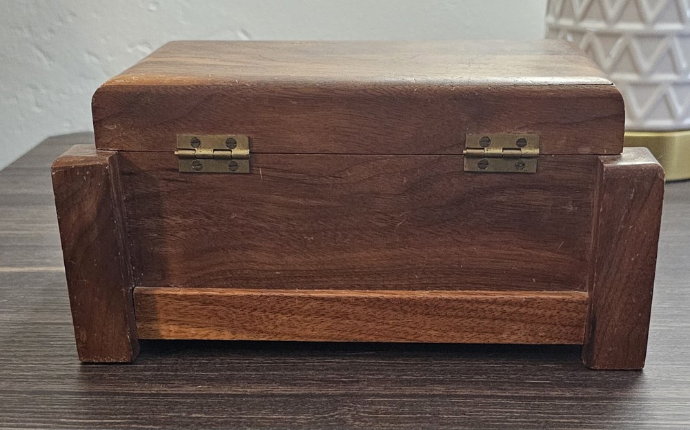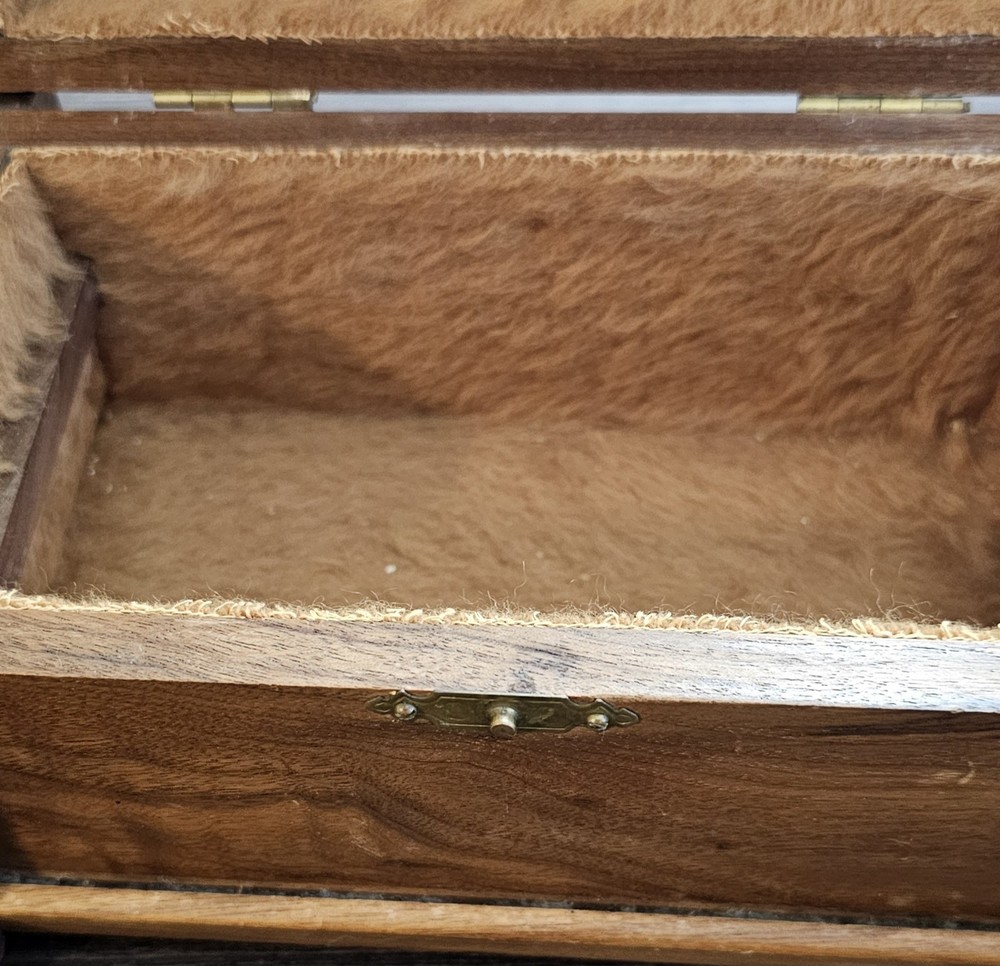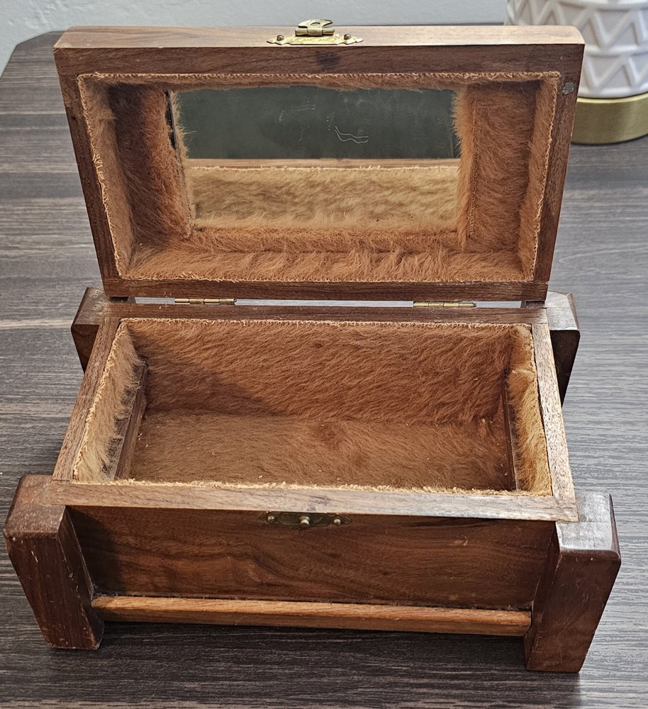 Vtg, solid wood, gold colored hinges & latch, lined imside with brownish orange faux fur, & lined underneath with dark brown felt, also has mirror inside. Not branded but you can tell it is handmade. In good condition for its age. A few flea bites here & there. Unnoticeable if polished.