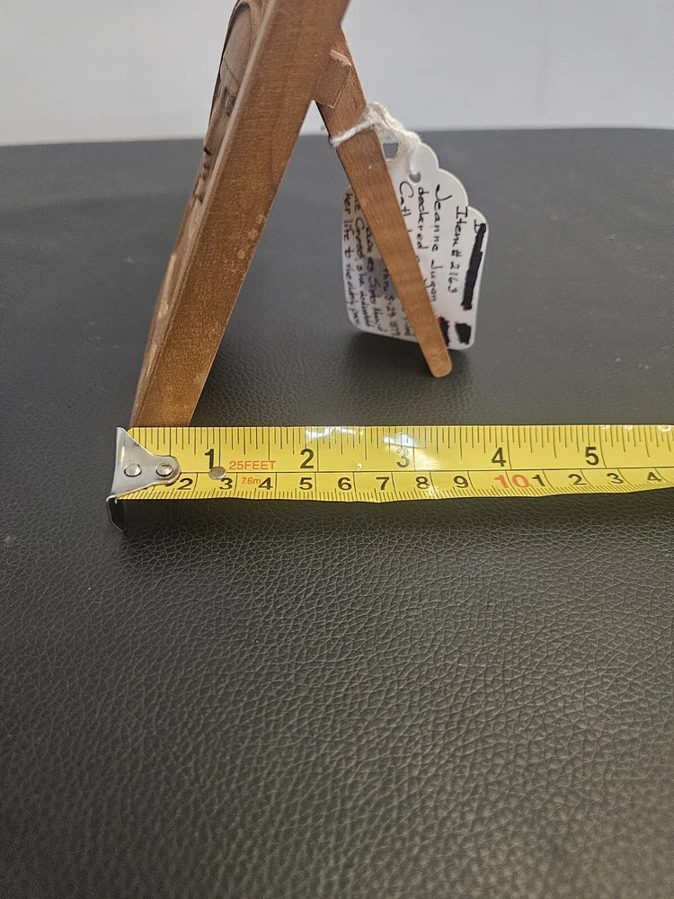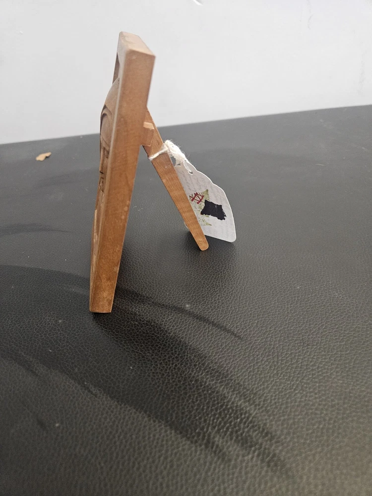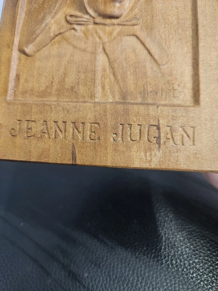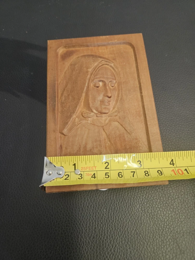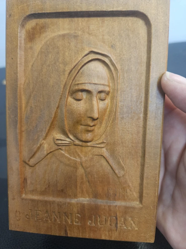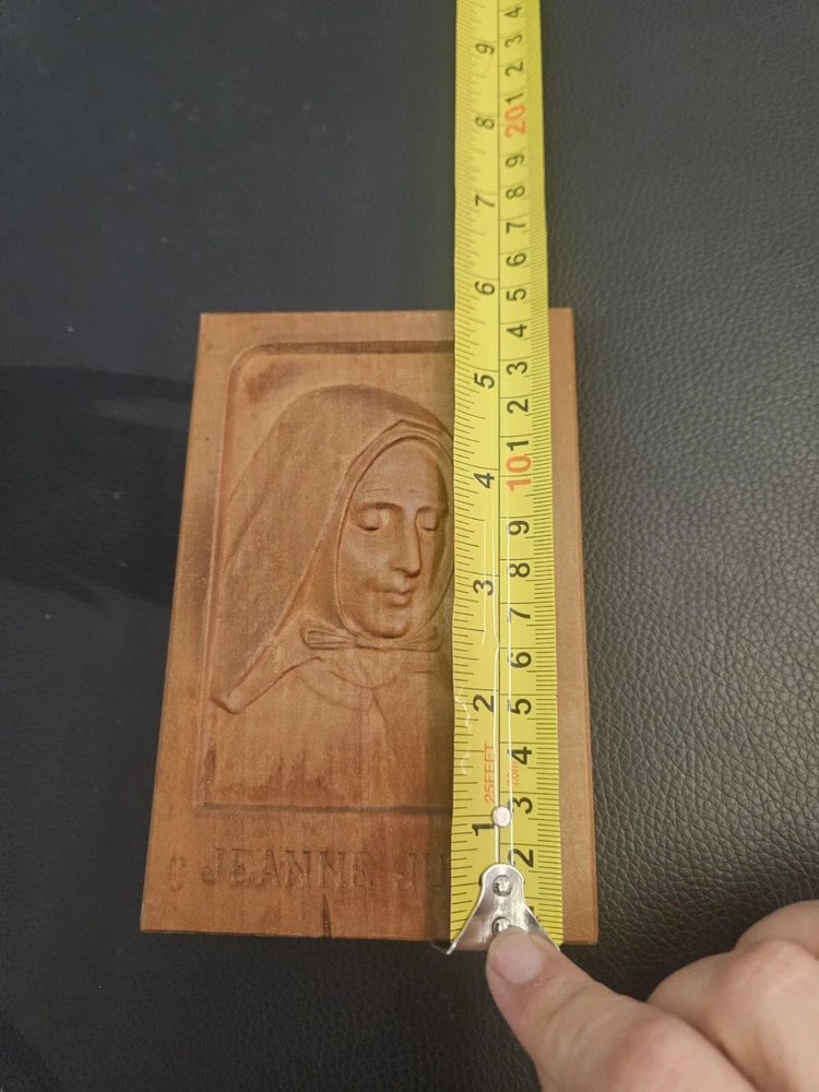 This vintage wood sculpture is a beautiful piece by Jeanne Jugan, produced in 1978. The intricate carving of a woman's face in 3D style is a stunning addition to any art collection. The sculpture is in its original format as a cameo, and is a 1st edition. The sculpture is made of high-quality wood and features a unique production technique. It is a perfect fit for any art lover who is looking for a medium-sized piece to display in their home or office. This sculpture is a must-have for collectors and enthusiasts of all ages who appreciate the beauty of wood carvings.