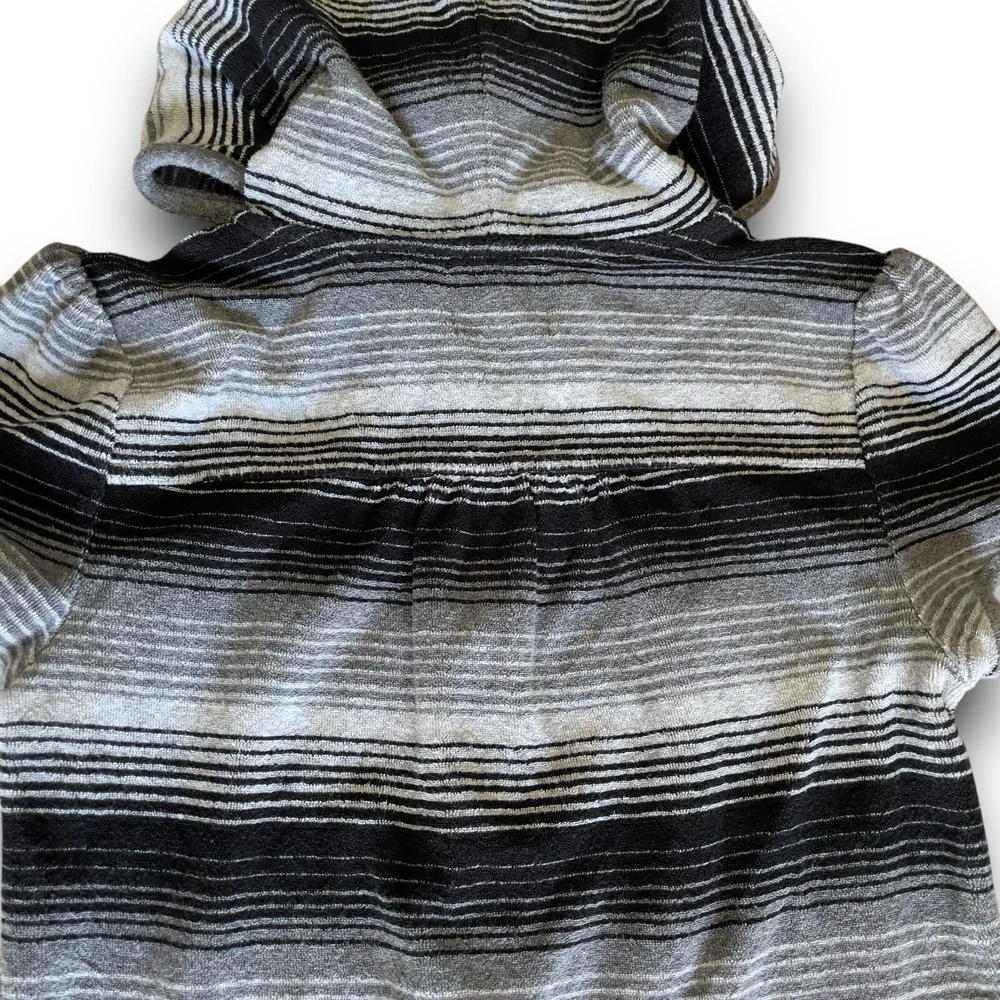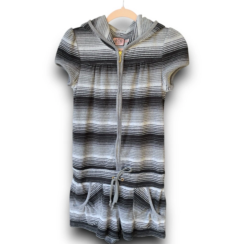 80% cotton 20% poly | made in indonesia Obvi statement piece vintage y2k early 2000s juicy couture short jumpsuit plush French terry cloth one piece romper featuring allover black grey color striped graphic print with stretchy elastic waistband drawstring, two front pockets, adorable puff short sleeves and iconic comfy hoodie with gold hardware zip up front closure with gold ‘J’ pull tag 👑✨this rare hard to find unique collectors gem is in a size small, in excellent pre owned vintage condition. Laid flat measurements: chest 15” length 30.5”
