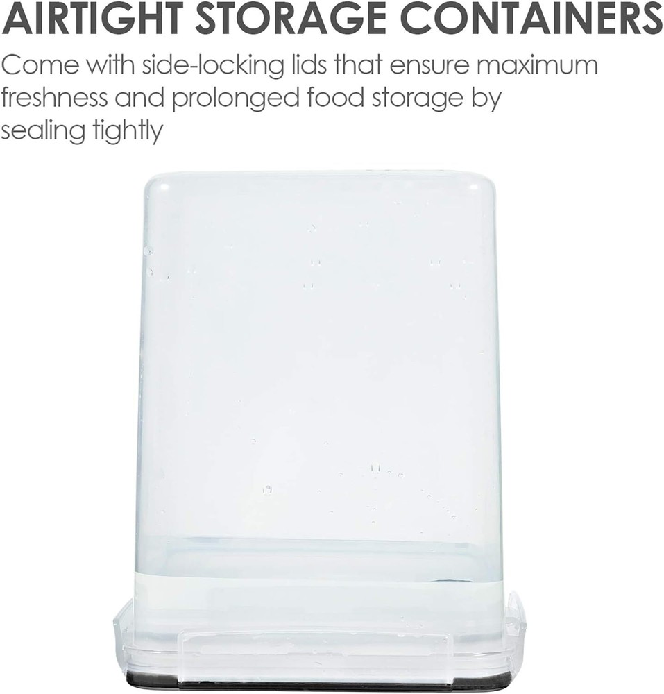 Vtopmart 4 PCS Large Food Storage Containers 5.2L / 5.2L--4.7quart, Black Product Details Product Dimensions: 7.5"L x 7.5"W x 9.1"H Recommended Uses For Product: Pasta,Sugar,Oats,Flour,Rice,Grain,Chips,Cereals,Nuts,Beans,Snacks,Pasta,Coffee,Tea,Cookies Special Feature: Air Tight, Durable Container Shape: Rectangular Closure Type: Clip-On Is Dishwasher Safe: Yes Material Type Free: BPA Free Item Package Quantity: 4 Item Weight: 1.55 Kilograms Product Care Instructions: Dishwasher Safe for container(not with lids) Item Volume: 175 Fluid Ounces Unit Count: 4.0 Count Is Microwaveable: No Item Form: Rectangular Manufacturer: Vtopmart Size: 5.2L--4.7quart Part Number: USVM02071 Item Weight: 3.41 pounds Item model number: USVM02071 Special Features: Air Tight, Durable Batteries Included?: No Batteries Required?: No Number of Sets: 4 Brand: Vtopmart Color: Black Material: Plastic Material Feature: BPA Free, Dishwasher Safe Capacity: 5.2 Liters Make a Huge Difference in Pantry Organization ---- If you already got tired of messy flour and sugar bags, then don't hesitate to choose our large food storage containers. These flour containers will make everything looks neat and in order. Come with 4 premium food storage canisters, 4 measuring cups, 24 chalkboard Labels, this container set will also be an ideal gift for any family. Perfect for Storing Dry Food ---- The size of each container is 7.5 x 7.5 x 9.1 inch ( 5.2L / 175 oz) , with the large capacity, these kitchen storage containers are perfect for many kinds of dry food and baking supplies, such as flour, sugar, rice, grain, chips, cereals, nuts, beans, snacks, pasta, coffee and tea. Plus wide enough openings to reach in with measuring cup. Made from High-Grade Plastic ---- These pantry storage containers are made from high-grade BPA free plastic, which has decent quality. Containers are fairly sturdy and nice looking, which are worth every cent you paid for them. The clear plastic let you see what is in the container, you can get what you want easily without opening every container. Seal Securely ---- Vtopmart airtight food storage containers come with Side-locking lids that ensure maximum freshness and prolonged food storage by sealing tightly. They will protect your food from air and water, so you don't need to worry about your favorite foods turning stale anymore! Please ensure that the lid is lined up properly in order to close them. Stackable Design ---- With the stackable design, these plastic storage containers will make more efficient use of every inch of your home kitchen. Whether you have a large or small pantry, these durable containers will help you organize your kitchen and pantry better. Easy to clean and dishwasher safe, please hand wash the lid.