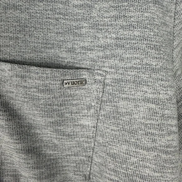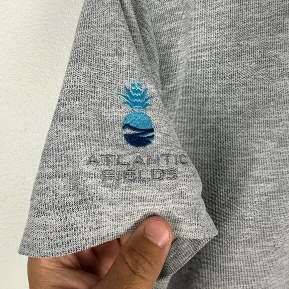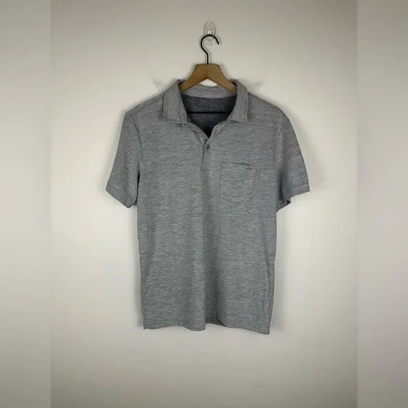 Sz S Embroidered in one sf the sleeves Vuori Men's Ace Polo Shirt is a performance stretch polo designed for athletes and active individuals. It features a collared neckline with a button closure, short sleeves, and an athletic fit. The shirt is made of a lightweight and easy-care polyester knit fabric with moisture-wicking properties, making it suitable for winter, summer, fall, or spring.