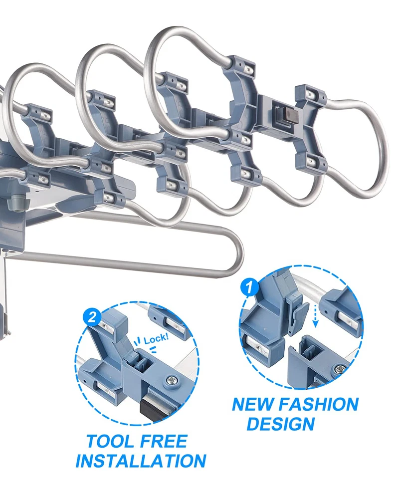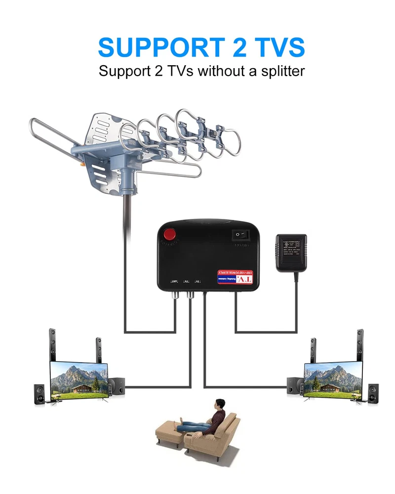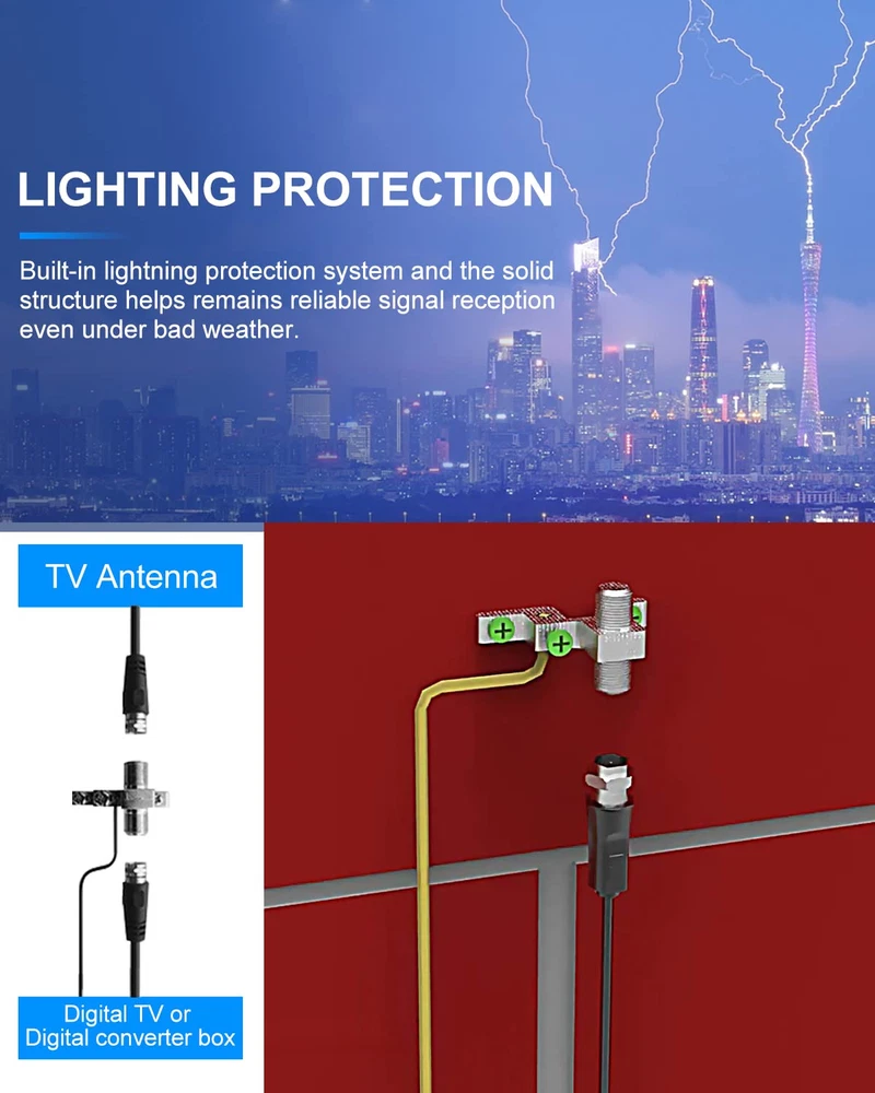 HDTV Without A Monthly Bill--Antenna TV digital hd outdoor provides high resolution HDTV 4K,1080p,1080i,720p for local FREE channels, local news, sports programs.Saving your mothly fee, providing you with the well experience to watch live TV! Support Dual TV Output--Outdoor antenna support 2 TVs at the same time without a splitter. No special adapter needed.Additionally, our digital antenna contains a wireless remote control, you can adjust the antenna at home easily. 200 Miles Long Range Reception--Built-in 360 degree motor can help to reach a wider area by pressing the button to rotate the digital antenna.Built in Super Low Noise Amplifier,includes 60ft RG6 HD TV antenna coaxial cable. Weather Resistant -- There is a lightning protection system in the outdoor hd antenna,superior construction to withstand tough outdoor weather conditions.So this amplified hdtv antenna can play in an important role in the outdoors. What’s in the package -- Clear TV antenna with wireless remote, power supply adapter and 60ft RG6 coaxial cable and J-shaped mount pole.Snap on elements no tools required,easily mount our antenna on roof, attic, chimney, eave, mast or outside the house.