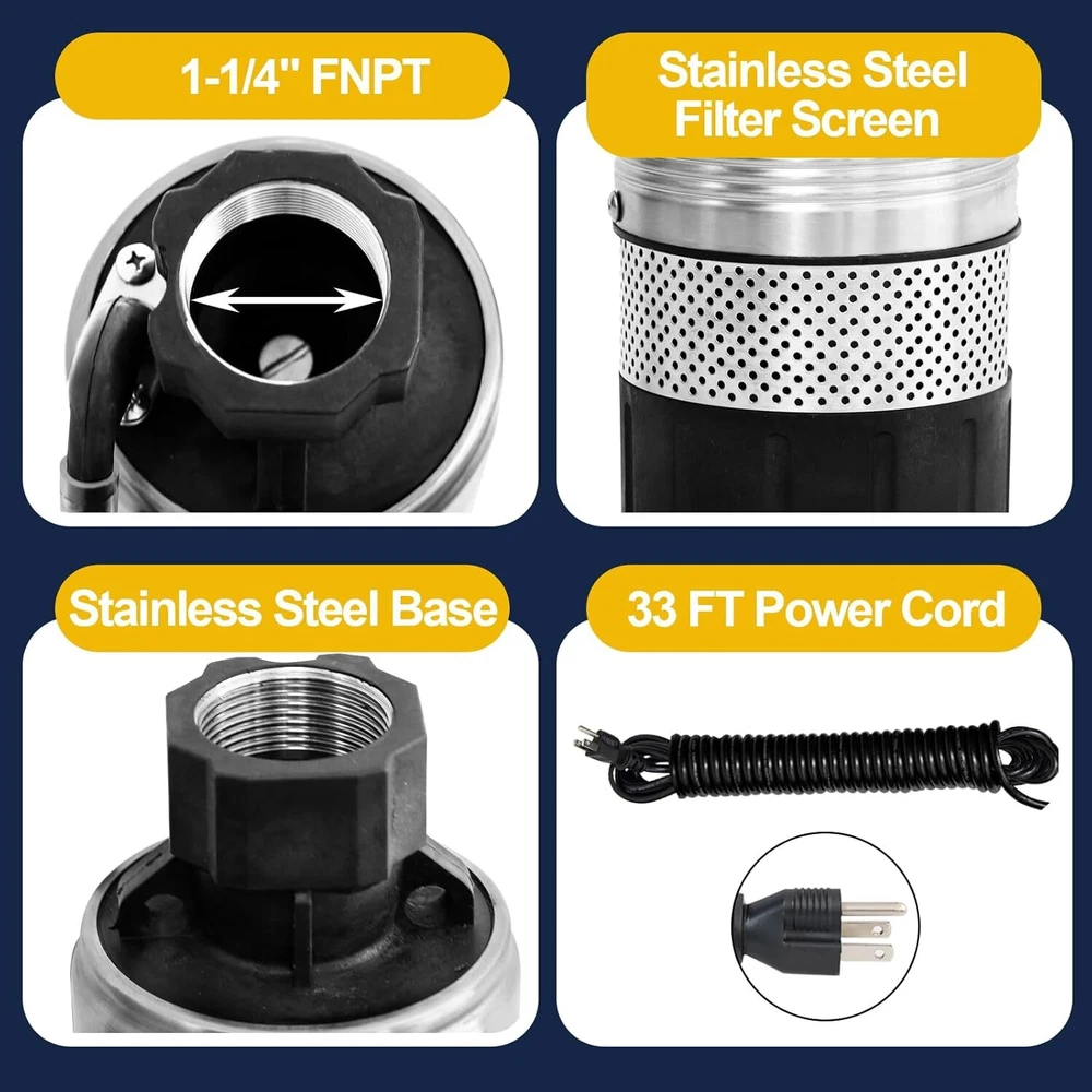 【ESSENTIAL PARAMETER】Stainless Steel Submersible Deep Well Pump rated voltage: 115V/60HZ;Rated power:1/2HP;Max flow:26GPM;Max head:138ft;Outlet:1-1/4" FNPT;For 4 inch well casings and bigger. 【HIGH QUALITY PUMP】Septic Submersible Pump Features:high quality stainless steel body;Built in capacitor start;Hermetically sealed motor is thermally protected to prevent overheating,for longer life and powerful start. 【APPLICABLE CONDITION】The water pump has no special requirement on well and water pipe, that means the pump can used in Steel pipe wells, ash pipe wells or soil wells, and if the pressure permit, steel pipe, hose or plastic pipe can be used as its water pipe. 【PREMIUM FILTRATION MESH】The filtration mesh of a submersible pump is made of stainless steel to filter impurities.You can add a layer of gauze in front of the filtration inlet for a new drilled well with excessive granular sediment. 【WIDE USE】4TMS series septic tank submersible pump is suitable for septic tank, fish pond, animal husbandry, water fountain extraction, agricultural irrigation and so on.