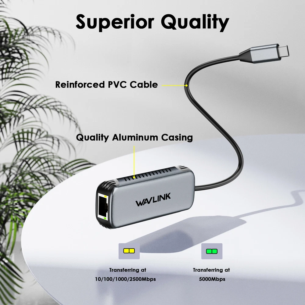 5Gbps WAVLINK USB C to Ethernet Adapter 5Gbps, Driver-free RJ45 Gigabit Ethernet Network Adapter for Laptops, Computers and More, Grey Aluminum Case for Windows 10/11, Mac OS 11 or Later, Linux and More [Enhanced Wired Connectivity up to 5G Speeds] Unlock unmatched reliability with speeds reaching up to an impressive 5000Mbps, ensuring seamless data transmission. Compliant with IEEE standards such as 802.3u (10/100Mbps), 802.3ab (1000Mbps), and 802.3bz (2500/5000Mbps), this device guarantees optimal performance for various network demands. [Versatile USB-C 10Gbps Interface] Experience unparalleled connectivity with a USB-C interface that adheres to the latest USB Spec 3.2 standards, providing lightning-fast data transfer speeds of up to 10Gbps. Whether for large file transfers or demanding applications, this feature ensures efficient data exchange for all your connectivity needs. [Advanced Remote Wake-up Functionality] Empower remote functionality with support for Microsoft Wake Packet Detection (WPD), 'Wake-On-Lan,' and 'RealWoW' features. Seamlessly wake up slumbering PCs over the internet, offering convenience and accessibility like never before, enhancing productivity and efficiency across various settings. [Sleek and Lightweight Design] Crafted with a focus on convenience, the compact and lightweight design of this device optimizes space utilization in homes, offices, or on-the-go scenarios. Easy to carry and integrate, it ensures versatility without compromising on performance, catering to dynamic connectivity requirements effortlessly. [Robust Construction for Longevity] Engineered with premium aluminum alloy shell and internal heat dissipation design, this device assures durability and stability for prolonged usage. The sturdy build not only enhances longevity but also guarantees consistent performance, making it a reliable companion for sustained connectivity needs. Cutting-Edge Connectivity: Experience lightning-fast network speeds with a single RJ45 Ethernet port supporting up to 5000Mbps, meeting IEEE standards like 802.3u (10/100Mbps), 802.3ab (1000Mbps), and 802.3bz (2500/5000Mbps).Coupled with a USB-C port compliant with USB Spec 3.2 for 10Gbps transfer rates, this device ensures seamless networking and data transfers. Enhanced Remote Wake-Up Capabilities: Integrate Microsoft Wake Packet Detection for advanced remote wake-up features like 'Wake-On-Lan' and 'RealWoW.' Boosting efficiency and reliability, this combo enhances global accessibility with versatile options. Experience flexibility and greater control when activating devices remotely. Portable Efficiency: Crafted to be compact and lightweight, this device is optimized for saving space effortlessly, whether at home, in the office, or on-the-go. Its sleek design ensures maximum portability without compromising functionality, making it an ideal companion for those who value efficiency in every setting. Note: 1. To achieve the optimal network speed please make sure the USB port connected speed is 10Gbps; When the USB port speed is 5Gbps, the maximum Ethernet speed is around 3.3Gbps. 2. The default speed for MAC OS is 5Gbps, manually selecting the highest speed should be at 2.5Gbps; This issue is related to the MAC OS driver and manual settings are not recommended. 3. There are speed differences on MacBook. * M3 chip. Dual direction maximum speed can reach 4.6Gbps. * M1 chip. Dual direction Transmit/Receive. One direction can reach 4Gbps, the other 2.5Gbps. Single direction maximum speed can reach 4.7Gbps. * 2017 Intel i7 chip. Dual direction Transmit/Receive. One direction can reach 3.1Gbps, the other 1.3Gbps. Single direction maximum speed can reach 4.7Gbps. * 2017 Intel i5 chip. Dual direction Transmit/Receive. One direction can reach 2.9Gbps, the other 900Mbps. Single direction maximum speed can reach 3.8Gbps. 4. The speed are related to the computer CPU performance. Because this Ethernet adapter will consume computer's CPU resources. On Surface Laptop Go(CPU i5-1035G1)Win11 OS will have same issue. Dual direction Transmit/Receive. One direction can reach 4.7Gbps, the other 623Mbps. resulting in CPU usage at 100%. Realtek will provide the minimum configuration requirements soon. If the above issue would made a negative impact on your user experience, please purchase with caution. Specifications: Model: WL-NWU340G Color: Grey Material: Alumimum Alloy Product Dimensions: 8x3.2x1.7cm/3.15x1.26x0.67in Cable Length: 15cm/5.91in Ports: 1x USB-C compliant with USB3.2,1x RJ45 10/100/1000Mbps/2.5G/5Gbps Ethernet LED Indicator Blinking Green: Auto-recognition and transferring at 5000 Mbps speeds. LED Indicator Blinking Amber: Auto-recognition and transferring at 10/100/1000/2500Mbps speeds. System Requirement: Windows/MacOS/Linux/Chrome OS Compatibility: Compatible: Windows, macOS, Linux, and Chrome OS, USB-C (5Gbps), USB 3.0, and Thunderbolt 3 Systems, Microsoft Windows 10, 8.x, 7, Vista and XP, macOS 10.6 and above, iPadOS Compatible: Linux kernel 3.2 and above (basic support, install driver or update to 5.x kernel for full support), Supported on up-to-date Chrome OS systems Compatible: Plug and play for Windows 10, Mac OS 10.13.6 to 11.x, iPadOS, Linux Kernel 5.x and above, up-to-date Chrome OS. Not Compatible: ARM-based Windows RT and Windows Mobile, Nintendo Switch, Most Android devices, TiVo Series 2, Wii, or other non-PC/Mac platforms, Not recommended for use with FreeBSD or pfSense Note: 1.For 5 Gigabit network performance, use Cat 6 Ethernet cable or higher, ensure your internet plan supports 5G, and that your Modem, Switch, or Router also support 5G output. Additionally, ensure your PC's C port supports 5G or above for faster transmission speeds. 2.Plug and play (driver-free) functionality automatically installs drivers on Windows systems. For Mac and Linux, the system comes with built-in drivers for seamless plug-and-play capabilities without the need for manual installations.For older systems, please download and 