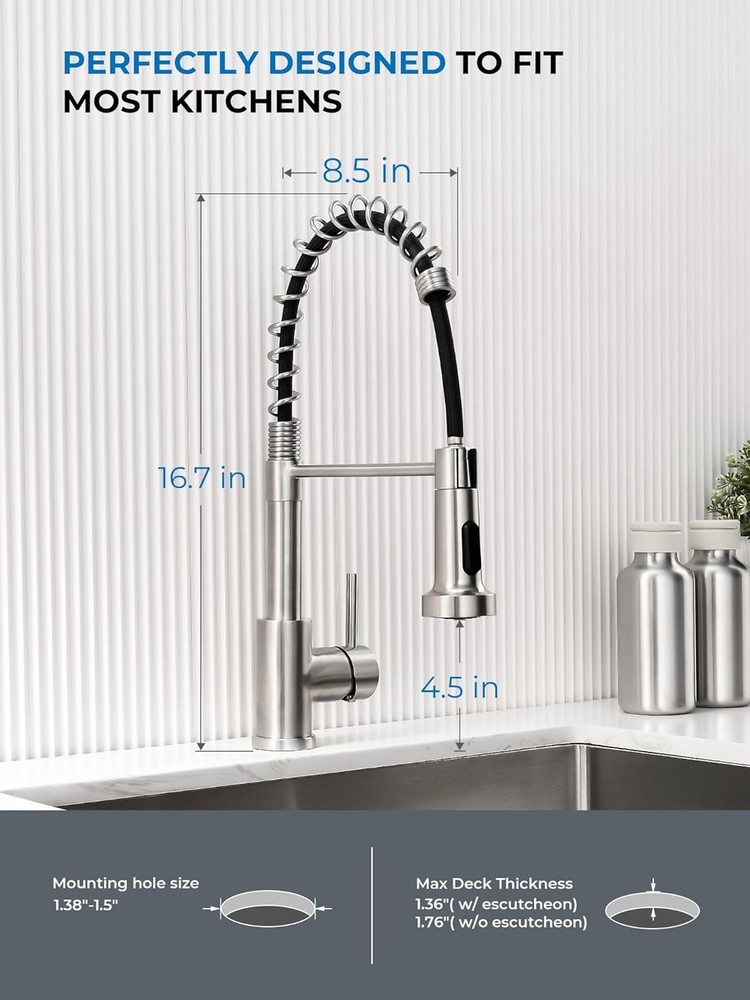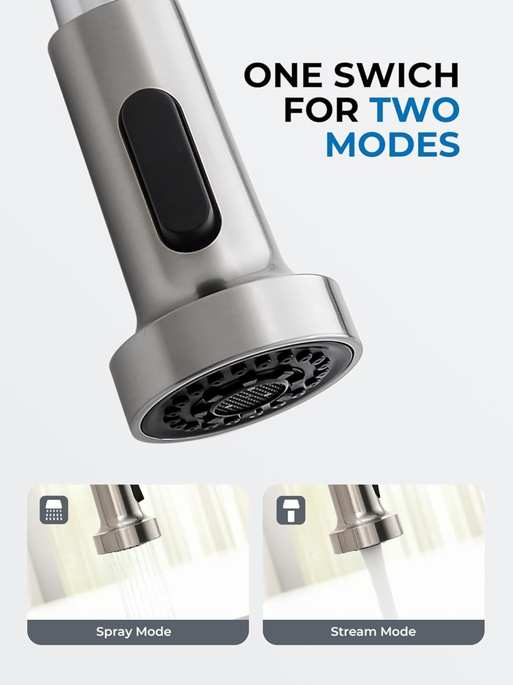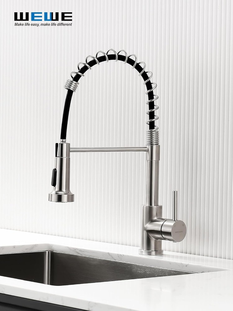 WEWE Kitchen Sink Faucet, Faucets with Pull Down 2 Brushed Nickel Product Details Brand: WEWE Recommended Uses For Product: Kitchen Mounting Type: Deck Mount Finish Type: Brushed Material: Stainless Steel Color: 2 Brushed Nickel Number of Handles: 1 Included Components: Kitchen faucet, Mounting accessory, Weight, Instruction manual Hole Count: 1 Special Feature: Pull Down Sprayer, 360 Swivel Handle Type: Lever Style: 2 Pull Out Installation Type: Single Hole Maximum Flow Rate: 1.8 Gallons Per Minute Valve Type: Disc Valve Model Name: WEWE Kitchen Sink Faucet Number of Pieces: 1 Handle Material: Metal Spout Height: 4.6 Inches Spout Reach: 9.8 Inches Item Weight: 4.1 Pounds Handle Location: Left/Center/Right Spout Design: Pull Out Hose Length: 23.6 Inches Is Electric: No Manufacturer: Aonecer Part Number: A90190502BN Item Weight: 4.06 pounds Package Dimensions: 16.69 x 13.11 x 2.52 inches Item model number: A8056-07-05CP Finish: Brushed Shape: Gooseneck Item Package Quantity: 1 Special Features: Pull Down Sprayer, 360 Swivel Batteries Included?: No Batteries Required?: No Brand: WEWE Recommended Uses For Product: Kitchen Mounting Type: Deck Mount Finish Type: Brushed Material: Stainless Steel Color: 2 Brushed Nickel Number of Handles: 1 Included Components: Kitchen faucet, Mounting accessory, Weight, Instruction manual Hole Count: 1 Special Feature: Pull Down Sprayer, 360 Swivel Ease of Use: The pull down kitchen faucet can be extended to maximum pull out length 23.6 inches, meets your requirement for a larger cleaning area. You can fill the water or do some cleaning outside the kitchen sink. 360°Swivel: 360 degree rotating spout can be easily move smoothly, which is suitable for double sink. You can use the brushed nickel kitchen faucet in different directions of the sink for different tasks, without moving your feet all the time. Dual Functions: Different water mode functions of the kitchen faucets with pull down sprayer can fulfill different tasks requirement. The high quality nozzle of kitchen faucet offers aerated stream for cleaning and non-splash powerful spray for rinsing, just enjoy your kitchen with this commercial kitchen faucet. Safe Sink Faucet: This kitchen faucet with sprayer is designed specially that cold water comes out when pulling forward, is more safer comparing to most water faucet in the market. CARE MUCH MORE FOR YOUR SAFETY, especially for CHILDREN! A Perfect Fit Kitchen Sink Faucet: Your faucets for kitchen sink with commercial style spring design and the compact height 17”, can easily matches all decorating style and place, such as farmhouse kitchen faucet, rv kitchen faucet, laundry faucet, camper kitchen faucet.