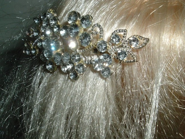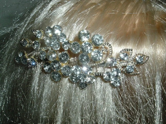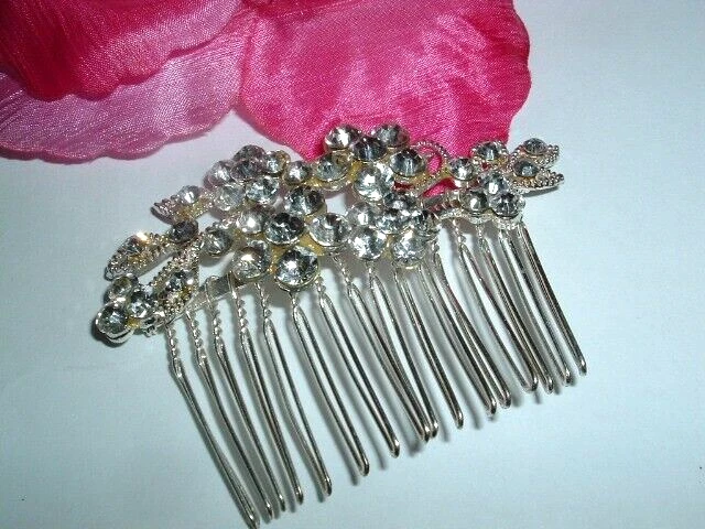 A slide silver side hair comb with chaton cut, white rhinestone flowers framed in beaded silver measuring 3" wide and 2" tall. Condition is excellent, perfect for a prom, wedding or night out on the town, lots of bling.
