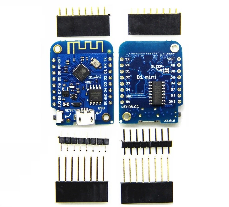 WEMOS D1 mini V3.0.0 - WIFI IoT Development Board Based ESP8266 4MB MicroPython Nodemcu Arduino Compatible - Descriptions: D1 mini v3.0.0 - A mini wifi board with 4MB flash based on ESP-8266EX. What's new about V3.0.0 Optimize the circuit Add Deep-Sleep jumper. Default firmware: lastest MicroPython ESP8266 firmware. Features: 11 digital input/output pins, all pins have interrupt/pwm/I2C/one-wire supported(except D0) 1 analog input(3.2V max input) a Micro USB connection Compatible with MicroPython, Arduino, Nodemcu lots of Shields All of the IO pins run at 3.3V. - Package Contains: 1p x D1 mini V3.0.0 WIFI Module (with Pins as shown in the picture) - Pictures: