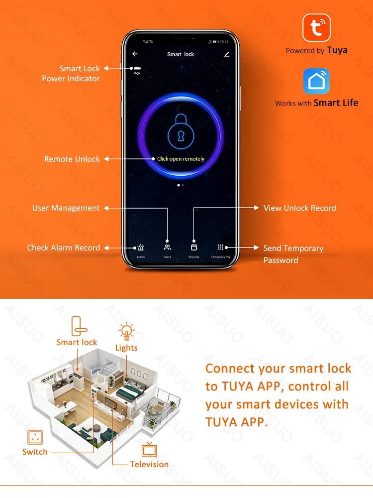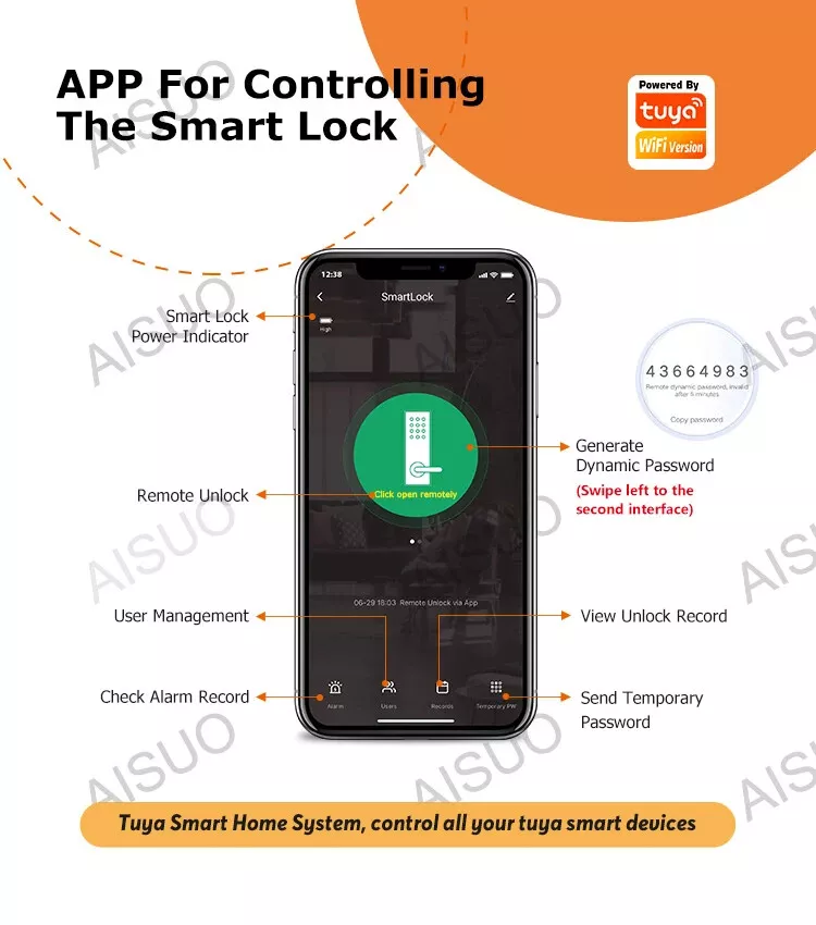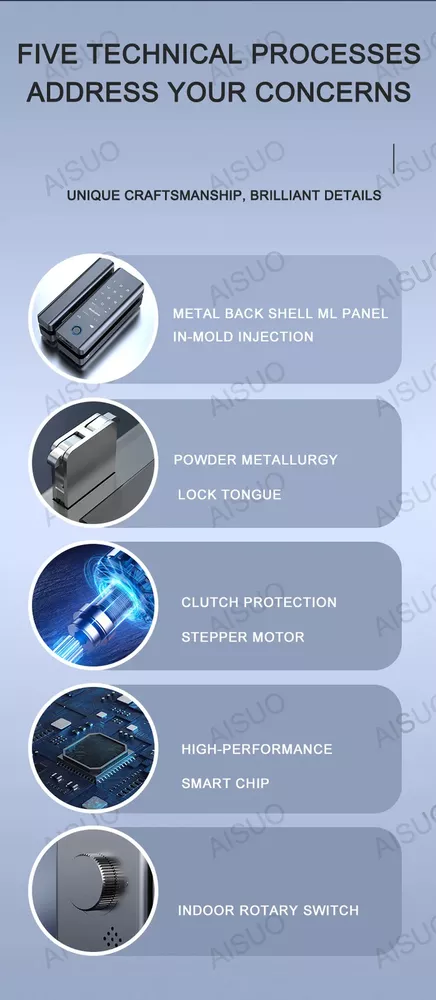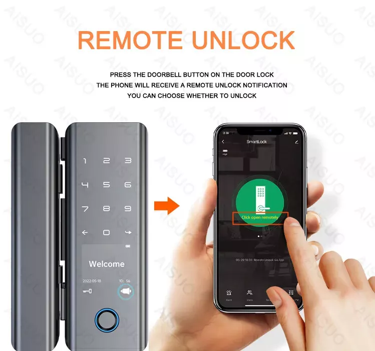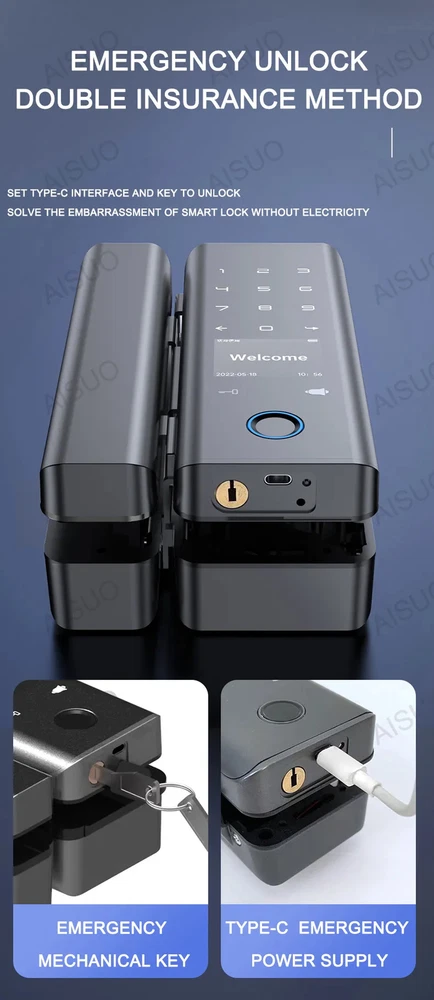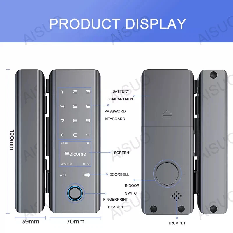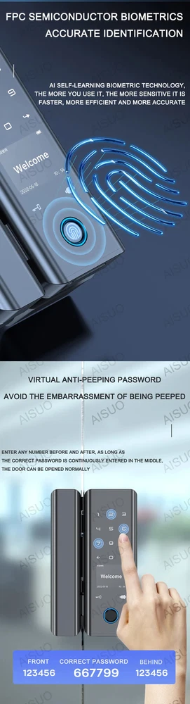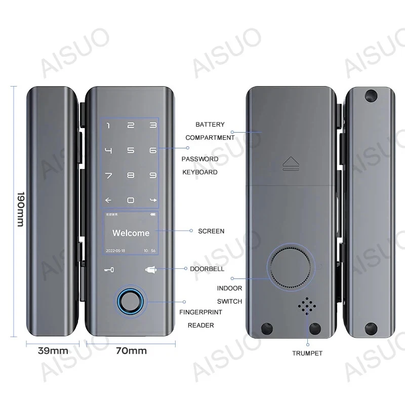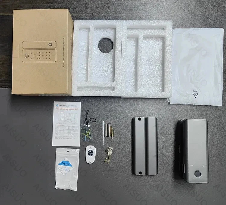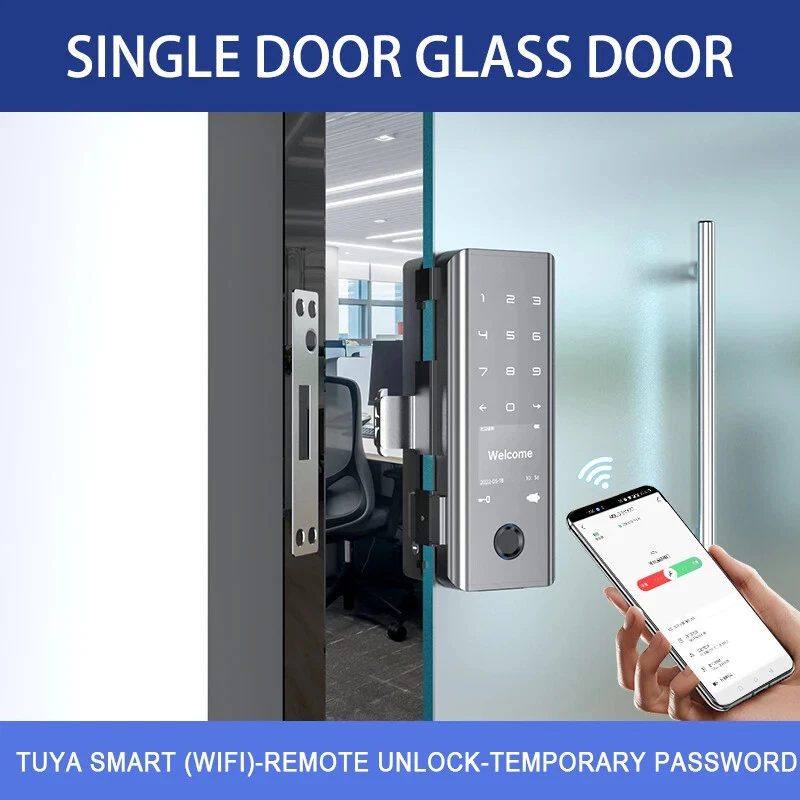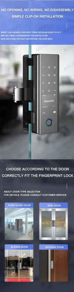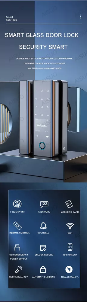 About installation Both forward and reverse can be installed. If you can't judge, please contact customer service, because the sticky board cannot be used twice Product parameters 1. Color: gray 2. Fingerprint capacity: 100 3. Magnetic card capacity: 250 pieces 4. Password capacity: 250 5. Recognition speed: 0.3S 6. Working voltage: 4.5V-6.8V 7. Low voltage prompt: 4.5V 8. Working temperature: -20°C-60°C 9. Emergency power interface: Type-C interface 10. Panel material: aviation grade magnesium aluminum alloy 11. Fingerprint reader: Swedish FPC semiconductor fingerprint acquisition module 12. Installation environment: glass doors, framed glass doors, wooden doors, copper doors, etc. 13. Remote control recognition distance: 20m 14. Application ①: Tuya Smart (WIFI) 15. Application ②: DA DA LOCK (Bluetooth) 16. Function: application + fingerprint + magnetic card + password + key 17. Shopping option ①: Glass door with frame, this option is installed on the glass door with metal frame, so there is no sticky board, and it needs to be drilled for installation. Shopping option ②: standard pure glass door, this option is installed on the pure glass door, with adhesive plate, can be installed directly without drilling, but it is only limited to the pure glass door. Shopping option ③: single-sided glass door, this option is installed in half glass door, half wall environment, without auxiliary lock body, the auxiliary lock body is replaced with the magnetic strip in the picture, and the magnetic strip also needs to be drilled. 18. Installation door thickness: 8mm-13mm TUYA Smart Program Work via WIFI (no gateway required), remote unlocking (touch the doorbell), temporary password (customizable time limit), information recording, door opening reminder DADA LOCK Work through Bluetooth, remote unlocking in Bluetooth range (without triggering), user management (add and delete user information), temporary password (customizable time limit), read operation records, authorize others to manage, set automatic lock time, set normally open mode , support Bluetooth attendance, APP can directly retrieve user attendance records Five major mechanical processes Installation Environment You can choose forward or reverse installation, switch at will, please pay attention to the difference in the installation environment when choosing the purchase item, because different installation environments have different accessories, if you choose the wrong installation environment, you will not be able to install Emergency measures Emergency mechanical key + emergency USB interface power supply, no need to worry about emergencies Product Size list of items Front panel*1 Auxiliary lock body * 1 (single-sided glass door without auxiliary lock body, it becomes a magnetic strip) Adhesive board*2 (the framed glass door is not equipped with adhesive board) Accessory bag*1 Magnetic card*2 key*2 English manual*1 Remote control*1 If you need more magnetic cards, please indicate the number of magnetic cards in the order, free gift (no more than 10) real shot About Logistics