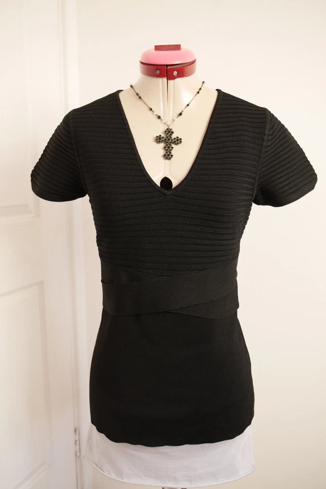 This gorgeous JUMPER has short, cap sleeves and a v-neckline. It is black, in a tight knit, with a textured ‘stripe’ pattern at the bust/sleeves, a crossover design at the waist, and a smooth knit for the rest. The style is ‘Black Mix Stitch Tie Knit’. It is from WITCHERY and is a size ‘XS’, which I have estimated to be a size 8, so please check the measurements below, to ensure a good fit. The approximate measurements are: Bust: 42cm Length: 62cm It is a viscose / nylon mix and needs a cold, hand wash. It is Brand New, With Tags (rrp $139.95). Lots of other information about this fabulous jumper can also be found in Item Specifics. A010 Please take a look at the tons of other gorgeous items I have available in your size! I love to combine postage and save you money! So if you are purchasing more than one item from me, please wait for me to send you a combined invoice, or press the 'Request a Total' button in your Cart before paying. I rate my items in the following way: BNWT / BNWOT: Brand New, With Tags or Brand New, Without Tags (some part of the tag will still be attached). New items that have never been worn. EXCELLENT: has been worn, but shows very few actual signs of wear. GOOD: has been worn and is showing light signs of wear. FAIR: has been worn and is showing more signs of wash/wear - or has a small fault, which will be clearly described in the listing I am only human and can make mistakes in my listings and descriptions - so if for any reason you are unhappy with your purchase, please contact me using the 'Contact Seller' button first, so we can quickly resolve the issue. This item comes from a SMOKE FREE HOME but the odd puppy hair may drift in due to the fact she is my darling shadow throughout the day.