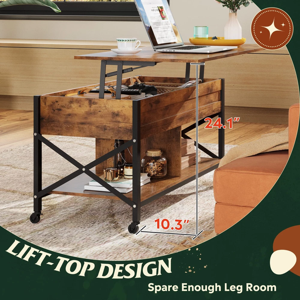 【LIFT-TOP Design】 Our coffee table features a sturdy lift-top design that effortlessly raises and lowers with stability and safety in mind. Crafted with a robust metal framework, it ensures durability while providing a secure platform for your belongings. 【Spacious Storage】With a hidden compartment and two open shelves, this coffee table offers plenty of room to stash away essentials. Whether it's laptops, books, or gaming gear, you'll find the storage both generous and reliable. 【Product Dimension】Measuring at 19.69"D x 41.34"W x 20.2"H, this table is just the right fit for your living space. Plus, it can handle up to 11 lbs on the lift top and a whopping 44 lbs in the hidden compartment, making it both practical and versatile. 【Sturdy and convenient】Crafted from high-quality MDF board and a robust metal frame, this coffee table is built to last. It features four caster wheels and four adjustable feet at the bottom, allowing for easy movement and protecting your floors from scratches. 【Easy to Install】With the included detailed assembly instructions, tools, and clearly marked parts, you can complete the installation in just 30 minutes. If you have any questions, our customer support is always here to help.