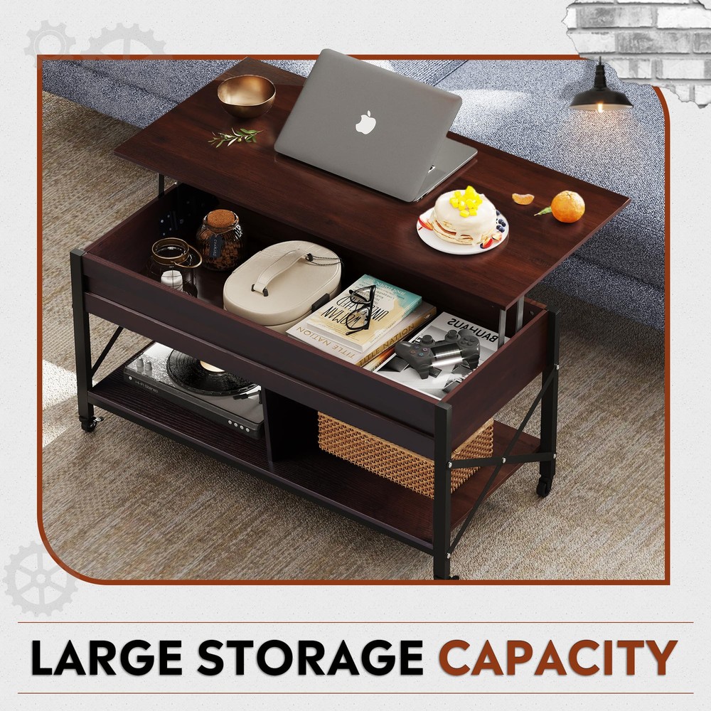 【LIFT-TOP Design】 Our coffee table features a sturdy lift-top design that effortlessly raises and lowers with stability and safety in mind. Crafted with a robust metal framework, it ensures durability while providing a secure platform for your belongings. 【Spacious Storage】With a hidden compartment and two open shelves, this coffee table offers plenty of room to stash away essentials. Whether it's laptops, books, or gaming gear, you'll find the storage both generous and reliable. 【Product Dimension】Measuring at 19.69"D x 41.34"W x 20.2"H, this table is just the right fit for your living space. Plus, it can handle up to 11 lbs on the lift top and a whopping 44 lbs in the hidden compartment, making it both practical and versatile. 【Sturdy and convenient】Crafted from high-quality MDF board and a robust metal frame, this coffee table is built to last. It features four caster wheels and four adjustable feet at the bottom, allowing for easy movement and protecting your floors from scratches. 【Easy to Install】With the included detailed assembly instructions, tools, and clearly marked parts, you can complete the installation in just 30 minutes. If you have any questions, our customer support is always here to help.