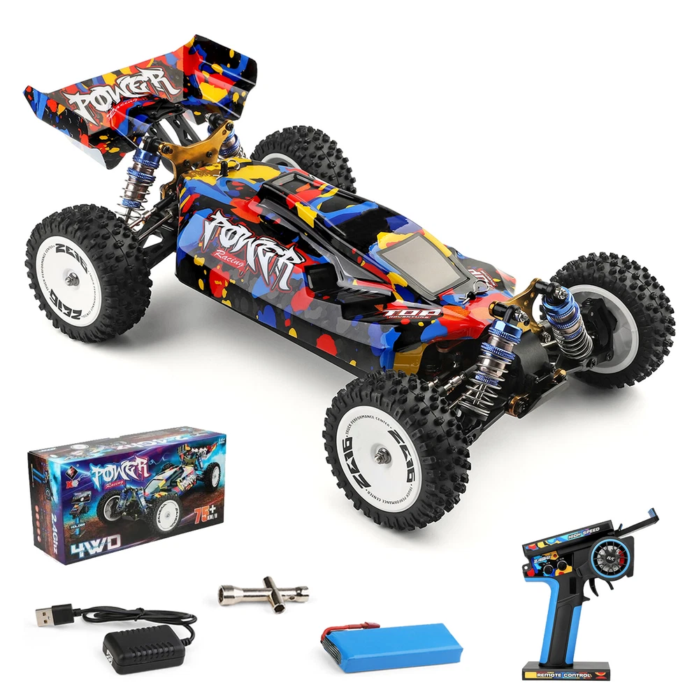 It adopts a 2.4G radio control system. With a high speed of 75km/h, you can enjoy the high-speed competition at the track or in your own backyard. This remote control car is a perfect to bring your kids to explore the field of automotive technology. It is a great gift to help your child's brain development. Anti explosion PVC color printing car shell, beautiful and collision resistant. Features: High-Speed Performance: Built-in super strong, powerful, and high-efficiency brushless motor makes the electric energy converted into power maximally and the running speed is up to 75km/h. 2.4G Remote Control Frequency: 2.4GHz Radio System with anti-jamming capability allows us to race at the same time on the same track. The control distance is up to 100 meters. High Quality Accessories: Four wheel independent suspension system, simulating hardware oil shock absorption, all zinc alloy gear, strong wear resistance, and improved gear service life. Integrated Mobile Phone Holder: In order to facilitate the external camera to achieve real-time control vision, the remote control is equipped with a built-in mobile phone bracket for smooth play. Conquer Various Terrains: Four huge anti-slip wheels connected by shockproof springs are terribly stable. It is easy to adapt to rough terrains such as beach, snow, grass, mountain road, and rock road. Specifications: Brand: WLtoys XKS Model: 124007 Item Name: Off-road Car Scale: 1/12 Main Material: Alloy, PA, PVC Maximum Speed: 75km/h Frequency: 2.4GHz Battery: 7.4V 2200mAh Motor: Brushless Motor Charging Time: 3h Working Time: 8min Remote Control Distance: About 100 Meters Remote Controller Battery: 2*AA Battery(not Included) Size: 35.6*20.8*11cm Weight: 931g Note: * Don't over-charge or over-discharge batteries. Don't put it beside the high-temperature condition. Don't throw it into the fire. Don't throw it into the water. * There could be some deviations due to manual measurement or slight color difference owing to photographing condition. Thank you for your understanding. Package Information: Package Size: 46.2*22.8*15.5cm Package Weight: 2233g Gift Box Package Package List: 1 * Remote Control Car 1 * Remote Controller 1 * Battery 1 * Charging Cable 1 * Cross Wrench More offers, more surprises