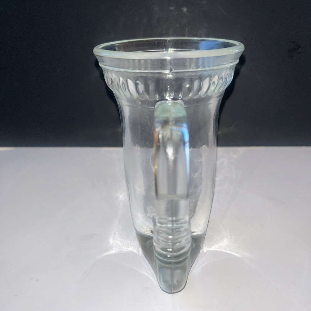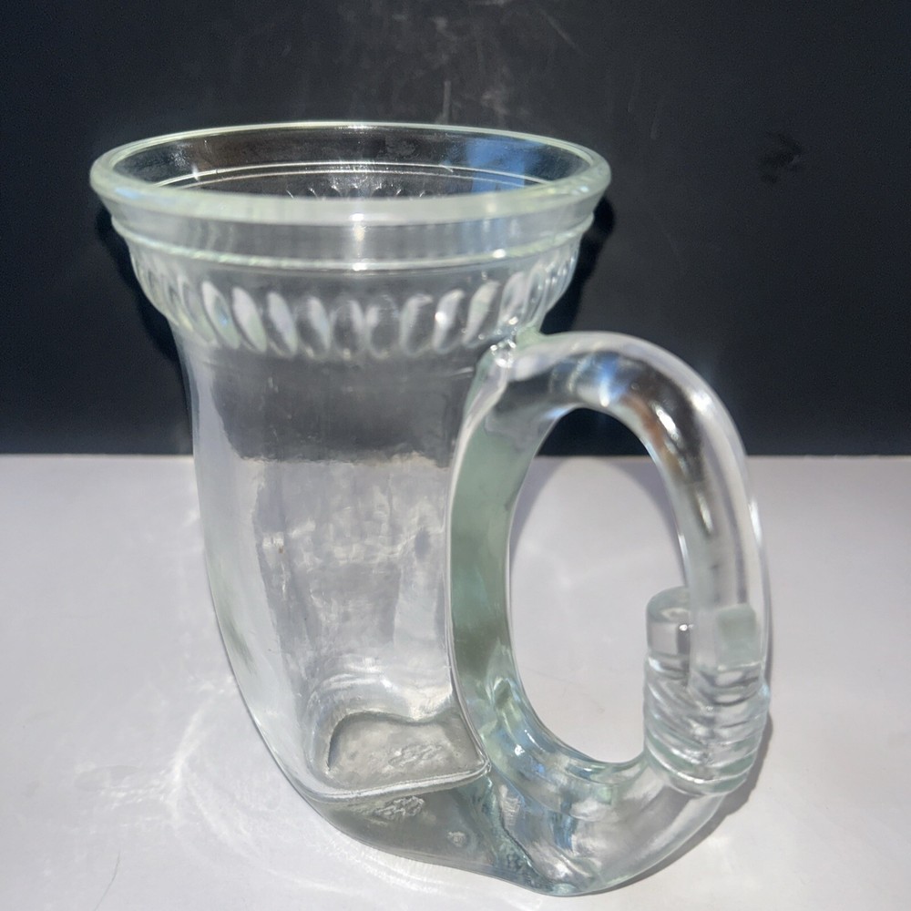 The WMF German Clear Horn Glass Mug is a classic two-piece beer stein with a curved inward design, standing at 5.75 inches tall and holding 12 oz of liquid. Made of break-resistant glass, this thick vintage-style mug is perfect for all occasions and features a horn-like shape reminiscent of traditional German barware. The WMF brand ensures quality and craftsmanship, making this mug a stylish addition to any barware collection for adult entertaining. kk43150