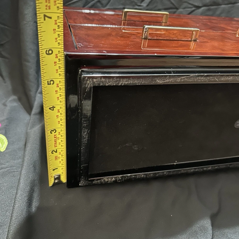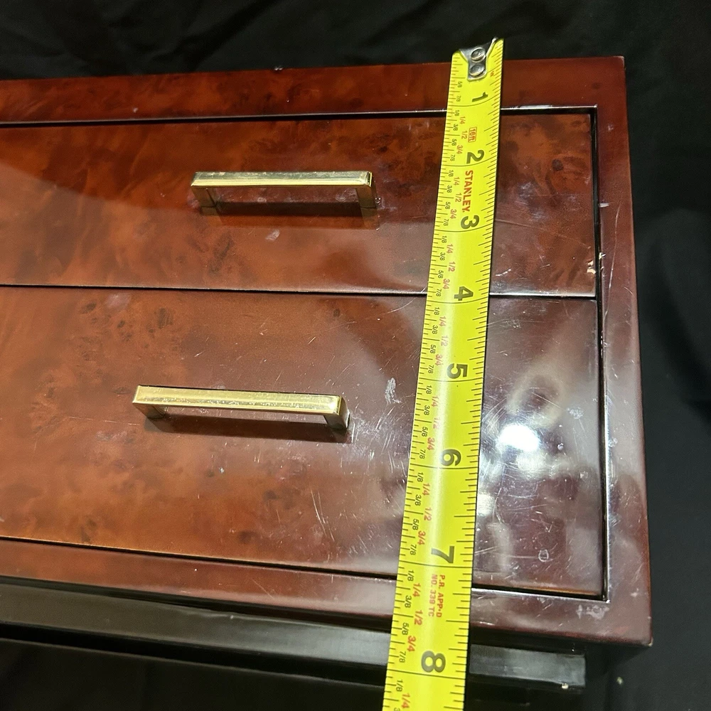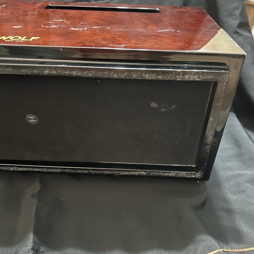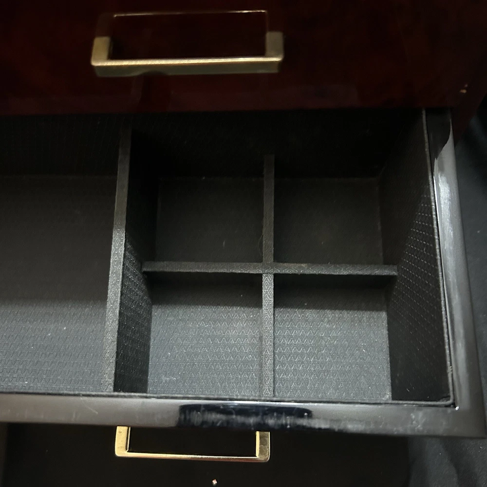 WOLF Meridian 2 Drawer Valet with Charging Station & Pen Box 15in Reddish Brown 15 x 8 x 6 The charging station is a hole in the back through where you can set your phone to charge. You will be receiving exactly what you see in pictures Good used condition. There are several little imperfections from use and aging such as scratches and some small chips. One of the compartments’ dividers is loose but it works perfectly. Please study pictures carefully before purchasing. Feel free to ask us any questions. Thank you for visiting our store!