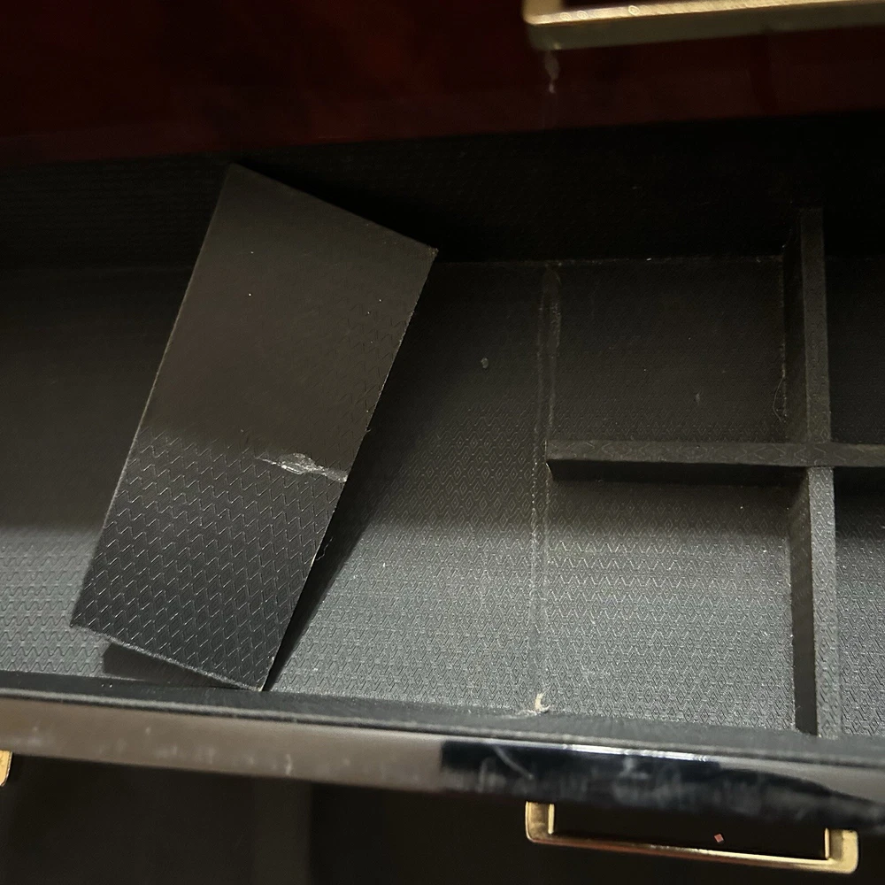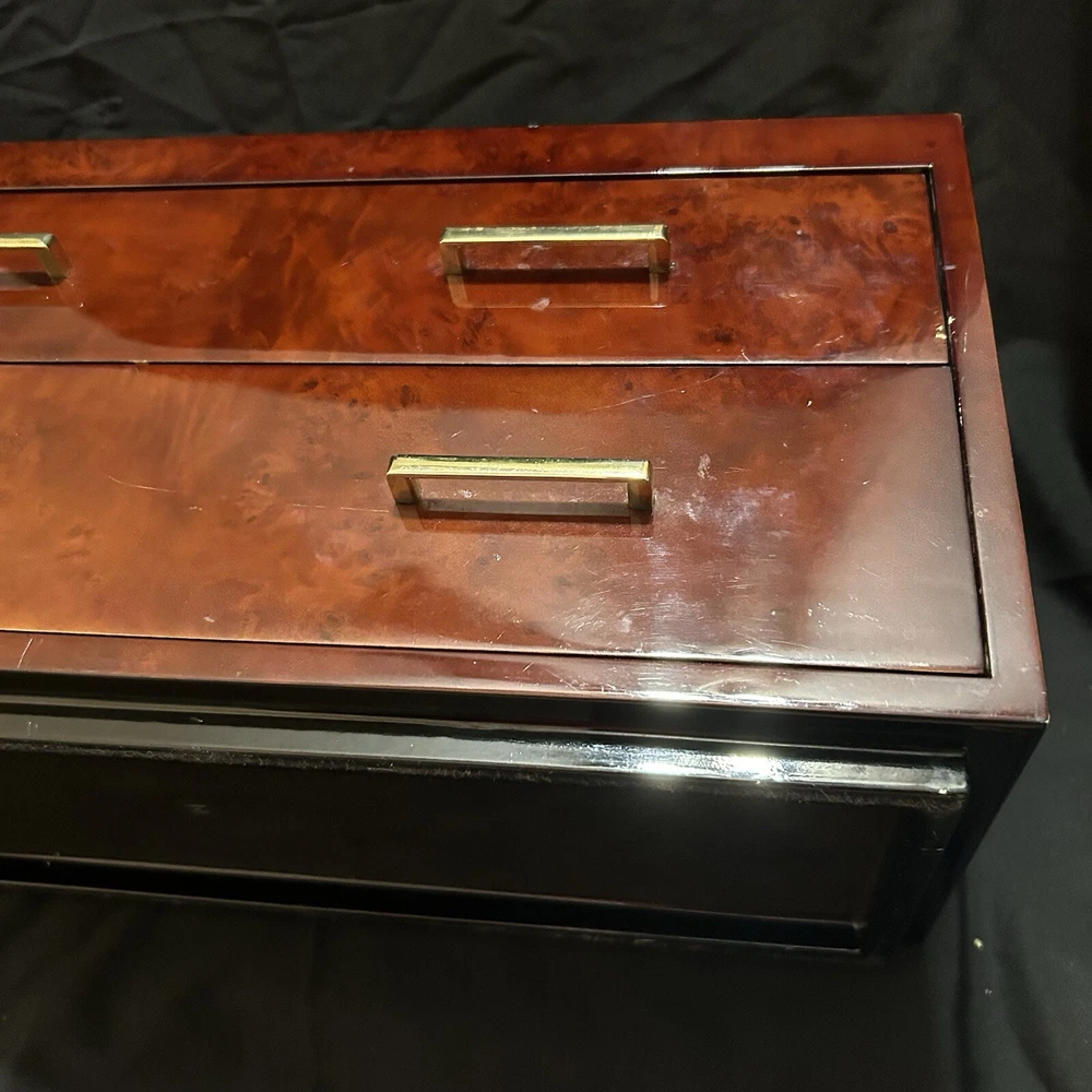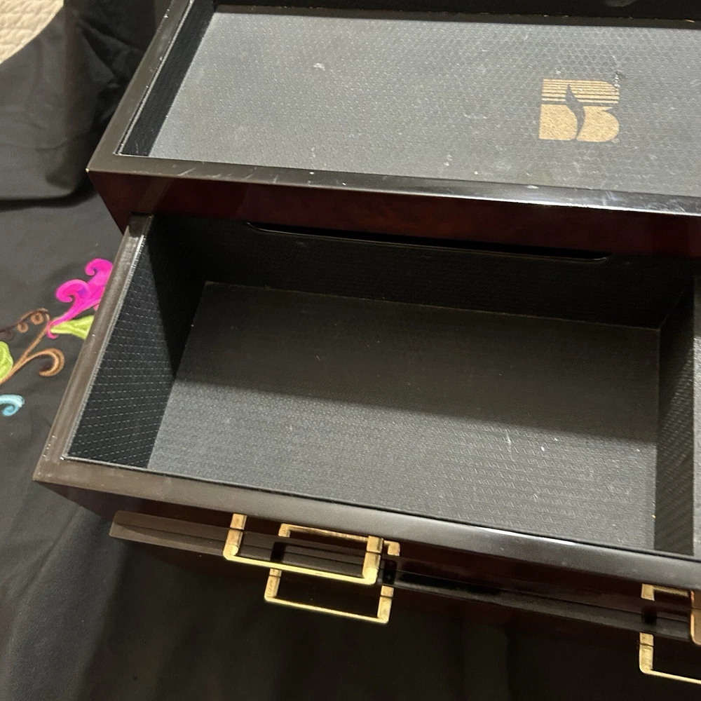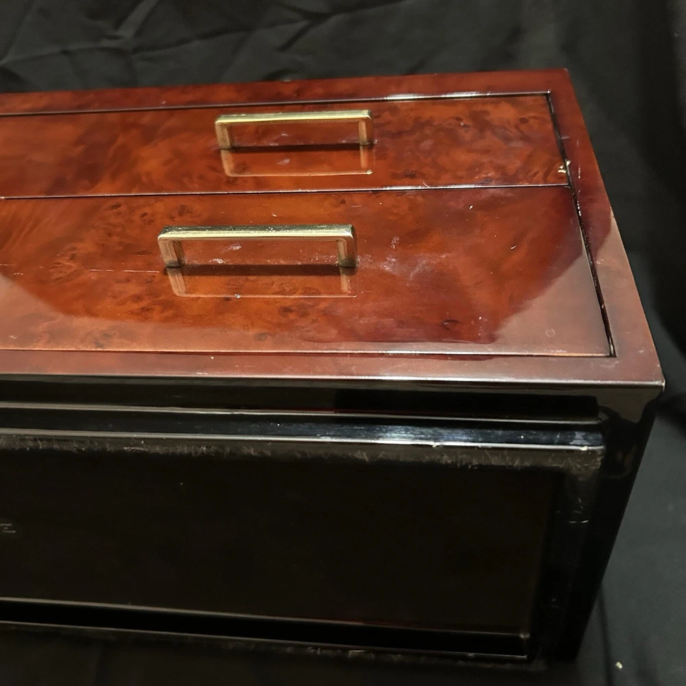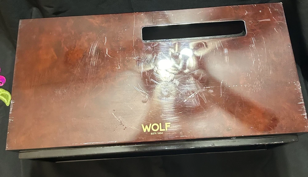 WOLF Meridian 2 Drawer Valet with Charging Station & Pen Box 15in Reddish Brown 15 x 8 x 6 The charging station is a hole in the back through where you can set your phone to charge. You will be receiving exactly what you see in pictures Good used condition. There are several little imperfections from use and aging such as scratches and some small chips. One of the compartments’ dividers is loose but it works perfectly. Please study pictures carefully before purchasing. Feel free to ask us any questions. Thank you for visiting our store!