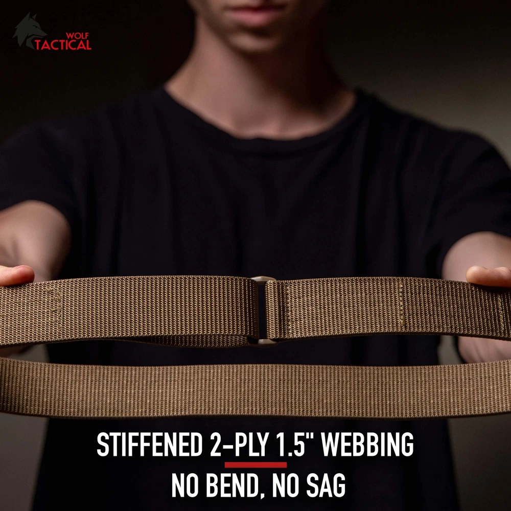 【BUILT FOR CONCEALED CARRY】★ Featuring stiffened 2-ply nylon webbing to support IWB and OWB holsters without rolling over, our EDC belt provides a safe and reliable foundation for CCW. Firmly attach your holster, mags, and pouches whether you’re at the range or carry every day. NO BEND, NO SAG. 【SIMPLE LOW-PROFILE BUCKLE】★ The super slim polymer buckle gives our belt a sleek, low-profile look, and is perfect for AIWB appendix carry. Velcro hook and loop secures the running end to make sure your belt stays cinched and will never slip. Our tactical belt is perfect for military, law enforcement, first responders, hunting, wilderness and outdoor survival. 【PREMIUM HEAVY DUTY MATERIALS】★ Crafted with two layers of rugged, rip-resistant 1.5” nylon webbing reinforced for added rigidity, our gun belt will withstand even the most extreme conditions. Whether you use our belt for everyday carry, tactical training, or outdoor sports, Wolf Tactical ensures that you stay ready. 【COMFORTABLE AND ADJUSTABLE】★ For an EDC belt, comfort and fit are king. Double-layer nylon webbing makes the perfect combination of rigidity and comfort. No holes in the belt means you can fully adjust for a custom fit according to the firearm, gear, and accessories you’re carrying. 【TRUSTED WOLF TACTICAL QUALITY】 ★ Wolf Tactical gear is crafted for those who conquer challenges and never settle for less. Proudly based in the USA, our products embody determination, unity, and an unyielding drive for excellence. Equip yourself with gear designed to empower a lifestyle of resilience and achievement. Shop with confidence.
