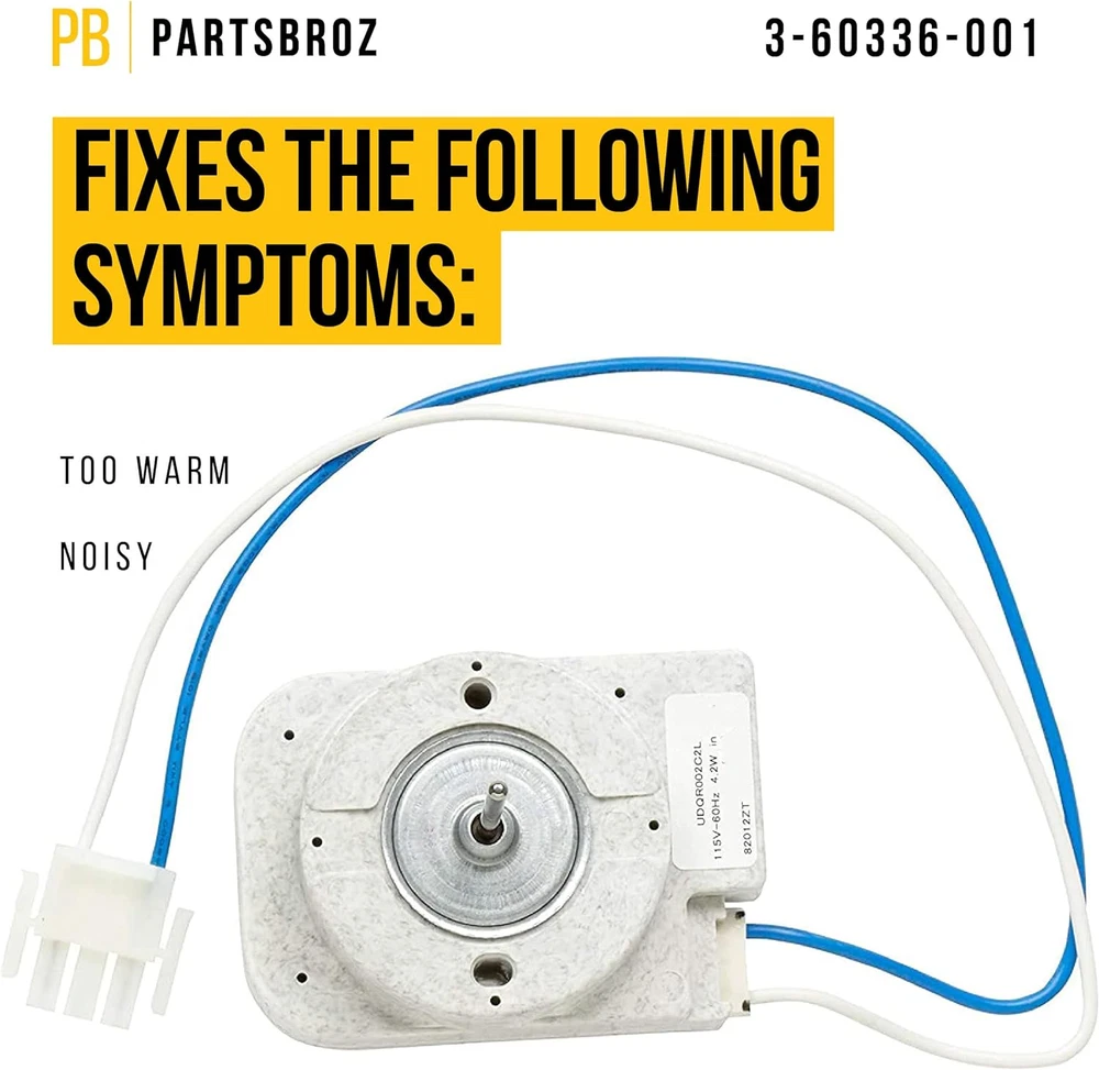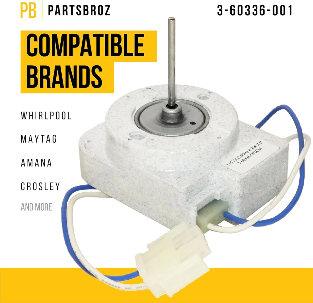 The WP3-60336-001 Evaporator Fan Motor is a direct replacement for part numbers WP3-60336-001, AP6007509, 3-60336-001, 1621561, 4390914, 68001613, and PS11740626, the perfect fit for your refrigerator. The WP3-60336-001 Evaporator Fan Motor is compatible with Whirlpool WP3-60336-001 and also compatitable with Maytag, Amana, and Crosley Refrigerators, offering wide compatibility for your convenience. The refrigerator is experiencing issues like being noisy and too warm, indicating a need to replace the WP3-60336-001 Fan Motor. Replacing it can restore cooling and quiet operation. High-Quality Materials: Our replacement parts are crafted from premium materials to ensure durability and long-lasting performance, providing you with reliable solutions for your home appliances. Wide Compatibility: Designed to fit a variety of popular home appliance models, our replacement parts offer a convenient and versatile solution to keep your appliances in top working condition. Product Description How to replace a WP3-60336-001 Evaporator Fan Motor? Replacing a WP3-60336-001 Evaporator Fan Motor involves several steps. Here's a general guide to help you: Turn off the power to the refrigerator: Before you start the repair process, it's crucial to unplug the refrigerator or turn off the power supply to avoid electric shock. Remove the back panel of the freezer: Locate the back panel of the freezer, usually at the rear of the unit, and remove it. You may need to use a screwdriver or socket wrench to unscrew the bolts holding the panel in place. Remove the old fan motor: Once you've gained access to the fan motor, unplug its wiring harness and remove any screws or bolts holding it in place. Take note of how the fan blade is attached to the motor shaft, as you will need to reattach it to the new motor. Install the new fan motor: Install the new fan motor by securing it with the screws or bolts you removed in step 3. Reattach the fan blade to the motor shaft in the same orientation as before. Reconnect the wiring harness: Reconnect the wiring harness to the new fan motor, ensuring that it's securely plugged in. Replace the back panel: Once you've completed the installation of the new fan motor, replace the back panel of the freezer and secure it with the screws or bolts you removed earlier. Turn on the power: Finally, turn the power supply back on or plug in the refrigerator and test the new fan motor to ensure that it's functioning correctly. It's important to note that the steps above are general and may vary slightly depending on the make and model of your refrigerator. General tips to help you finish your DIY repair safely as soon as possible Wear work gloves . DIY project something can be a messy, intensive process, and it is important to take safety precautions to avoid cuts and injury. One of the best ways to do this is by wearing gloves whenever you are working on a home repair. It will help protect your hands from sharp objects, debris, and other potential hazards. Clean up any spills or messes immediately . Cleaning up spills and messes is important during a home improvement project because it helps prevent damage to the device or equipment. Spills of liquids like oil, water, or cleaning solutions can get into sensitive electrical components, causing corrosion and other dangerous problems. Disconnect appliances when not in use . It can help reduce the risk of electrical shock or other injuries. Additionally, it can minimize the risk of damage to the appliance, which can save you time and money in the long run. Finally, it can help minimize energy consumption, which is important for reducing your carbon footprint. Our brand produces parts that: Can be easily installed and removed Are fully compatible with most major brands Meet all OEM standards, while taking care of your budget Will make your appliance work like a new one WP3-60336-001 3-60336-001 Evaporator Fan Motor High-quality replacement part for a quick DIY This part will help if: Appliance is noisy Appliance is too warm PART NUMBER 3-60336-001: It's a high-quality exact equivalent for part numbers AP6007509, 4390914, 68001613, PS11740626, WP3-60336-001. COMPATIBLE BRANDS INCLUDE: Whirlpool, Amana, Crosley, Maytag. COMPATIBLE WITH PRODUCT TYPE: Freezer, Refrigerator. Compatible with Whirlpool : DUF570WDD01, EL7JWKLMQ02, EL7JWKLMQ03, EL7JWKLMQ04, EL7JWKLMS02, EL7JWKLMS03, EL7JWKLMS04, EL88TRRWQ01, EL88TRRWQ02, EL88TRRWS01, EL88TRRWS02, EV160NZTQ00, EV160NZTQ01, EV161NZRQ00, EV161NZRQ02, EV161NZRQ04, EV161NZRQ05, EV161NZTQ00, EV161NZTQ01, EV165NXTN00, EV171NYMQ00, EV171NYMQ01, EV171NYMQ02, EV171NYMQ03, EV171NYMQ04, EV171NYMQ05, EV171NYMS00, EV171NYMS01, EV171NYMS02, EV171NYMS03, EV171NYMS04, EV171NYMS05, EV181NZTQ01, EV181NZTQ02, EV188NYWQ00, EV188NYWQ01, EV188NYWS00, EV188NYWS01, EV188NYWV00, EV200NZTQ00, EV200NZTQ01, EV201NXMQ00, EV201NXMQ01, EV201NXMQ02, EV201NXMQ03, EV201NXMQ04, EV201NXMQ05, EV201NZRQ00, EV201NZRQ01, EV201NZRQ04, EV201NZRQ07, EV201NZTQ00, EV201NZTQ01, EV201NZTQ02, EV205NXTN00, EV205NXTN01, EV205NXTN02, EV205NZTQ00, EV209NBTN00, EV209NBTQ00, EV209NBTQ01, EVL165NXRQ00, EVL165NXRQ03, EVL165NXRQ04, EVL201NXRQ00, EVL201NXRQ01, EVL201NXRQ04, EVL201NXRQ05, EVL201NXRQ06, EVL202NXTN00, EVL202NXTN01, EVL202NXTN02, EVL209NBTQ00. Compatible with Maytag : MQF1656TEW00, MQF1656TEW01, MQF2056TEW00, MQF2056TEW01, MQU1556AEW, MQU1656BEW, MQU2057AEW, MQU2057BEW. Compatible with Crosley : WCF15E, WCF16W3, WCF17ER, WCF20E. Compatible with Amana : AQF1613TEW03, AQF1613TEW04, AQF2013TEW03, AQF2013TEW04. ATTENTION : This is not a complete list of compatible models. You are welcome to reach our support if you are not sure about the compatibility of your appliance. Fast Search Find your parts in a quick and simple way. Search symptoms of your broken appliance or ask for our advice! DIY Quick Fix Our appliance parts will help you to make a fast replacement for your refrigerator & freezer . Simple manipulations will help you to fix everything within fe