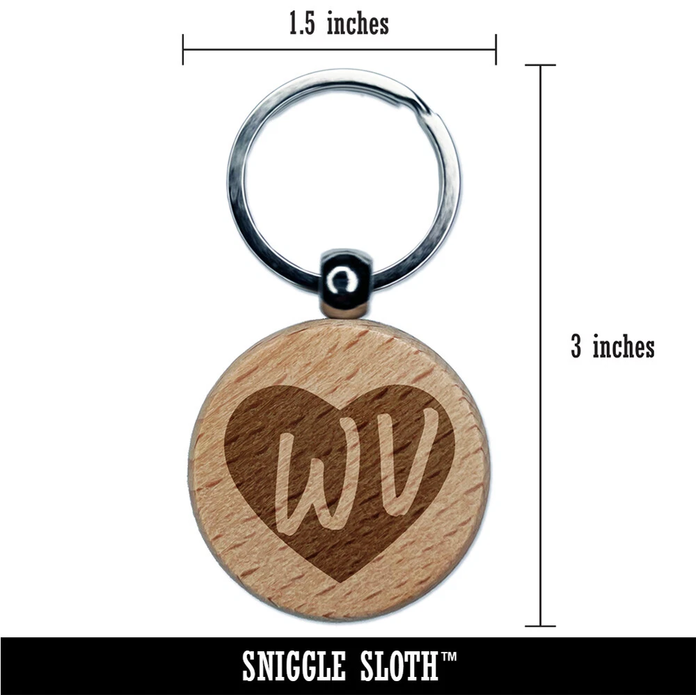 WV West Virginia State in Heart Engraved Wood Round Keychain Tag Charm