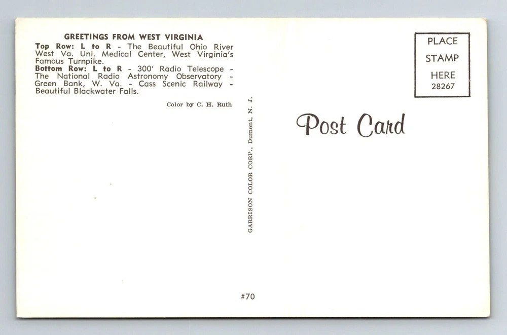 Region: West Virginia Unit of Sale: Single Unit Original/Licensed Reprint: Original Type: Printed (Lithograph) Country/Region of Manufacture: United States Postage Condition: Unposted Era: Chrome Country: USA City: West Virginia Theme: Cities & Towns Subject: Cities & Towns Continent: North America