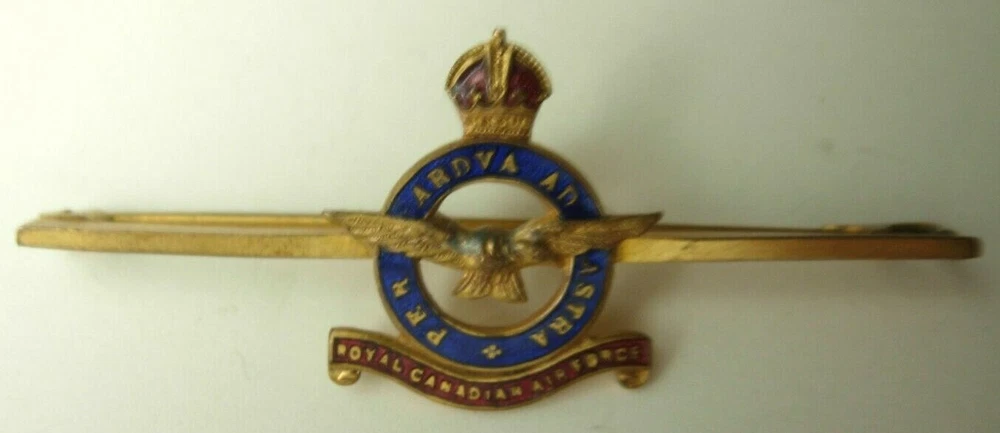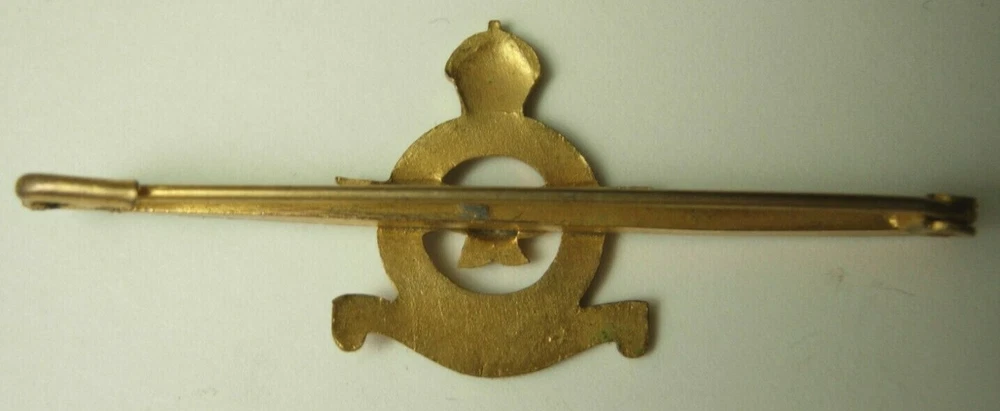 World War Two Royal Air Force sweet Heart pin. Made in a gold plated brass metal base. The RAF crest is enameled in red and blue. The enameled crest was applied to the 2 1/4 inch bar. Pin back with a simple safety pin type of pin catch.
