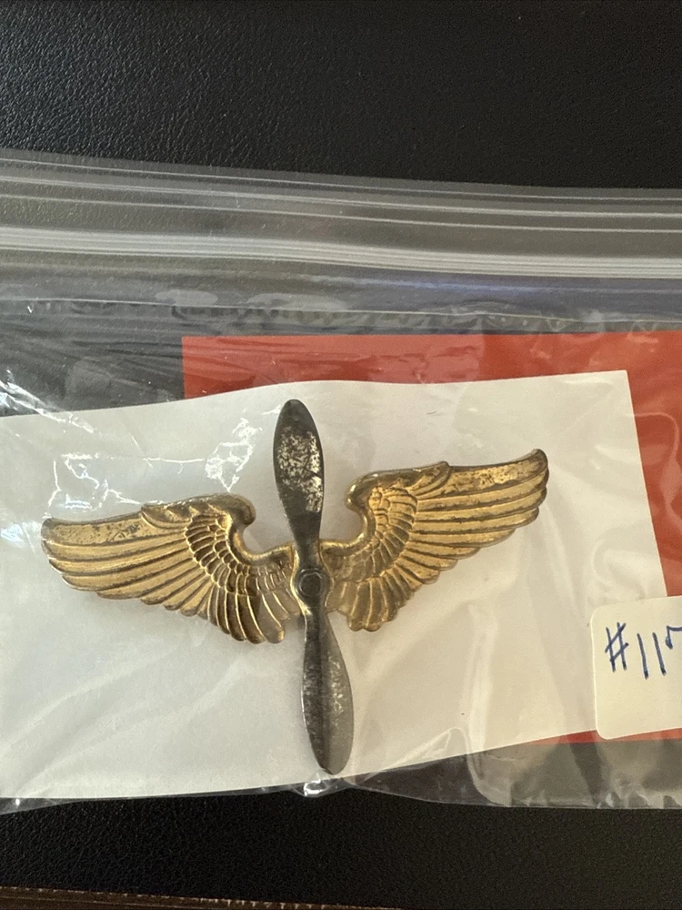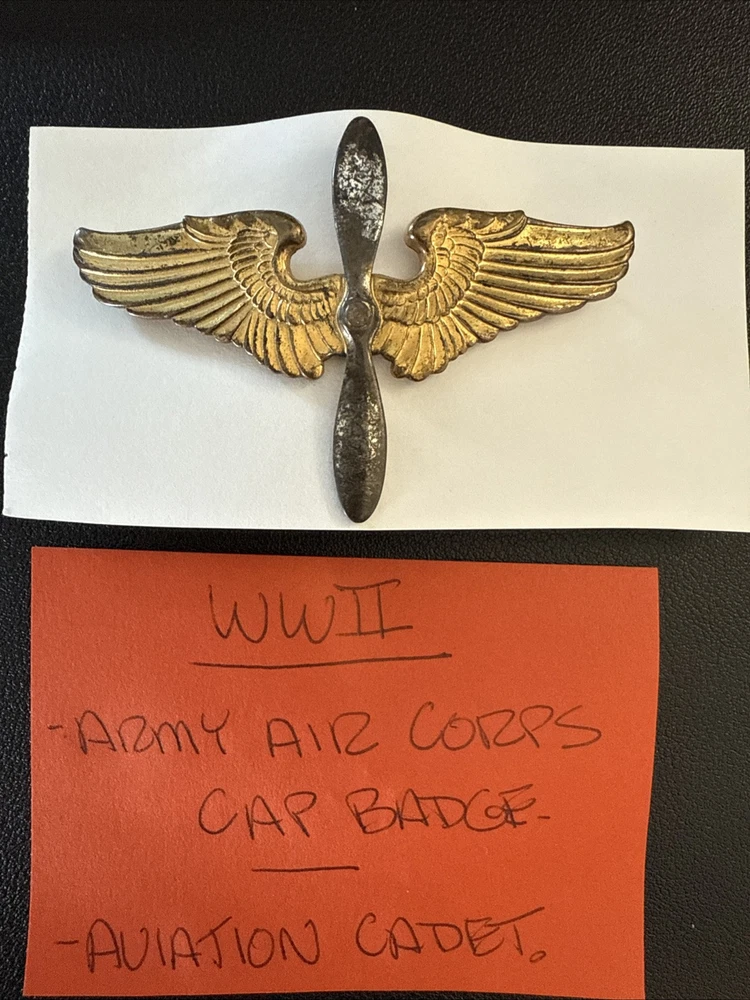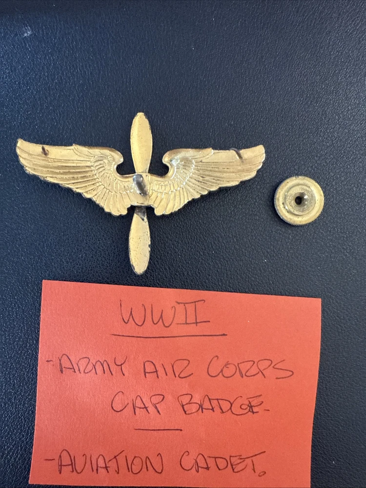 This is an original WW2 US Army Air Corps Cadet Cap Badge marked "Sterling" on the backside wings. It falls under the theme of Militaria and was manufactured in the United States during the World War II period (1939-45).