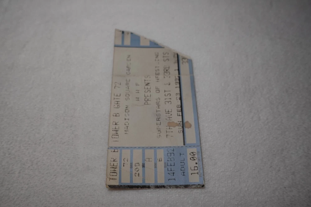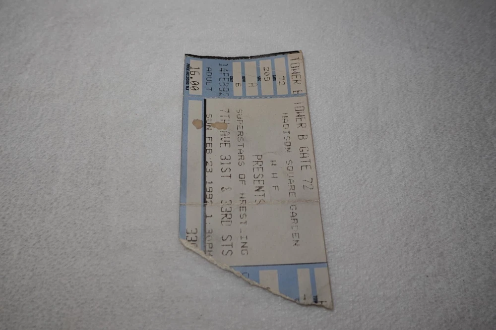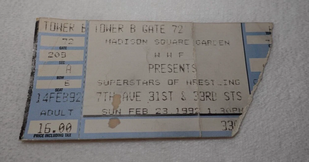 WWF Madison Square Garden 2/23/1992 MSG Sid Hogan Undertaker Rare Original Wrestling Ticket Stub Measures approximately 2" x 3 7/8". Right edge is uneven where it was torn. Ticket was folded at one time. There is staining, heavy creasing, discoloration, marks and writing on the reverse side in ink. Please see photos for more information on condition and ask any questions you may have.