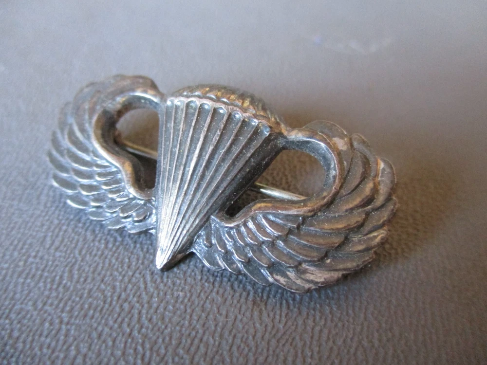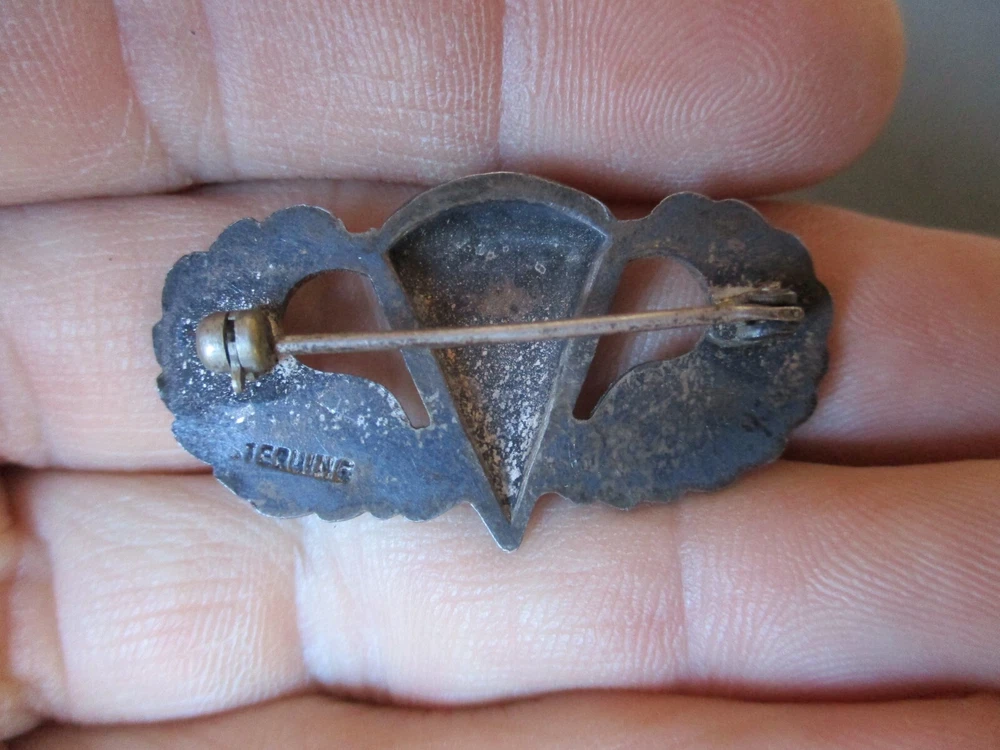 WWII Pin Back Sterling Silver PARATROOPER JUMP WINGS #2 These are cool jump wings that I don't know anything about. They are marked sterling, but I don't see any other marks.