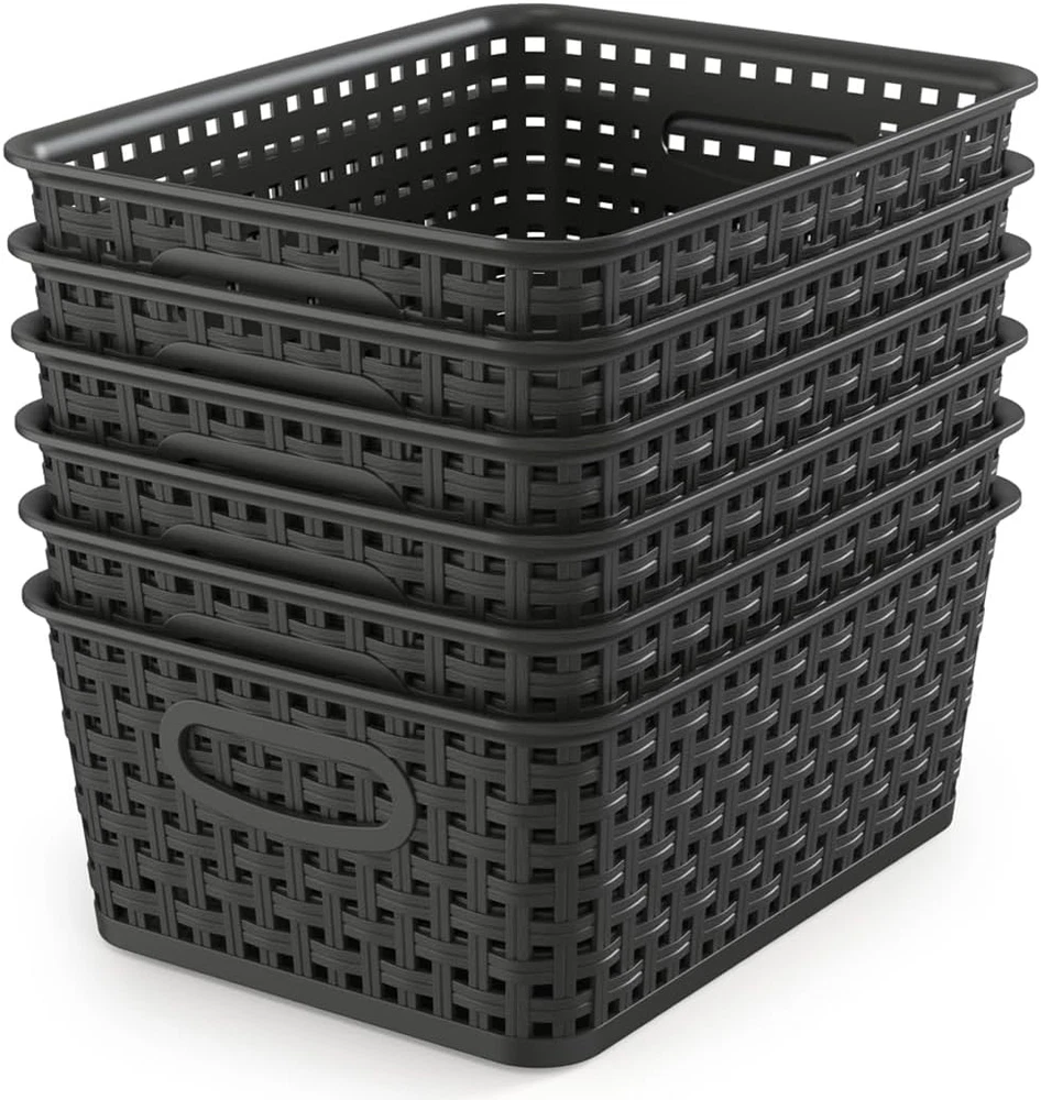 6 pack black plastic organizer basket, weave wicker storage organizer basket, perfect to service for kitchen/ bathroom/ classroom and so on, outside dimensions: 10" length x 7.5" width x 4" height Simplify plastic storage baskets are hassle-free stack able when not in use for maximum space utilization, and its combined tote allow you to move them with ease. Take it wherever you need storage. For convenient storage basket that are built with the sturdiness to give you years of service . The basket durable translucent plastic body with wicker design are built to last from premium grade materials The polypropylene plastic wicker storage basket are great for clothing, linens, bath and beauty products, magazines, etc. Versatile design and features to organize any space in your home, dorm room or office We adhere to the best product delivery and the most uncompromising quality. The trust placed by our discerning customers earned over the years. Fulfillment of our customer's need are core of our vision.