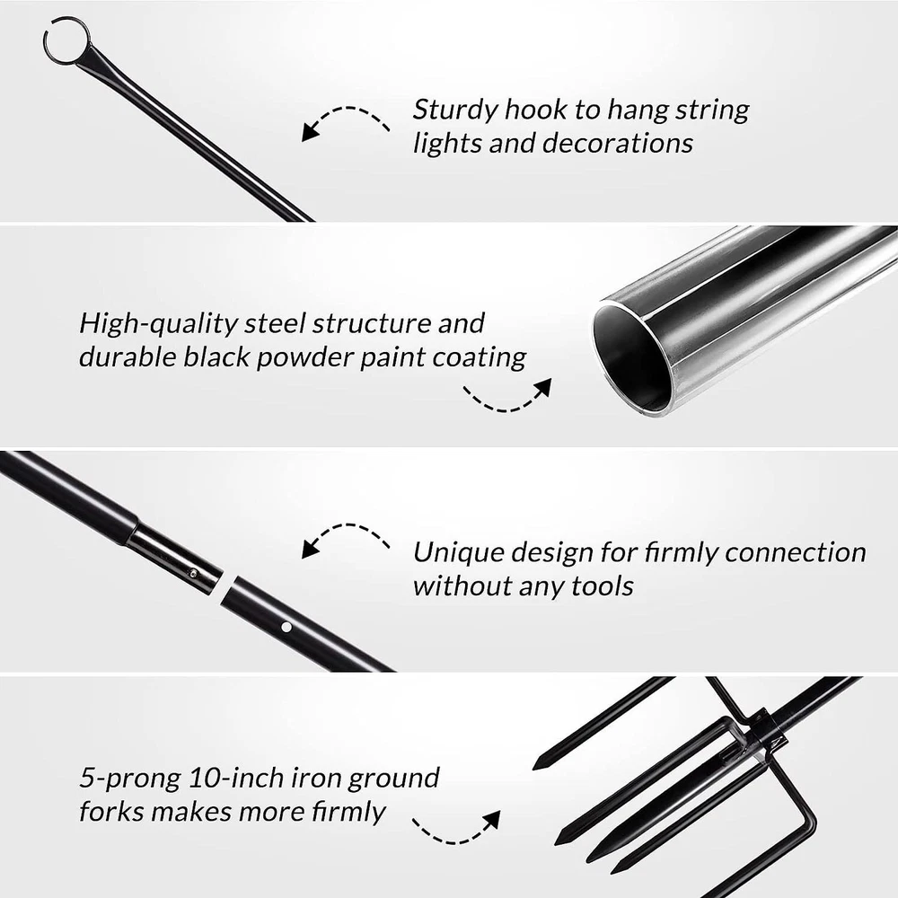 UNIQUE DESIGN: Walensee String lights pole is designed with incorporate 5-prong 10-inch solid iron ground forks, which can stand on the ground more firmly than the ordinary Trident base, prevents it from bending, breaking or wobbling by the wind. Stability has been greatly improved. Our outdoor lighting poles can improve the most problem "unstable, easy to tilt" which exists in most similar products. No flimsy parts, easy install. PLEASE NOTE: If the earth is TOO HARD, please WATER it properly. EASY ASSEMBLE: Walensee Outdoor Light Poles is made of 2 high-quality 4.8FT steel pipe with 1.2mm thick steel pipe and 5 solid anchor points. The metal hanger can be installed as long as the two sections of steel pipe are screwed together, don't need any tool. Just plant the bottom pole into the Free Shipping Over $49.99* Details WaLensee 9.4 FT String Light Poles with Hook for Hanging String Lights for Product Description: UNIQUE DESIGN: Walensee String lights pole is designed with incorporate 5-prong 10-inch solid iron ground forks, which can stand on the ground more firmly than the ordinary Trident base, prevents it from bending, breaking or wobbling by the wind. Stability has been greatly improved. Our outdoor lighting poles can improve the most problem "unstable, easy to tilt" which exists in most similar products. No flimsy parts, easy install. PLEASE NOTEIf the earth is TOO HARD, please WATER it properly. EASY ASSEMBLE: Walensee Outdoor Light Poles is made of 2 high-quality 4.8FT steel pipe with 1.2mm thick steel pipe and 5 solid anchor points. The metal hanger can be installed as long as the two sections of steel pipe are screwed together, don't need any tool. Just plant the bottom pole into the ground by pressing the forked end into the dirt. The angle of its base can be rotated and adjusted to find the support point you want. No climbing ladder with this simple twist connection. Safe and Easy. HIGH QUALITY: The outdoor lights pole adopts high-quality steel structure and durable black powder paint coating, which has the characteristics of rust prevention and durability. We thicken the metal rod, 1" diameter wall thickness 1.2mm which not only improves the maximum bearing capacity, but also prolongs the service life. PLEASE NOTEWe do not recommend using it to hang item that exceed the weight limit. It is also not recommended to put this tool in soft soil which may cause overturning. WIDE APPLICATION: Walensee stylish patio light pole is suitable for any place. It can be used for your garden, courtyard, Christmas and Halloween party, birthday decoration and swimming pool party and Wedding. The stand holder can display all kinds of decoration, including hanging banners, Christmas lanterns, balloons, colored flags and paper decoration, wind chimes, ornaments, light-weight string light or bulbs or anything else you want to decorate! 100% SATISFACTION GUARANTEED If you are not completely satisfied with our string lights hole, you'll get every penny refunded to you, no questions asked.100% SATISFACTION GUARANTEED.