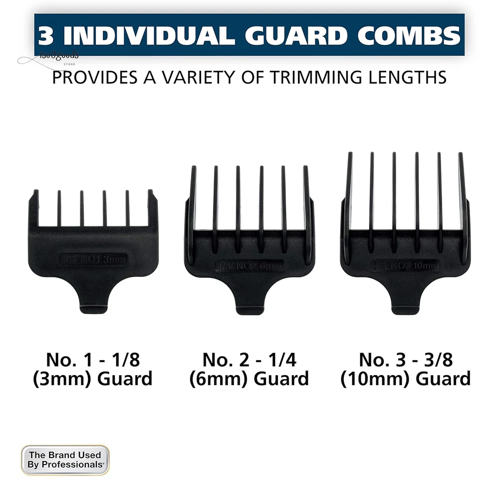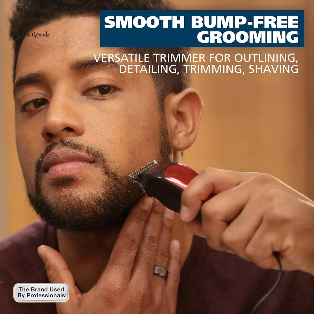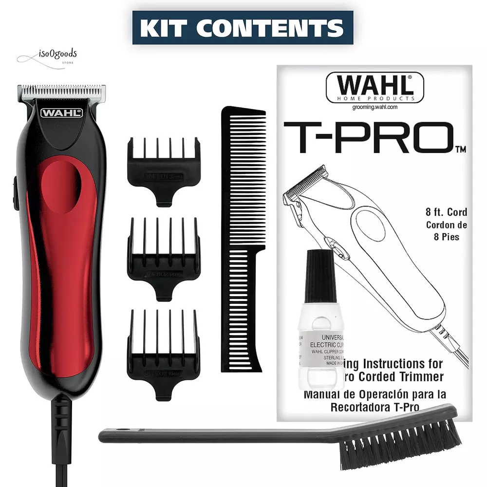 Bump Free Trimming – Our finely ground Diamond finished T Blades are bump free, durable, and stay sharp longer than traditional stamped blades Multipurpose – This trimmer enables you to do more than just trim your beard, you can detail, fade, and outline with this versatile beard trimmer High Quality Components – Corded power allows for extreme strength heavy duty cutting from our high power trimmer motor 3 Individual Beard Guards – This 7 piece trimmer kit features 3 individual beard guards from 1/8”, 1/4”, to 3/8”, a beard comb, and English and Spanish instructions The Brand Used by Professionals - Wahl clippers and trimmers have been used by professionals in the salon & barber industry since 1919; Featuring self-sharpening precision blades & quality construction The Wahl T-Pro Bump-Free hair trimmer for men designed to provide a seamless trimming experience. Equipped with finely ground diamond-finished T-blades, this beard trimmer for men ensures a bump-free beard-trimming session. The blades are crafted to stay sharp for extended periods, surpassing the longevity of traditional stamped blades. Inside this trimmer lies a high-quality combination of components, allowing for heavy-duty cutting and trimming. Its high-power trimmer motor ensures exceptional performance, enabling you to tackle even the toughest hair and beard grooming tasks. This mens hair trimmer goes beyond simple beard trimming. It empowers you to achieve precise detail trimming, and clipping, as well as effortless hair outlining, and detailing. With its versatility, you can style and maintain your facial hair and hairstyle. The 7-piece facial hair trimmer kit showcases a sleek red and black design. It includes three individual beard guards that vary in length, offering options of 1/8", 1/4", and 3/8" trims. The kit also features a convenient beard comb for grooming and styling, along with comprehensive instructions provided in both English and Spanish. The compact size of this trimmer allows it to be easily maneuvered, but also contains the power of a full size trimmer. This corded unit provides a constant stream of power and contains a USA plug. The Wahl uses a very powerful motor that delivers nearly 10,000 cycles per minute to the cutter head. This results in a very strong audible hum, but is completely normal to its operation. Don’t settle for a weak trimmer! Please note that each mens beard trimmer kit undergoes thorough testing for cutting performance prior to packaging, utilizing a hygienic fiber. While our utmost efforts are made to clean the product and remove any testing particles, there is a slight possibility that a few may remain. These particles are not hair and can be effortlessly wiped off, ensuring a hygienic and comfortable grooming experience. If you happen to get your blade wet make sure to dry it off completely and use Wahl Blade Oil to oil the blades. Upgrade your grooming routine with a Wahl Beard Trimmer for men. Experience precision, versatility, and durability in one sleek package.