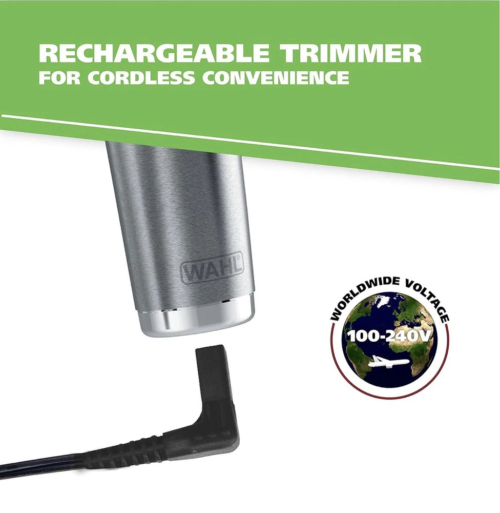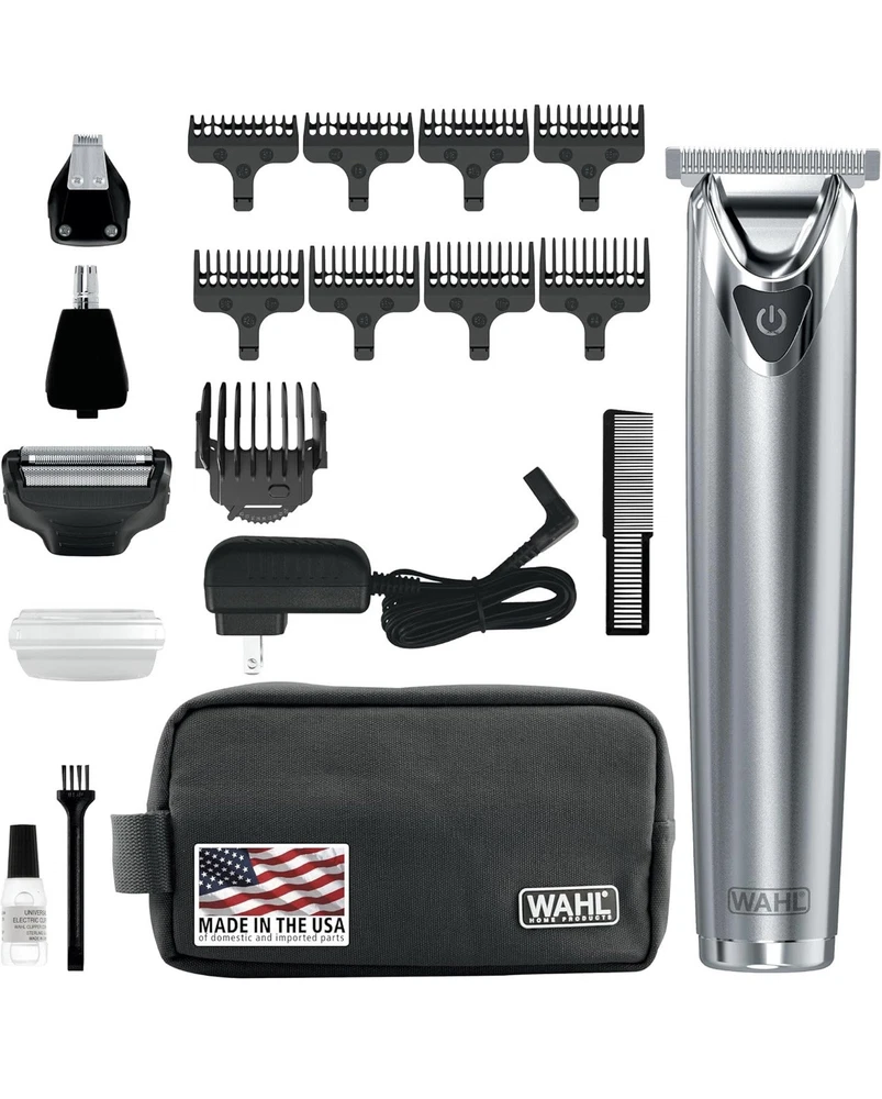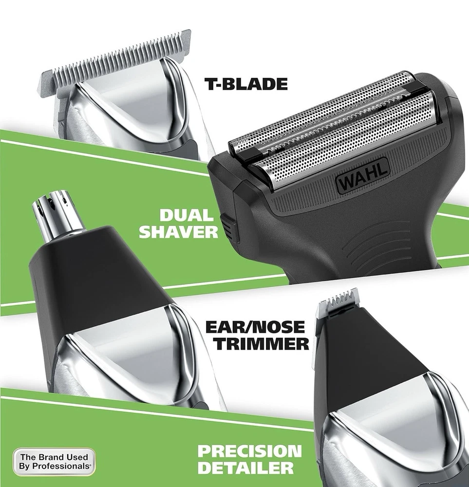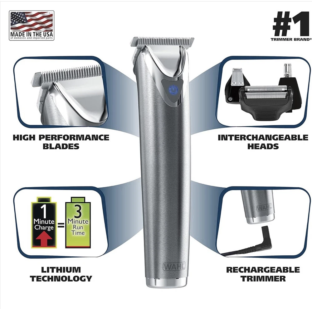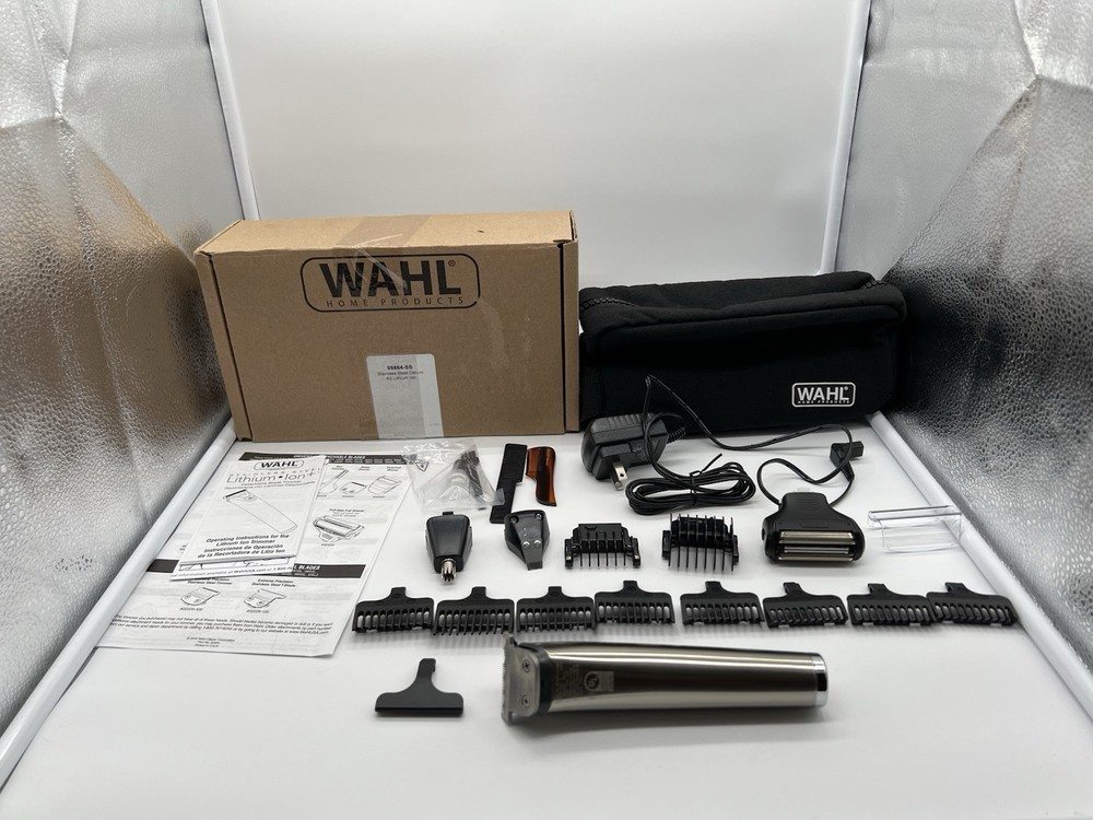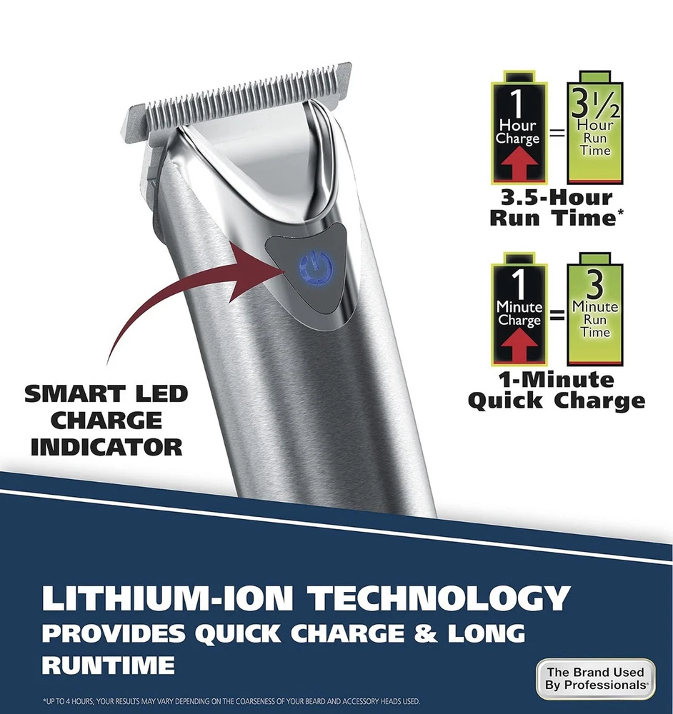 Wahl USA Stainless Steel Lithium Ion 2.0+ Beard Trimmer for Men -Electric Shaver. Used, Damaged Blade, others are brand new. Item: R4(15) All-in-One Beard Trimmer – Featuring 4 different attachment heads, a wide T-Blade for beards and mustache trimming, touchups, body grooming, and detailing. The precision detailer head is for details, clean up, and complex designs Hygienic Grooming – Our rotary ear and nose trimmer head provides a hygienic grooming experience by keeping your nose and ear trimming separate, and our dual foil shaver head is best for ultra-close shaves Months Without Charging – Lithium Ion 2.0 plus technology allows for 3.5 hours of continuous run time on a single charge for months of usage between charges. Our beard clipper features almost no loss of charge during storage 10 Individual Guide Combs – Stainless Steel Lithium Ion 2.0 plus allows for a wide variety of cutting lengths with included guide combs. Featuring 8 T-blade guide combs for haircuts from short (1/16”) to long (1/2”) and 2 10-position adjustable guide combs providing cutting lengths between 2mm-21mm Worldwide Voltage – With 3.5 hours of run time, our Lithium Ion 2.0 plus is great for travel, vacation, business trips, and more. Worldwide voltage means you can use no matter what country you’re in, 110v, 220v, or dual voltage