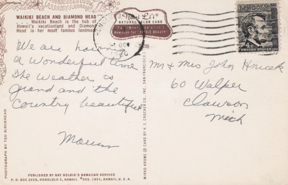 Waikiki and Diamond Head Waikiki Beach Honolulu Hawaii Postcard Posted 1966 Color Chrome Divided S-256 People Boats Caption: Waikiki and Diamond Head Publisher: Mirro-Krome ® Card by H.S. Crocker Co., Inc., San Francisco/Nani Li'i Natural Color Card/ Published by Ray Helbig's Hawaiian Service, Honolulu 3, Hawaii. Photographer: Ted Birckhead Postcard No. S-256 Postage Status: Posted Postmark Information: Oct 24 1966 Honolulu Hawaii Dimensions: 5.5 x 3.5 in Weight: Under 1 oz Era: Photochrom 1 945-Present Condition: Pre-Owned in Very Good Condition. Some wear to edges and corners. No rips or tears noted. Please see photographs for details as they are considered part of the description. PLEASE NOTE: Postcards may contain flaws from age, handling and use. There may be slight imperfections such as wear to the surface, edges and corners, foxing, yellow/tanning, marks, stains, creases, folds and blemishes. Postmarks, stamps and writing might be on either side even if not actually mailed. Although we try to note any damage, please review the photographs carefully to see the card's condition for yourself. ** Smoke Free Home **