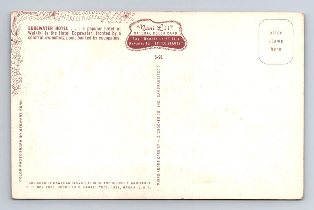Waikiki HI-Hawaii, Edgewater Hotel Advertising, Souvenir, Vintage Postcard
