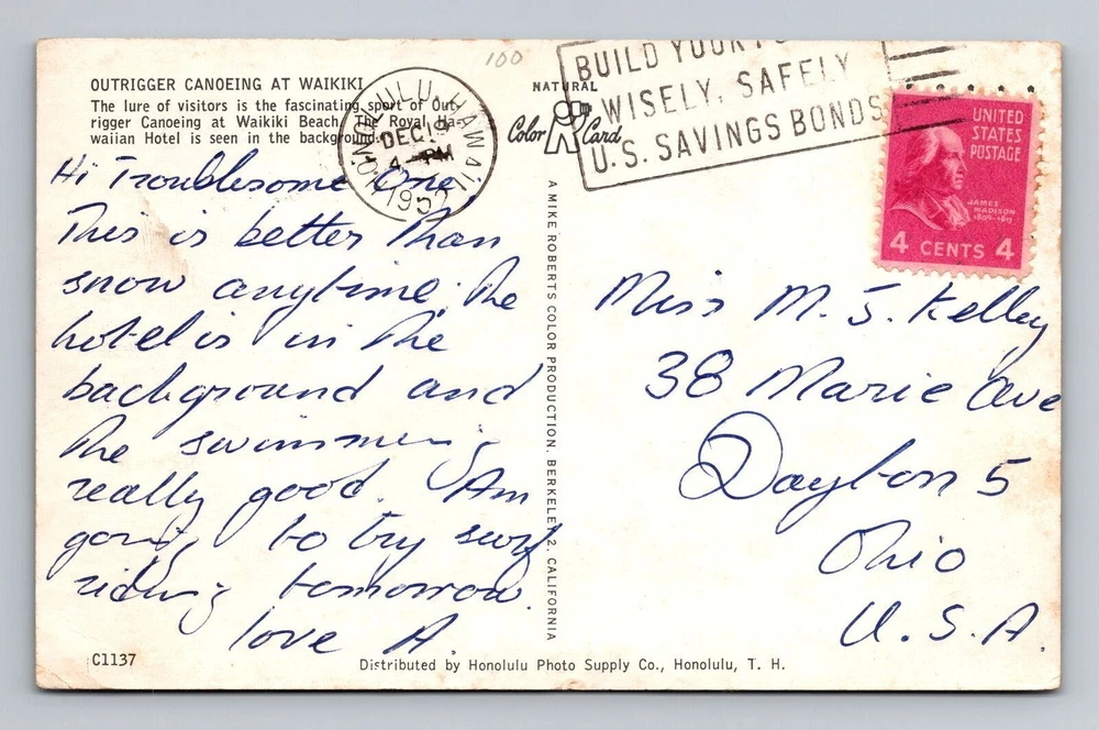 Waikiki HI-Hawaii, Outrigger Canoeing, Vintage c1952 Postcard