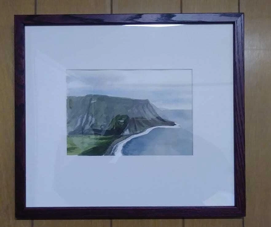 "Waipio Valley" original water color. Image and sheet size is 9" x 12", signed and dated 2018; Image depicts a view of Big Island, Hawai'i. Painting is matted and framed in cherry wood stained wooden frame measuring 14" x 16" and is ready to hang! I am a graduate of Carnegie Mellon University and have taught printmaking at the Pittsburgh Center for the Arts for over 25 years. I've exhibited at many galleries and museums throught Pennsylvania and nationally including the prestigious Print Center in Philadelphia, International Print Center New York, Washington Printmakers Gallery, Morgan Conservatory in Cleveland, Maryland Institute of Art, Dairy Barn Art Center, Hoyt Institute of Art, Art Association of Harrisburg, Philadelphia Museum of Art, Westmoreland Museum of American Art and others.