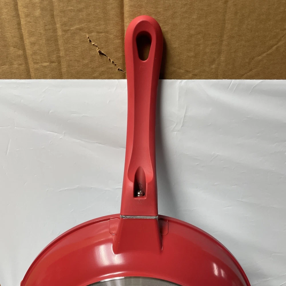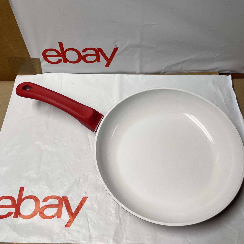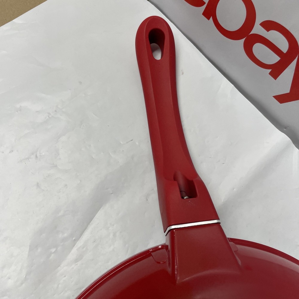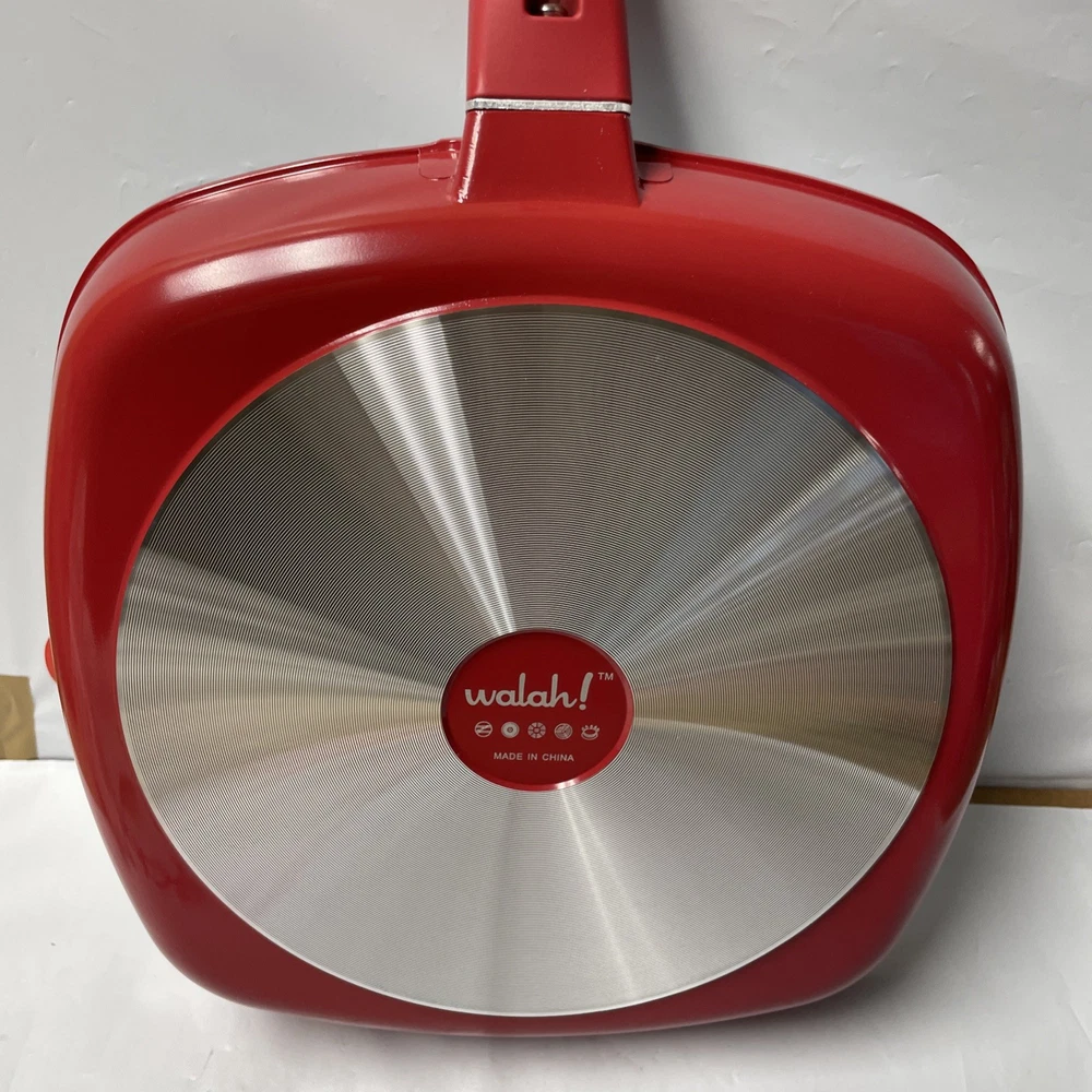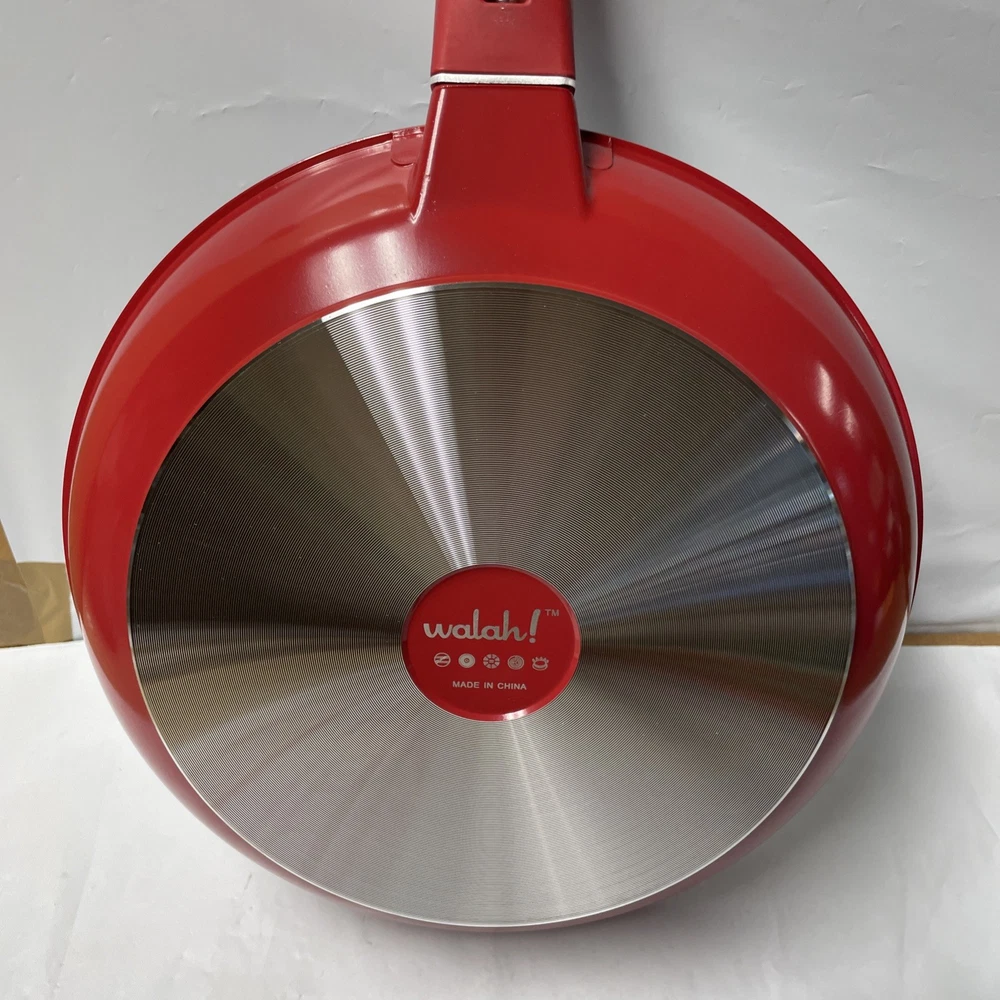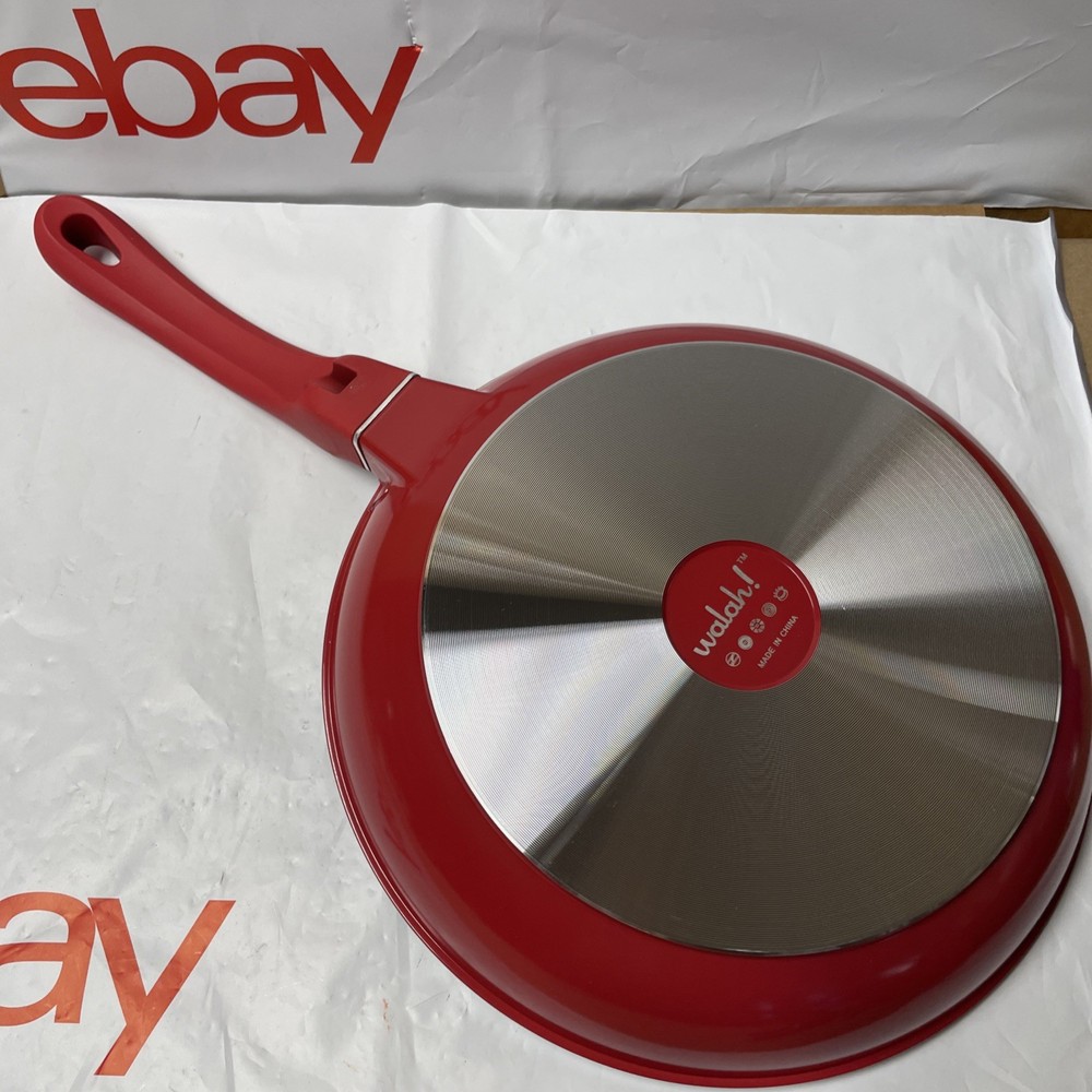 The Walah 10.5" Ceramic Nonstick Cooking Pan Set in red includes two pans suitable for use on induction, electric, and gas stoves. Made by Walah, the pans feature a ceramic non-stick surface coating for easy cooking and cleaning. The set is designed with a modern and stylish red color that adds a touch of elegance to any kitchen. Whether you're a home cook or a professional chef, this pan set is a practical and versatile addition to your cooking arsenal. Open box for clarity. See photos. 10.5” in diameter.