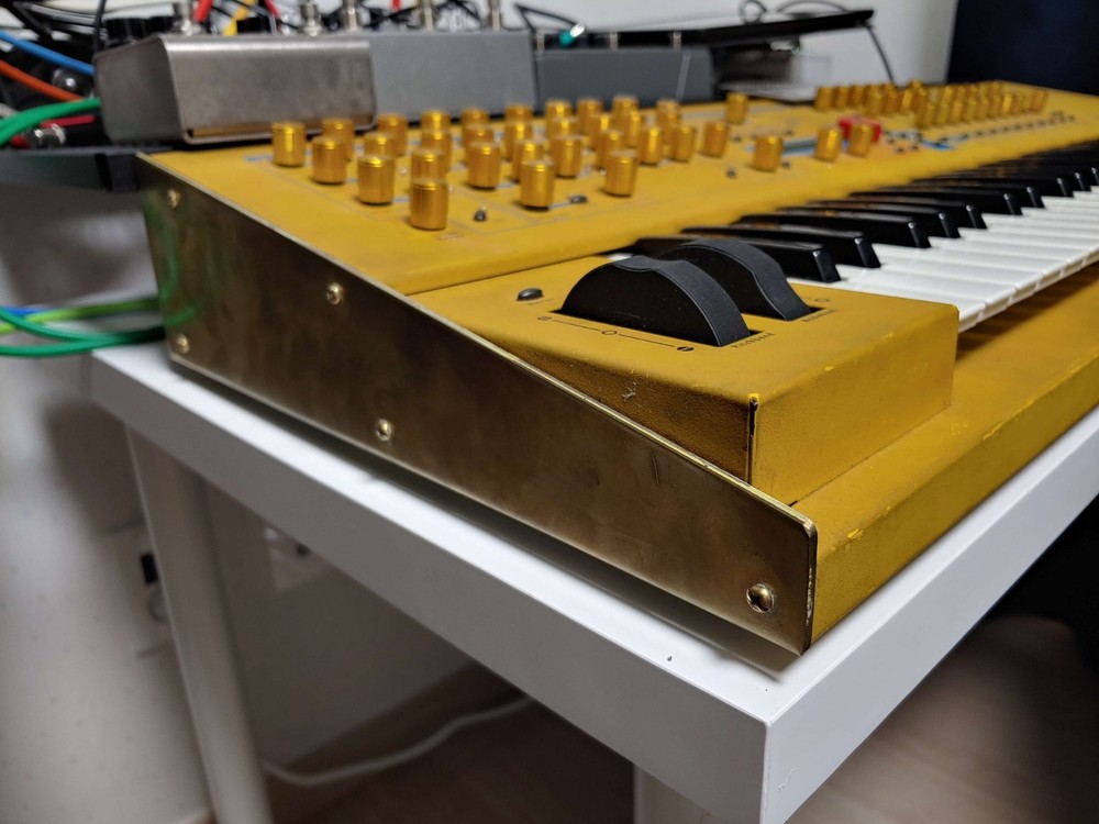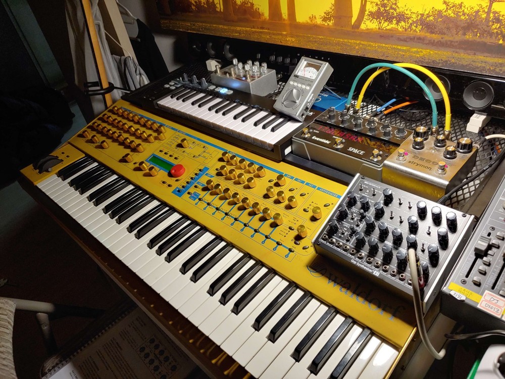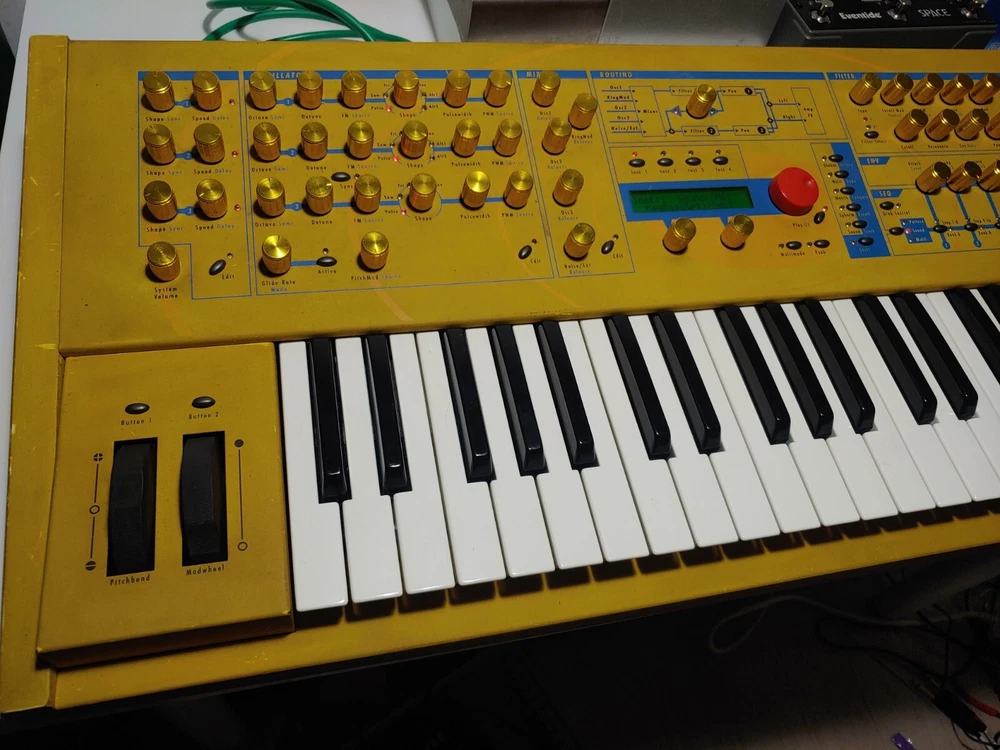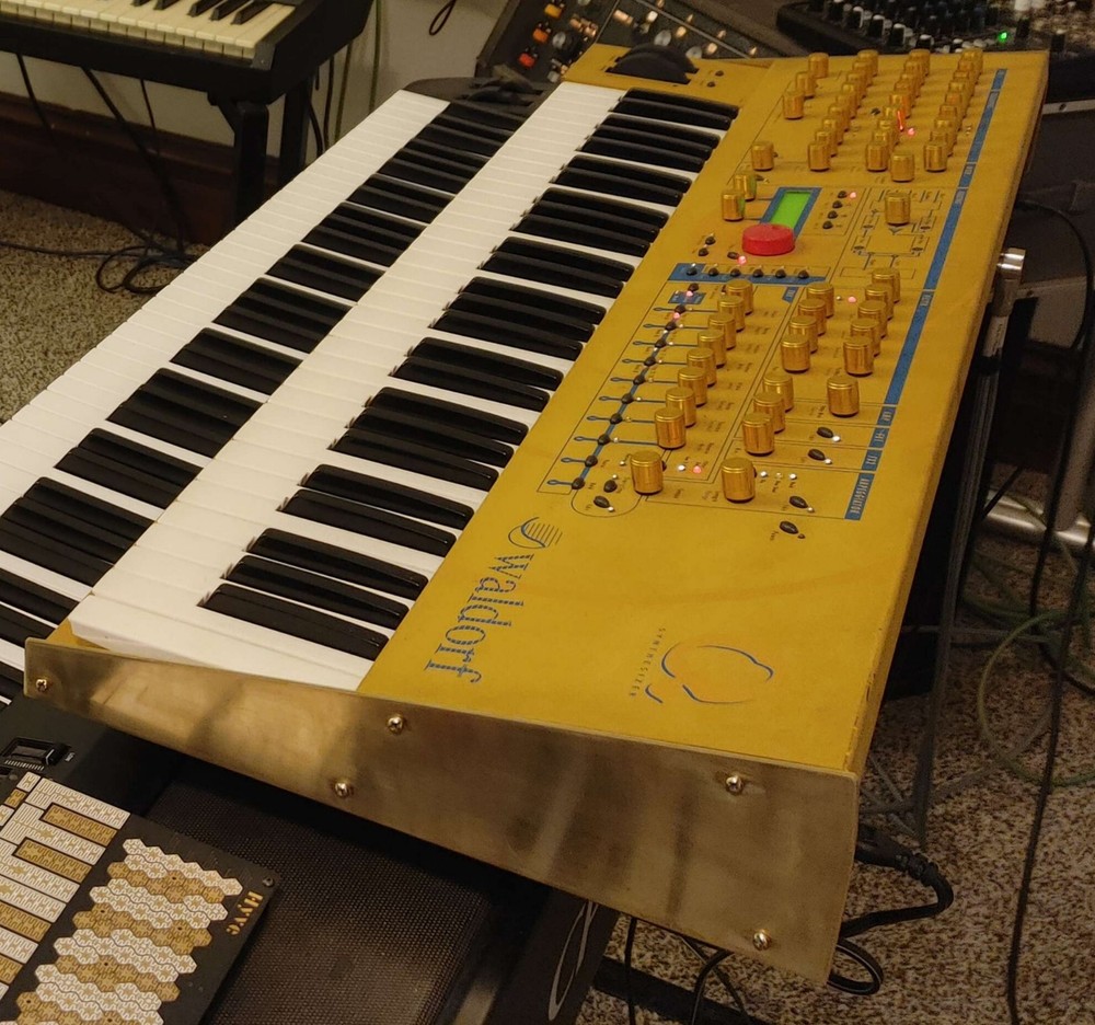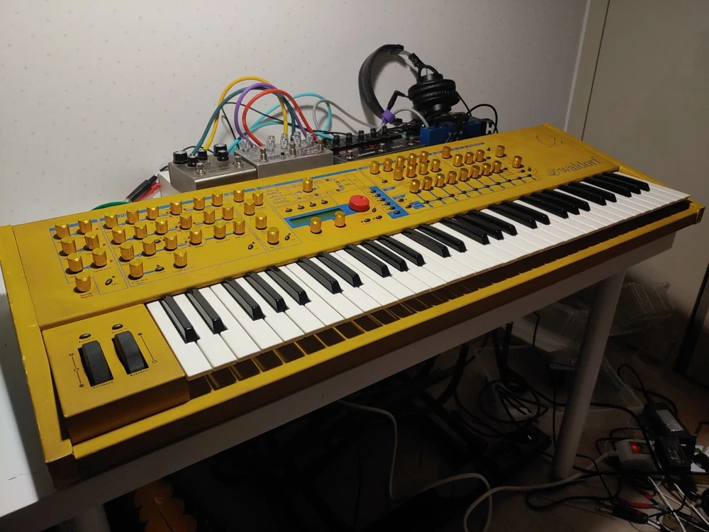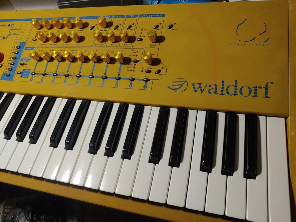 32 voice Waldorf Q in excellent condition for sale. *************************************************************************** -Features custom brass end panels. Original endblocks will be included, or reinstalled if you like. -Kept in smoke free environment, and well taken care of. -encoders restored 2024 -typical scuffs and wear on Nextel paint surface -knobs replaced by a previous owner -power supply replaced Feel free to ask any questions. My candid description: This classic German virtual analog synth from 1999 is a multi-timbral powerhouse with more golden yellow than your cheese drawer. While many virtual analog synths of the early 2000s were designed to emulate the sounds of analog synthesis, the Waldorf Q had more of its own distinct sound. What sets the Q apart for me in my own personal use, is that the 16 parts that can be arranged in layers or splits, each being assignable to one of the 3 separate stereo outs. It also has this xmorph feature that lets you morph one patch into another. You could have a sequenced percussion patch, an arp patch, and a lead patch all going to 3 separate effects chains to your mixer. The overall tone and character of this synth can vary greatly as it's very deep and flexible. It can easily go wild with squelchy digital madness, or just as easily you can program beautifully lush and smooth evolving pads. For me, I mainly use it for ethereal backdrops of ambient sound as well as leads. I also have plenty of fun with the supersaw patches and comb filters. I'm selling this synth to get a proper recording setup for recording my father's original music, something higher in priority at this time than keeping this awesome synth. Hope to sell it to someone who will enjoy it!