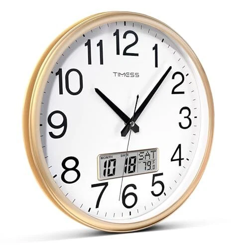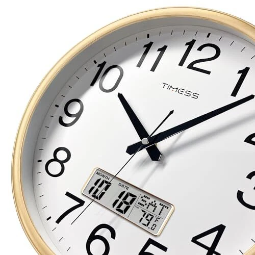 Return Policy Fast Delivery Trusted seller Wall Clock, 11 Inch Non-Ticking Silent Battery Operated Quartz Analog with LCD Display for Perpetual Calendar and F° Temperature, Ideal Modern Home, Bedroom, Kitchen, Office Décor (Gold) Product Description Perpetual Calendar & Temperature Display - Featuring large LCD screen with bold fonts for easy readability from a distance, it accurately displays real-time temperature in Fahrenheit & Month & Date & Weekly Calendar. The screen is independently powered from the clock mechanism, ensuring durability and reliable, long-lasting performance. Battery-Operated Precision Timekeeping - Featuring a high-quality quartz sweep movement, it maintains precise time, year after year. Its reliable mechanism ensures accuracy, making it an essential and trustworthy addition to any space. 2x AA carbon batteries required(not included). Easy to Read & Noise Free - This clock combines classic colors with bold, black numbers on a white background and clear 15-minute marks for visibility and style. Its smooth sweep movement ensures a quiet, tick-free operation, perfect for a peaceful work or relaxation space. Elegant Décor - Showcg a refined wood grain finish frame and a HD glass panel, it combines luxury & durability. The fade-resistant dial promises enduring elegance, rendering it a chic and low-maintenance accent for any room. Modern Design - With its contemporary and sleek design, this clock is ideal for various spaces, including bedrooms, living rooms, kitchens, dining areas, bathrooms, classrooms, and offices. Its universal appeal makes it a fantastic gift for family and friends, adding a touch of elegance and functionality to any room. Shipping Returns Payment Shipping Shipping is FREE to all addresses other than APO/PO boxes in the lower 48 states. All our stock ships from US-based warehouses. Shipped via USPS or UPS (depending on location and package weight) Unless stated otherwise, all orders will ship within 24-72 hours of your payment being processed. Check our feedback to see the great reviews of FAST shipping we offer. Returns Seller does not accept returns Payment We currently accept payment via eBay managed payments only. Once payment is cleared, we will dispatch your shipment within 1-3 business days. Please refer to the "Shipping" tab for more information regarding shipping speed to your destination.