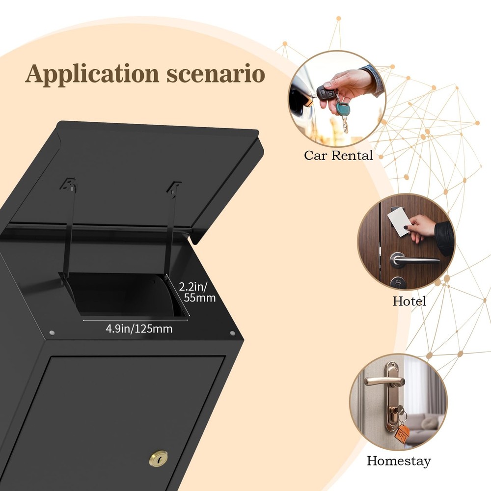 Well Made: The key drop box is 100% made of 0.6 mm cold rolled steel. When the lid is lifted, the circular roller underneath the drop slot will follow, and when the gap in the circular roller is exposed we can drop the key Waterproof Design: The key drop box door has a drain slot that allows it to be mounted on an unobstructed outdoor wall where water will not enter the box Wdie Scenarios: Ideal for after hours office, apartment complex, boat dealers, rental car agencies, car lots, body shops and more After-Sales Service: Please contact us by e-mail, the e-mail address in the APP--Account--about us to view