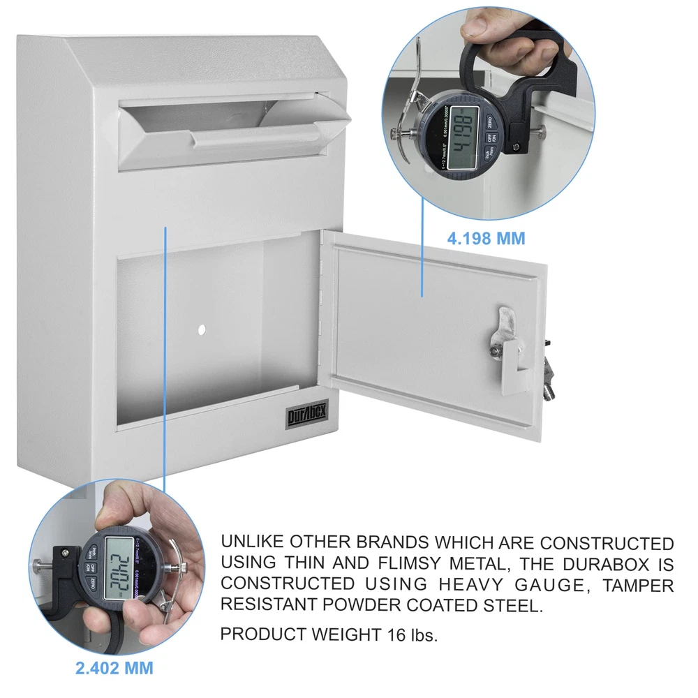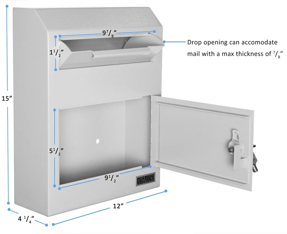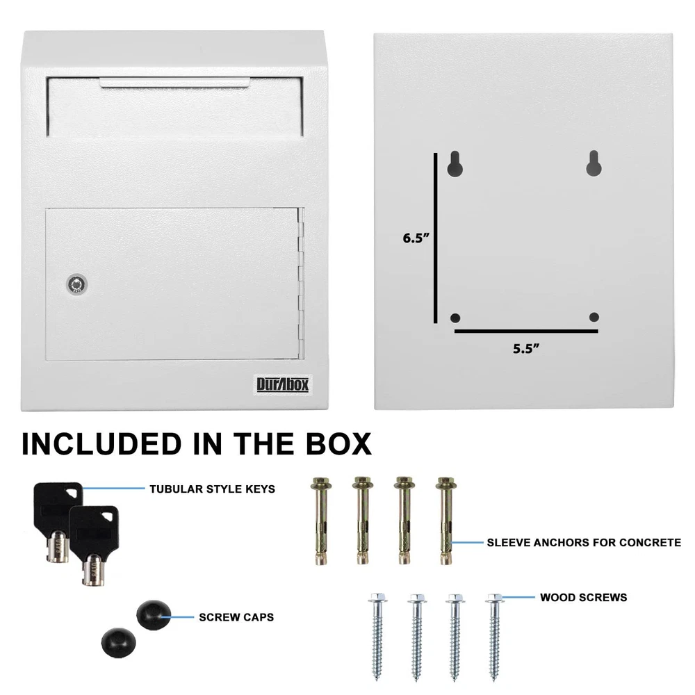 W500 wall-mount letter size drop box with tubular key provides secure all-day storage for valuable or private items like money, checks, car keys, and . Keep important things locked away and protected from theft. The perfect solution for when in-person exchanges become impractical or impossible; pick up items at your leisure. For indoor use only. The W500 wall-mount drop box features a piano hinge reinforced double steel door to prevent prying. Metal baffle inside the drop opening protects against fishing. Includes a pair of tubular keys that are harder to duplicate than standard keys for added . Features: Maximum thickness of drop items is 7/8" thick Piano hinge with reinforced double steel door protects against prying Tubular style key lock with Double "D" configuration (can be retrofitted with other cam locks) Drop opening thick enough to drop keys Recommended for inside use only Metal baffle protects drop opening from fishing 2 tubular keys Pre-drilled mounting holes in back (includes hardware for wood and concrete) Specifications: Exterior Dimensions: 15" H x 12" W x 4-1/4" D Collection Door Clearance: 5-1/4" H x 9-1/2" W Deposit Slot Opening: 1-1/2" H x 9-3/8" W Deposit Drop Opening: 7/8" Door Thickness: 1/8" Capacity: 496 cu in. Weight: 16 lbs : 1 Year QUALITY DESIGN – Durable steel construction provides secure all-day depositing of valuables or private items such as cash, checks, car keys, remotes, small envelopes, and more. Made from 14-gauge scratch and rust resistant -coated steel. Perfect for daily residential and commercial use SECURE – Comes with a tubular style key lock and 2 keys that are difficult to copy. The baffle prevents fishing from the drop-slot, and a continuous piano hinge on the retrieval door prevents prying. Keep your packages and organized and secure MOUNTING HARDWARE INCLUDED - Designed to be mounted on a wall. Includes mounting hardware for wood and concrete EFFICIENT DESIGN - The deposit slot opening is 9-3/8" wide and accommodates items up to 7/8" thick. This unit is not ideal for receiving large items such as books, magazines, catalogs, manila envelopes, and other larger because of the anti-phishing baffle DIMENSIONS - Exterior dimensions: 15" H x 12" W x 4-1/4" D. Retrieval door clearance of 5-1/4" H x 9-1/2" W. Product weight 16 lbs