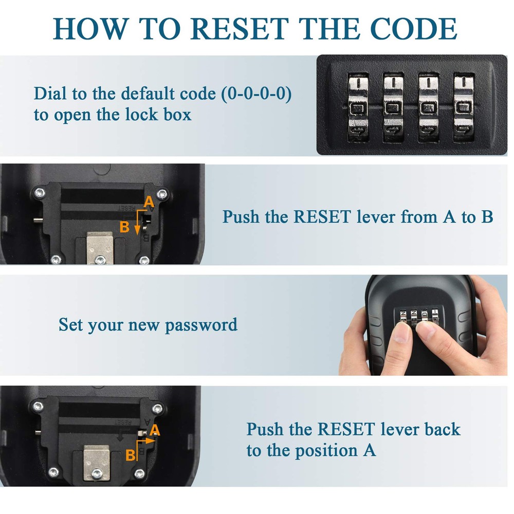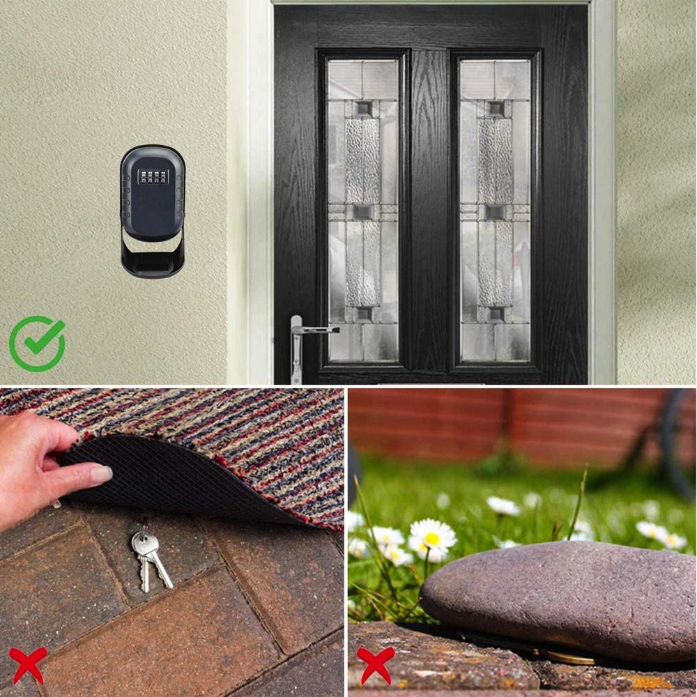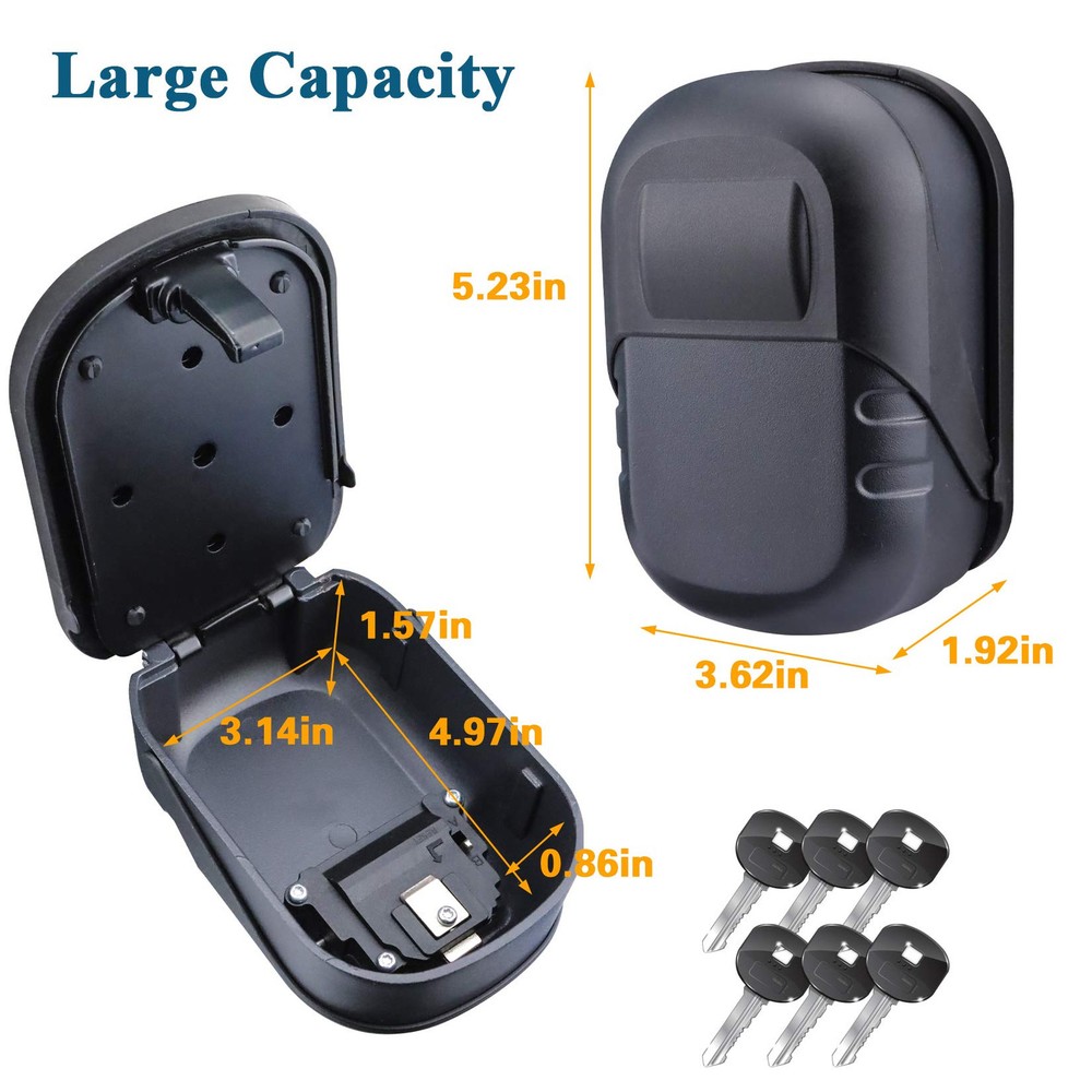 LARGE CAPACITY LOCK BOX: With a huge inside, our key lock box can hold more than 5 keys and credit cards at the same time, it also can car key and USB thumb drives. WEATHERPROOF KEY BOX: The lockbox built with rustproof alloy and a detachable waterproof cover, our key lock box has an excellent weather resistance, it is secure hide a key outside the door wall. STURDY SURFACE KEY HIDERS OUTSIDE: Made of high-quality alloy material, the surface of the wall mounted key box is solid and safe enough, it is a good lock box for keys with code. 4-DIGITAL COMBINATION KEY LOCK: The lock box for keys with code is equipped with a 4-digital combination, easy to remember and provides about 10,000 personalized passcodes to ensure of key box. EASY WALL MOUNTED LOCK BOX FOR KEYS OUTDOOR: Come with 4 screws and 4 expansion plugs, the combination key lock box for outside can be mounted easily and well attached strongly in place.