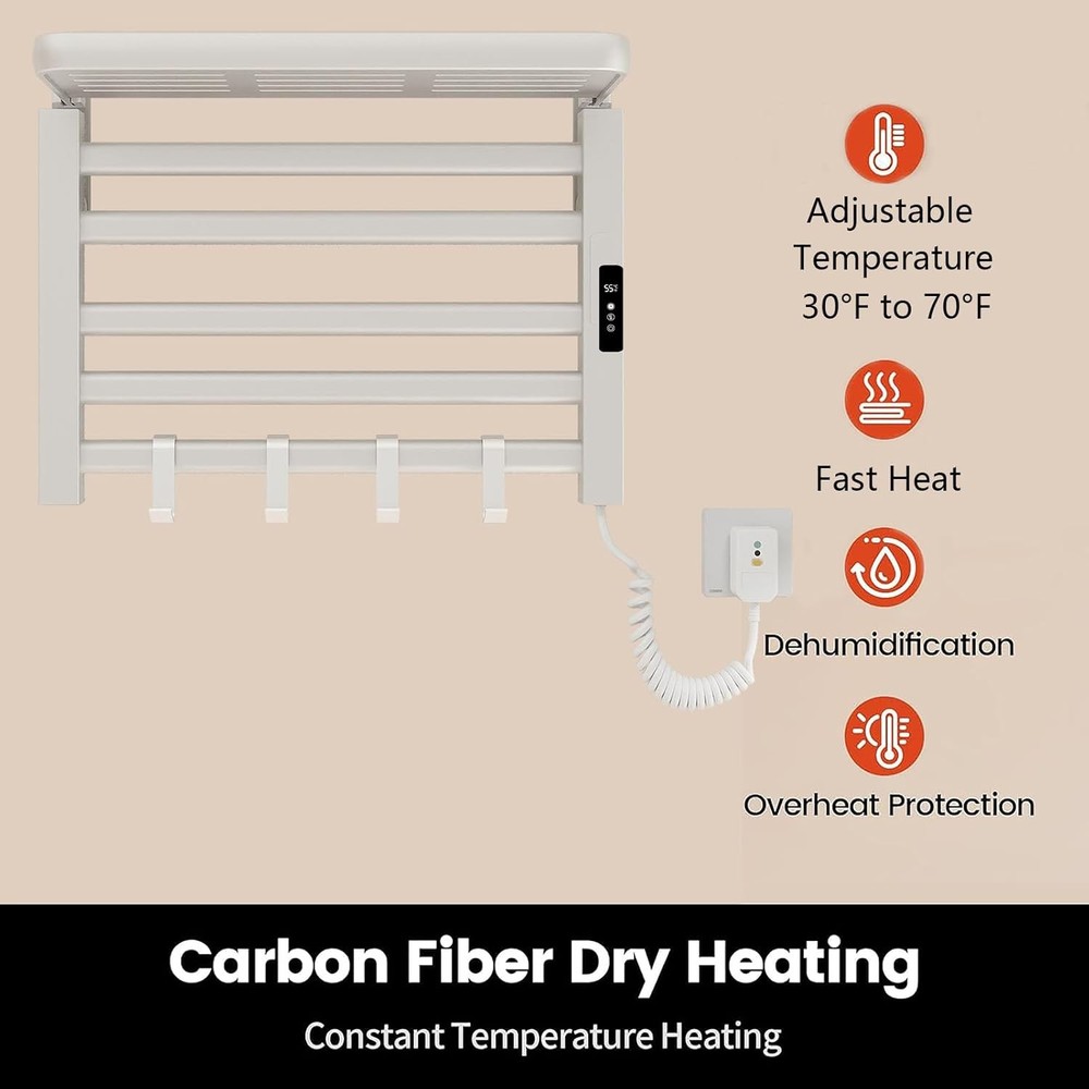 Xrrxy Wall Mounted Heated Towel Rack for Bathroom, IPX5 Waterproof White Product Details Product Dimensions: 8.66 x 21.65 x 15.75 inches Item Weight: 6.16 pounds Manufacturer: Xrrxy Country of Origin: China Item model number: 66338430-WHITE Color: White Brand: Xrrxy Shape: Square Item Weight: 2.8 Kilograms Advanced Towel Warmer Rack:Our wall mounted towel warmer constructed from robust aluminum alloy with IPV5 waterproof design, The built in thermostat ensures secure temperature control for optimal energy efficienc. Smart Touchscreen Control : The user-friendly touchscreen allows effortless customization of the heating experience. One key switch, Adjust the temperature from 30° to 70°, with the freedom to choose heating times from 1 to 9 hours, bidding farewell to cold, damp towels Design Concept: The rack is designed to quickly dry towels while maintaining warm temperatures. Available in 3 Color (Black , Gray , White), it meets the needs of different family sizes. The style is classic and suitable for modern bathrooms and any space requiring towel drying. Special Notice: This product is designed for drying and mild warming. Meaning it can efficiently drying towels and maintaining towels at warm temperatures. Please note that it is not designed to make towels reach very hot temperatures like towel warmer bucket can get. Easy Installation:Install in minutes—no drilling or professional help needed! Enjoy hassle-free setup with our innovative, tool-free design.
